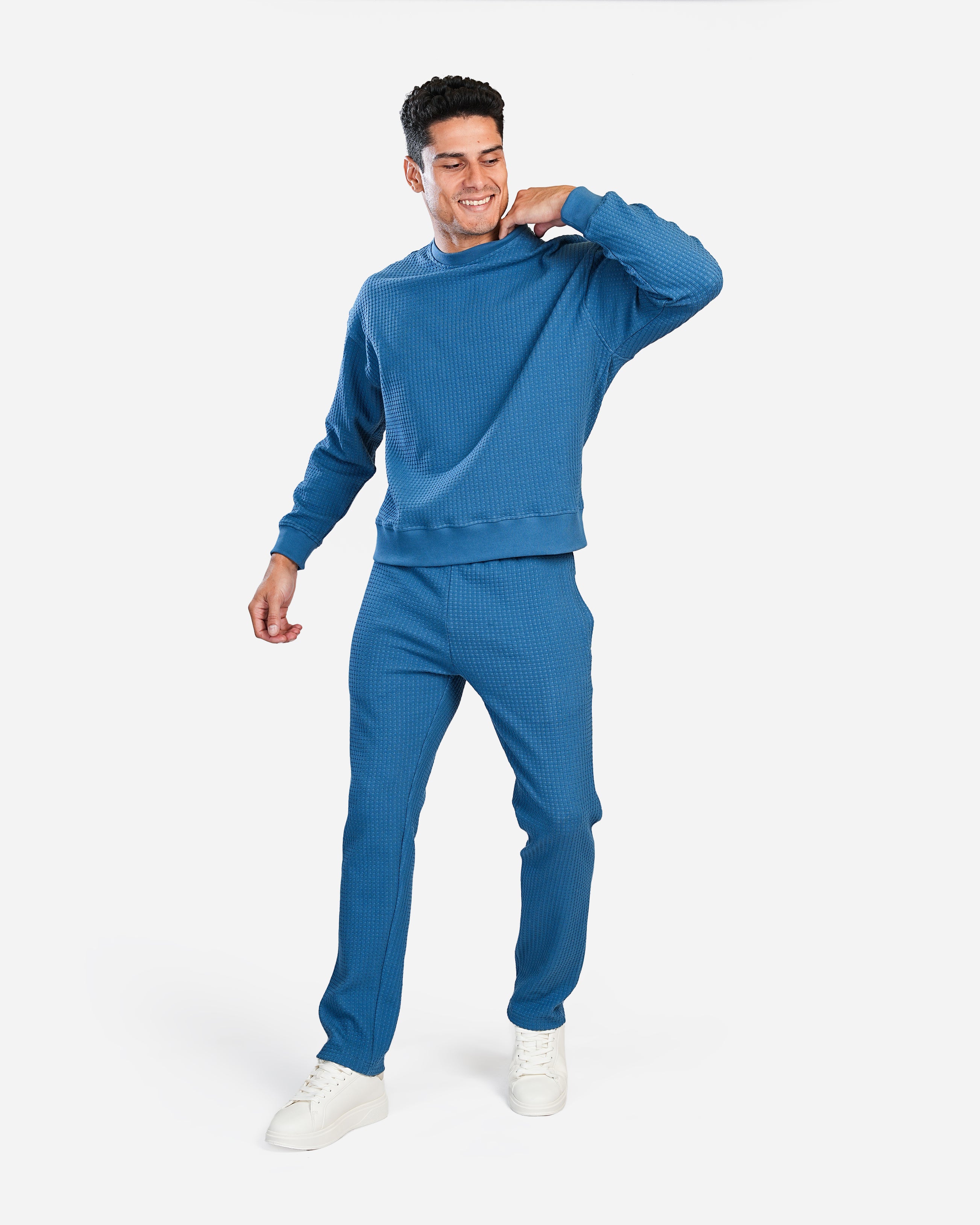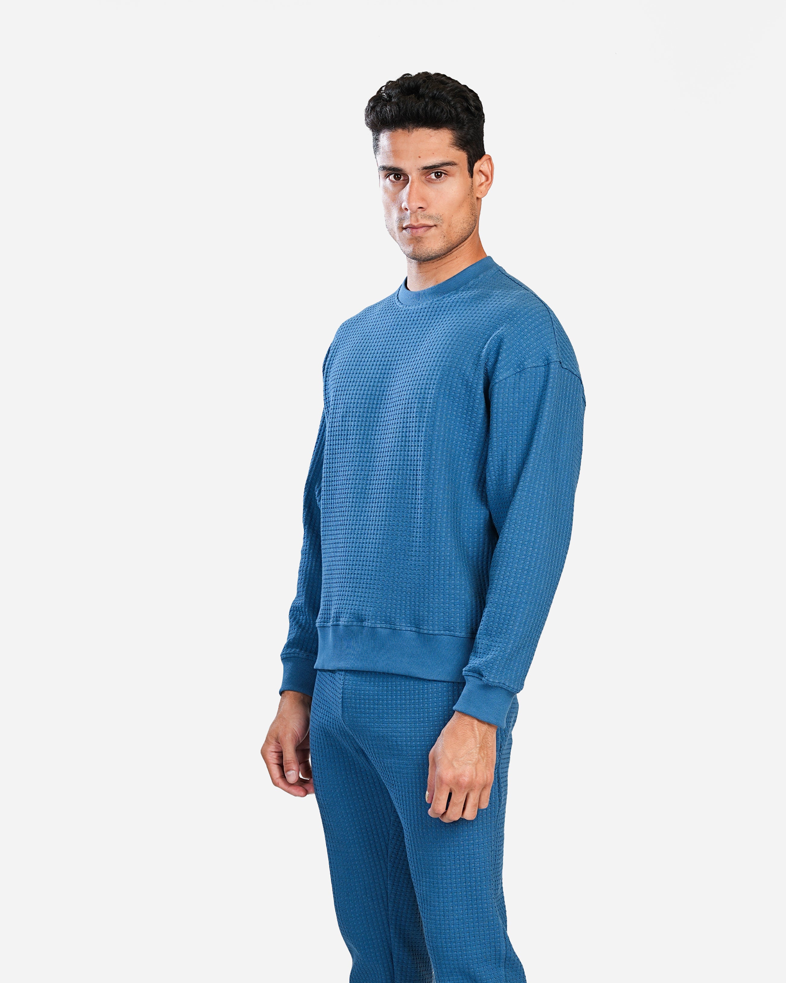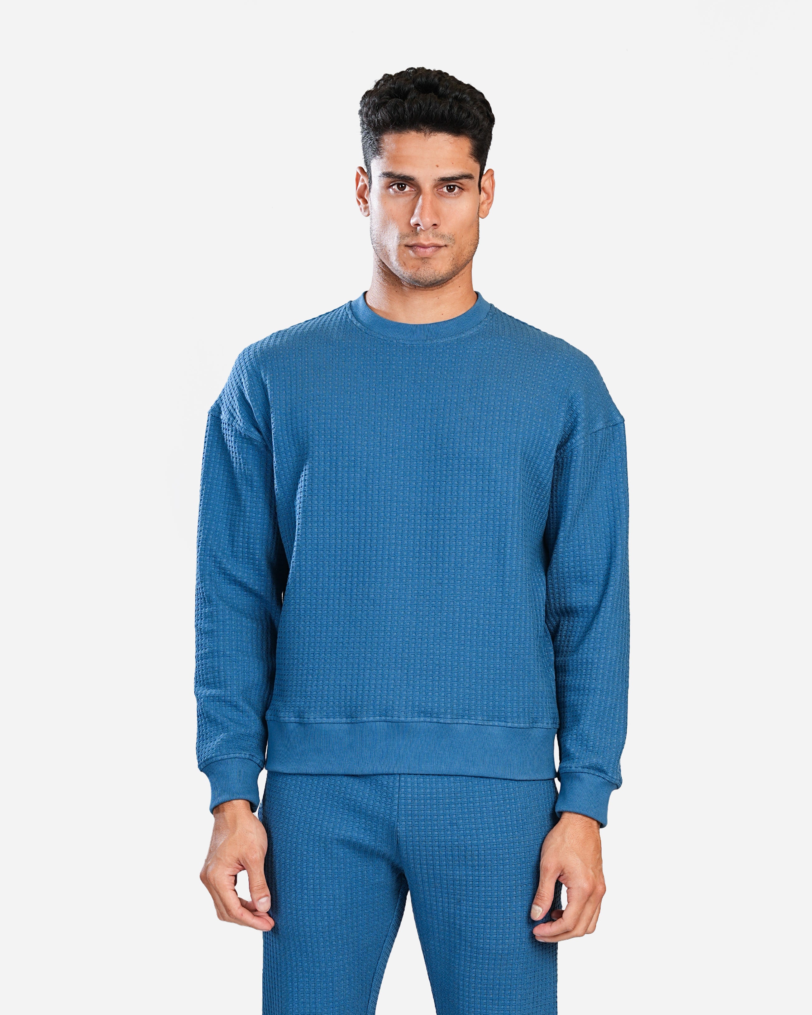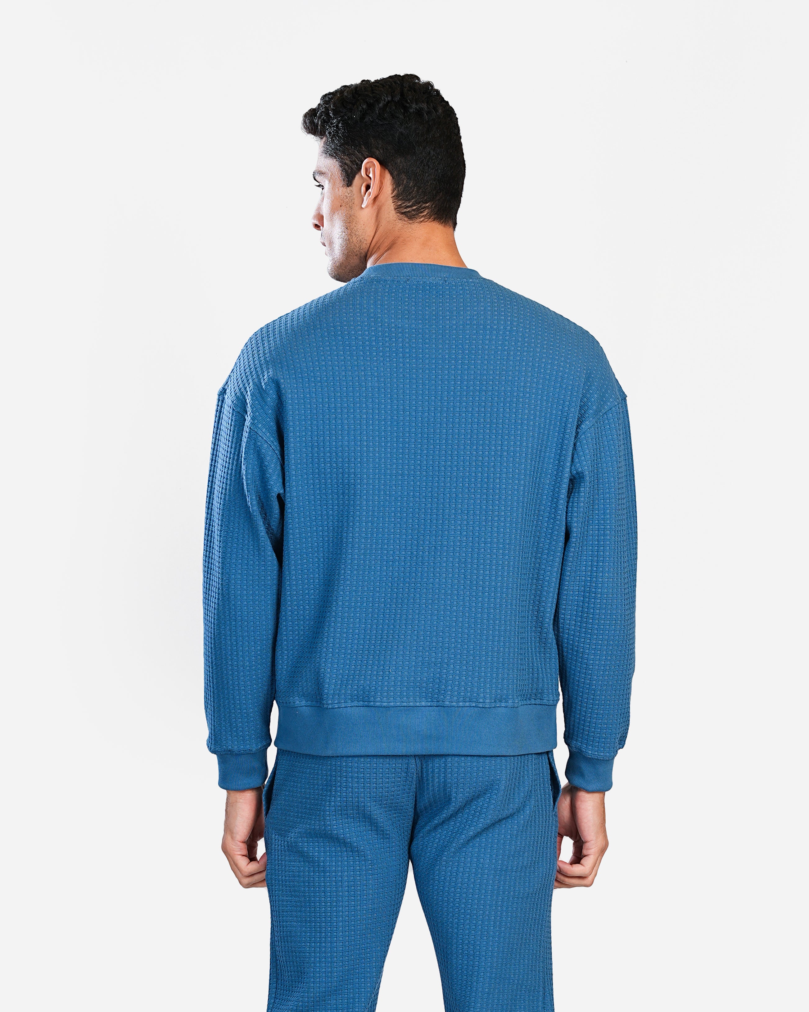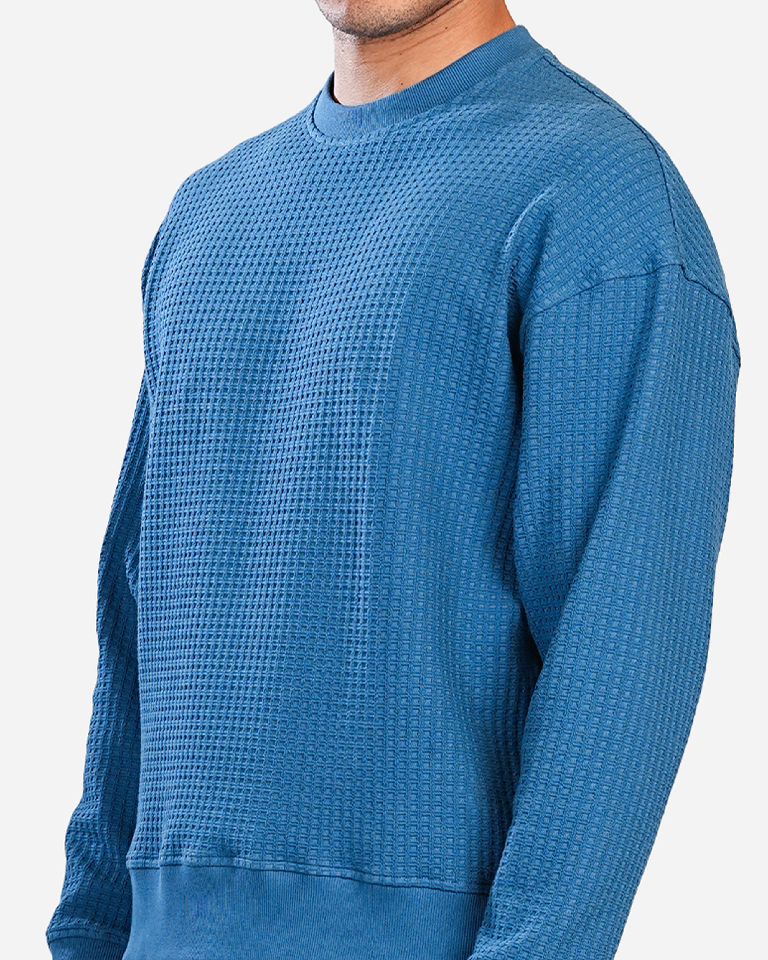 The sweatshirt is a round-neck design with a textured waffle pattern. It features a relaxed fit with a slightly dropped shoulder for a casual vibe. It is a blue color and features ribbed cuffs and a ribbed hem. The overall look is casual and comfortable, suitable for everyday wear.