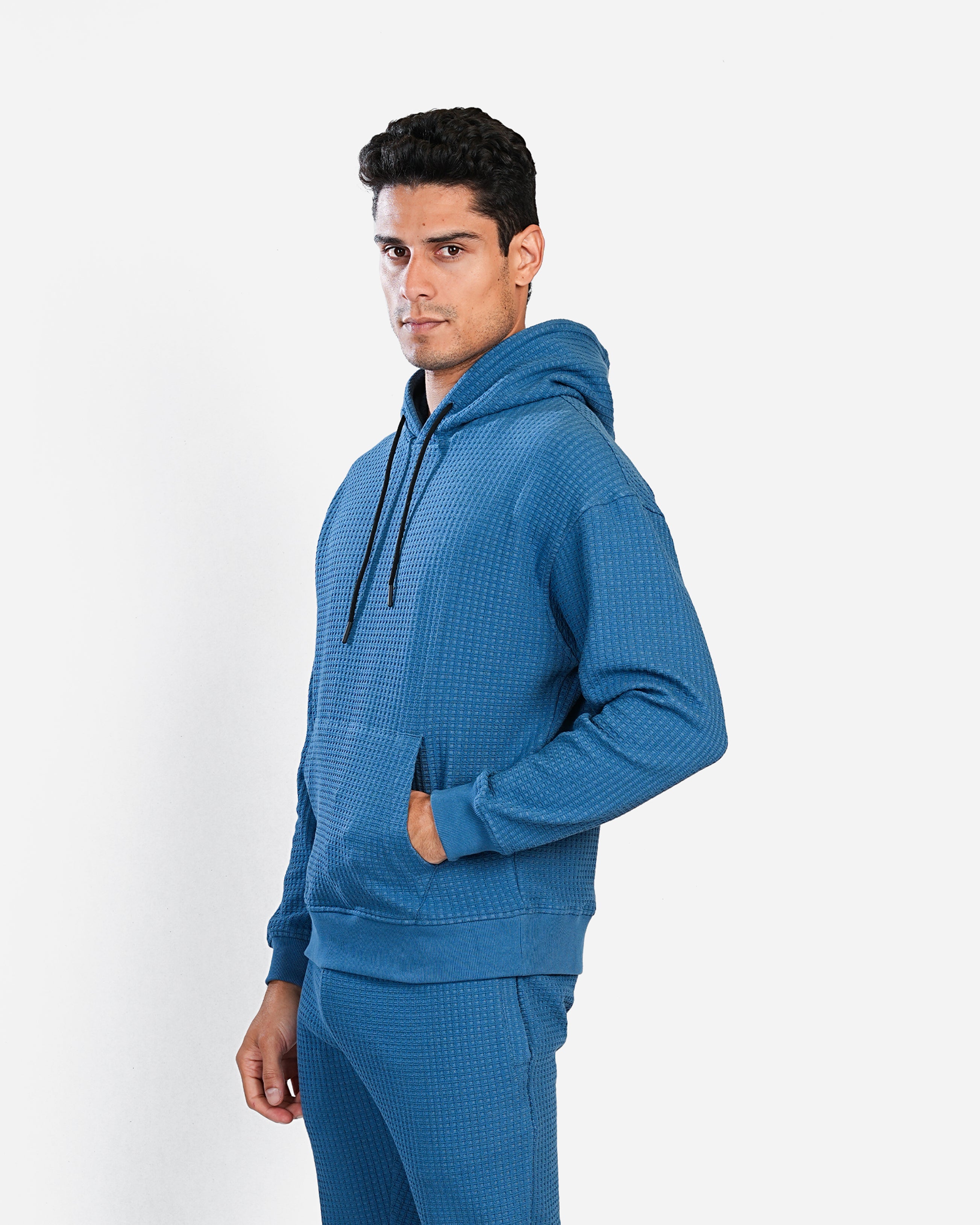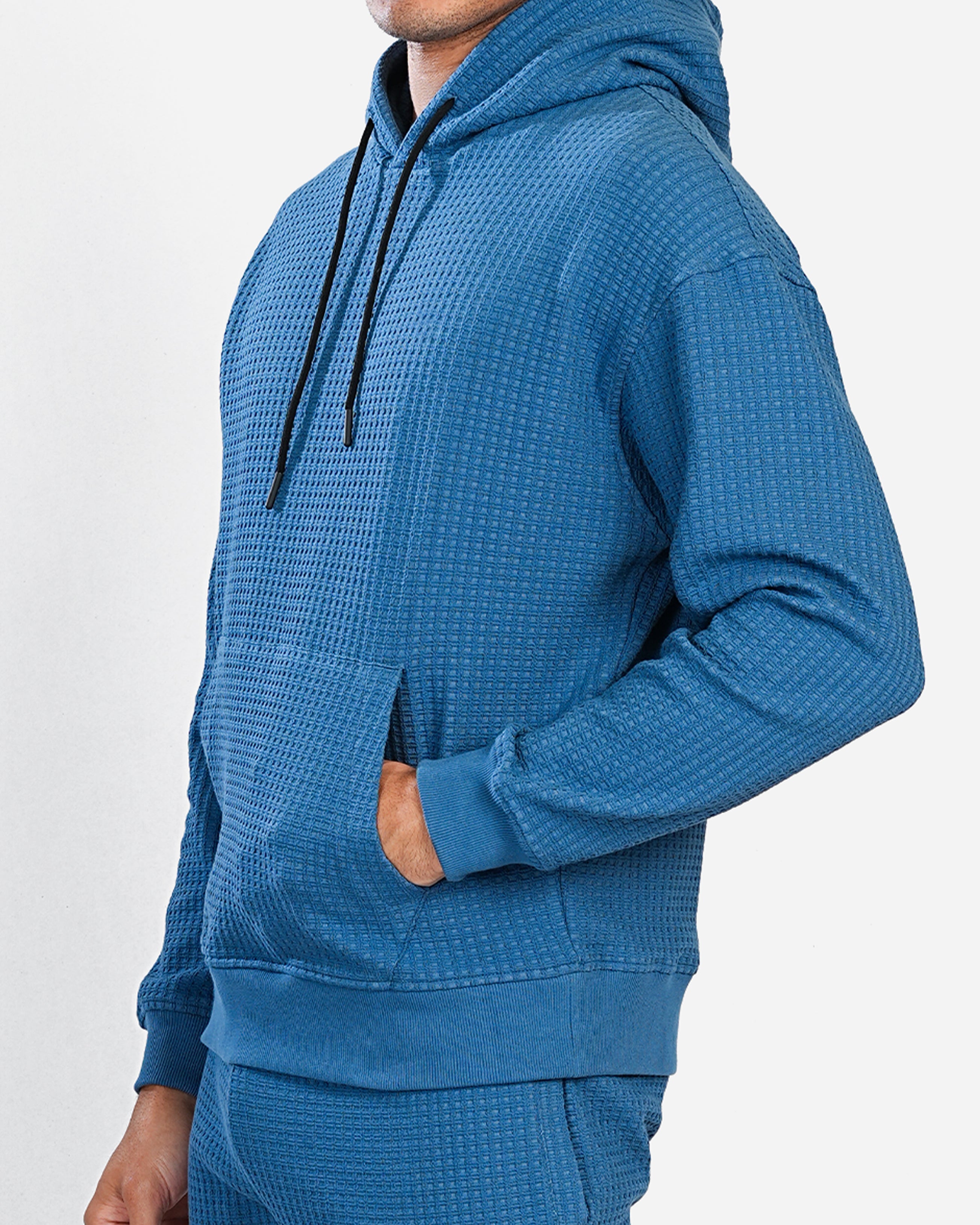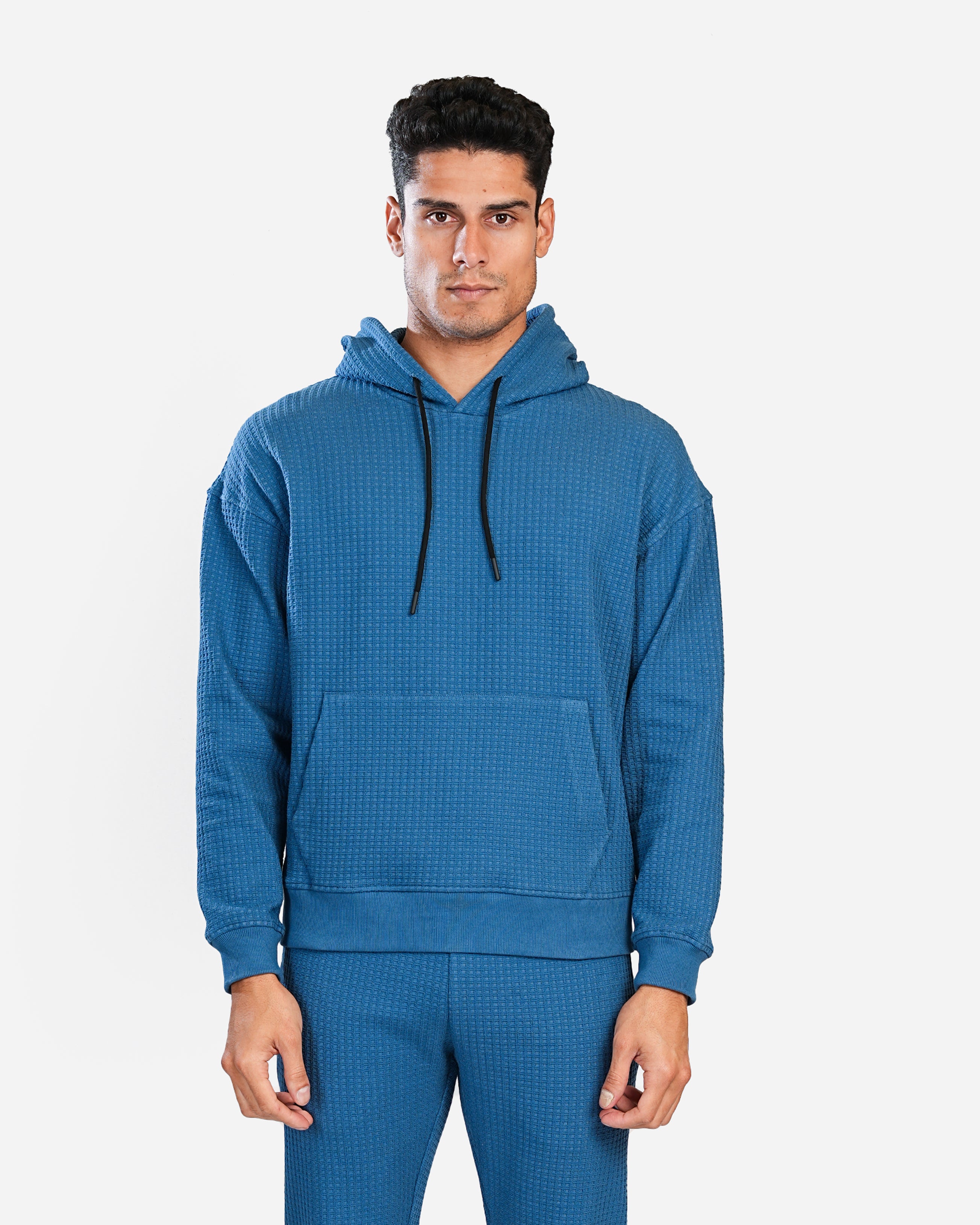 This hoodie is crafted in a comfortable, textured waffle-knit fabric, giving it a stylish and modern look. It features a relaxed fit with a slightly dropped shoulder for a casual vibe. The deep blue color provides a sleek appearance, while the black drawstrings on the hood add a subtle contrast. It has a classic kangaroo pocket at the front, perfect for keeping hands warm or storing small essentials. Ribbed cuffs and hem provide a snug fit, making this hoodie ideal for both lounging and layering on cooler days. Paired with matching joggers, it offers a cohesive and effortlessly put-together look.