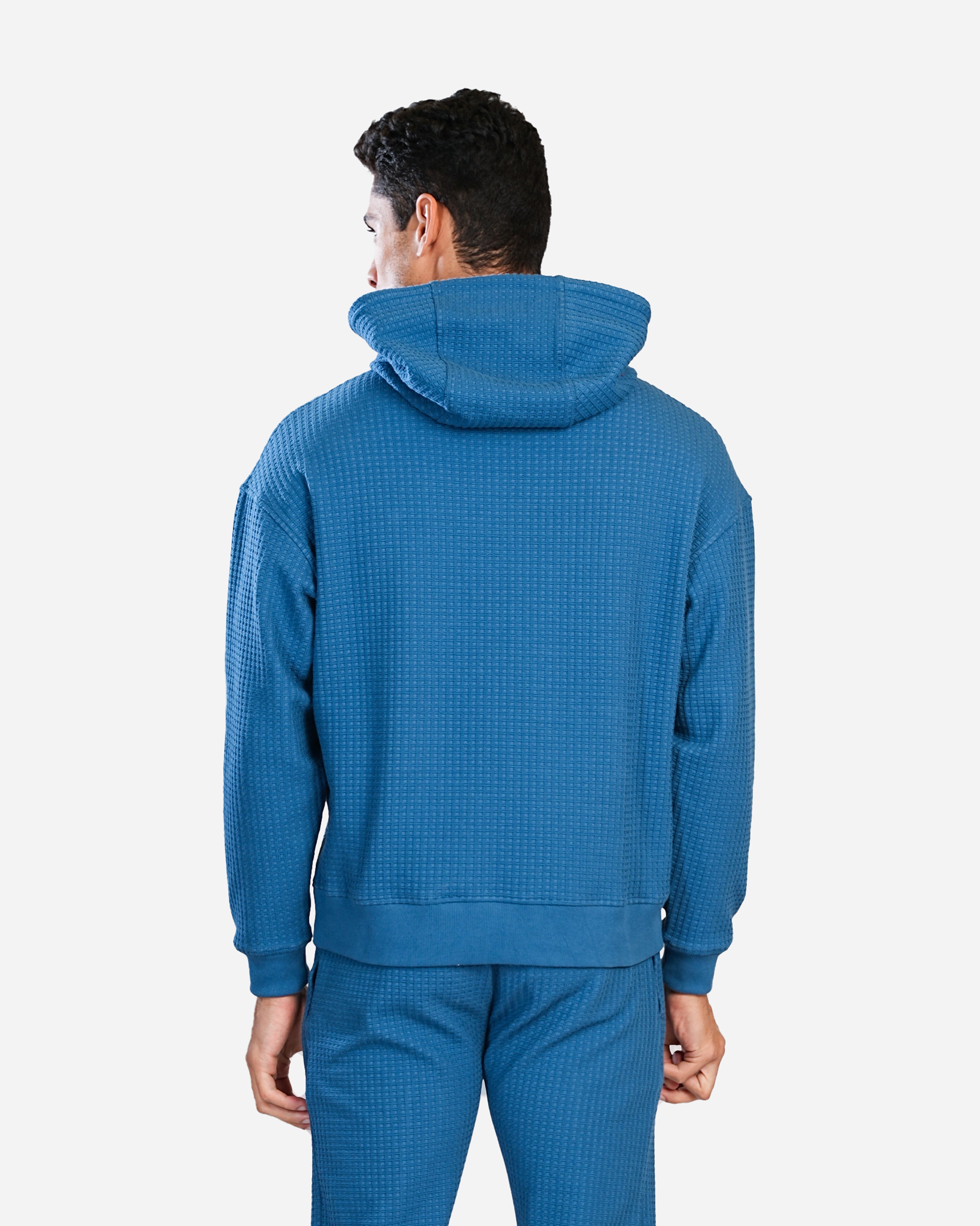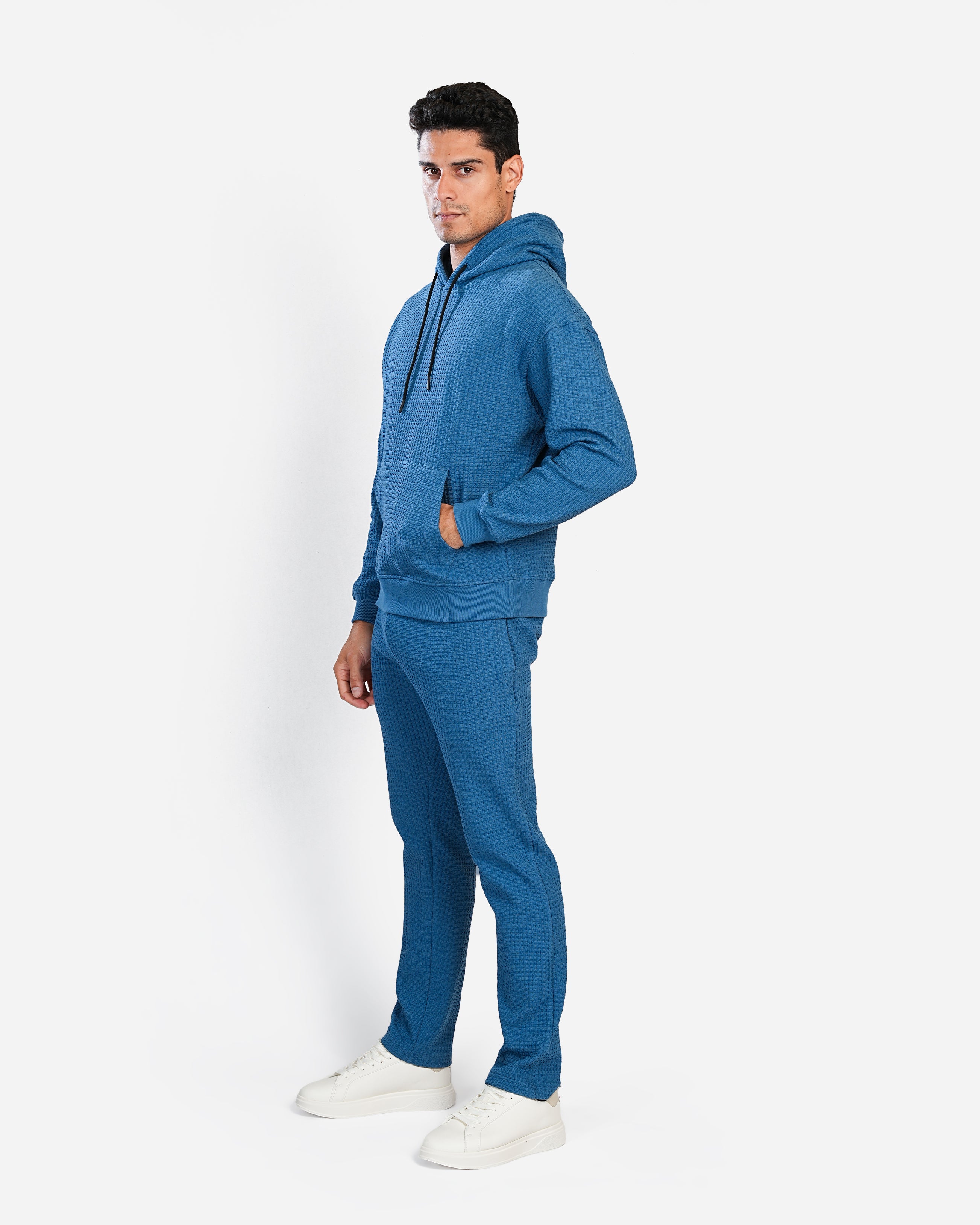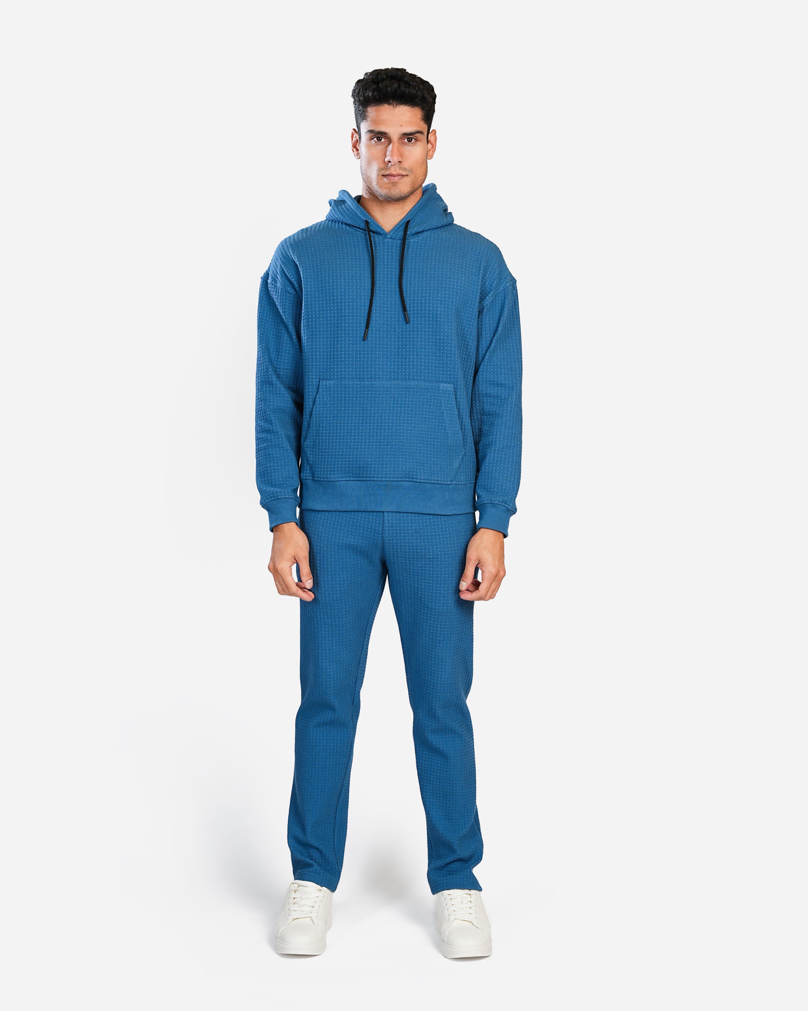 This hoodie is crafted in a comfortable, textured waffle-knit fabric, giving it a stylish and modern look. It features a relaxed fit with a slightly dropped shoulder for a casual vibe. The deep blue color provides a sleek appearance, while the black drawstrings on the hood add a subtle contrast. It has a classic kangaroo pocket at the front, perfect for keeping hands warm or storing small essentials. Ribbed cuffs and hem provide a snug fit, making this hoodie ideal for both lounging and layering on cooler days. Paired with matching joggers, it offers a cohesive and effortlessly put-together look.