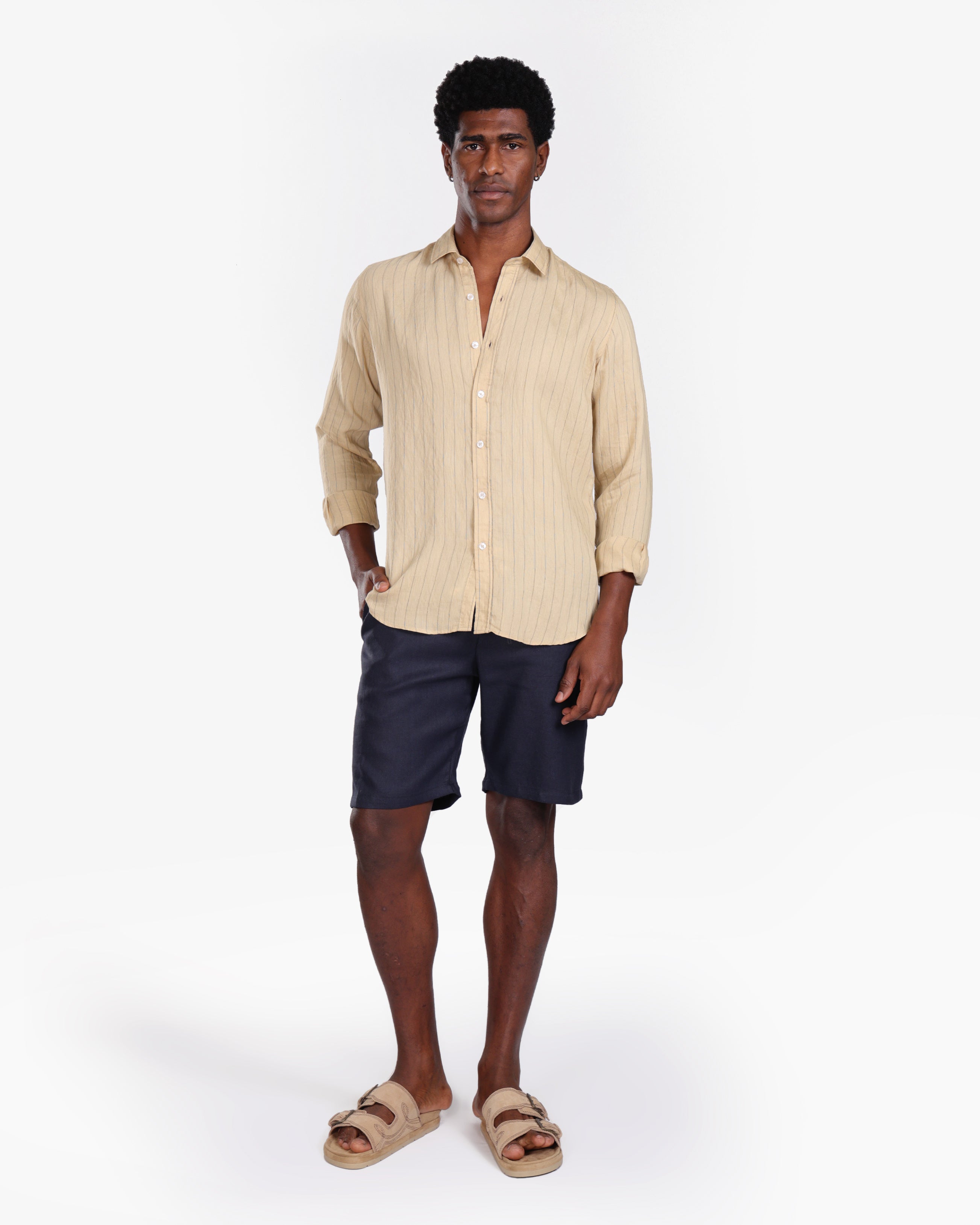 This essential shirt combines timeless pinstripe styling with the natural comfort of linen, making it a versatile addition to any thoughtfully curated warm-weather wardrobe.