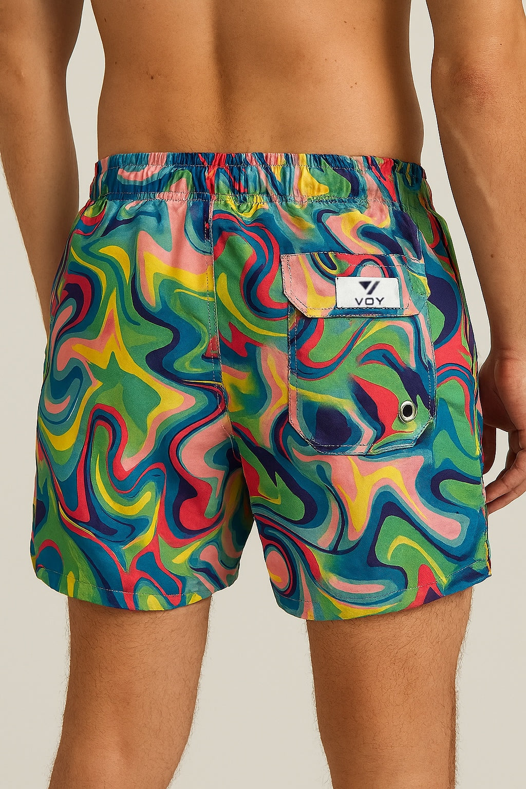 Dive into summer with these Psychedelic Swirl Swim Trunks, featuring a bold, eye-catching design with vibrant, swirling patterns in shades of green, blue, pink, and yellow. Key features include:
