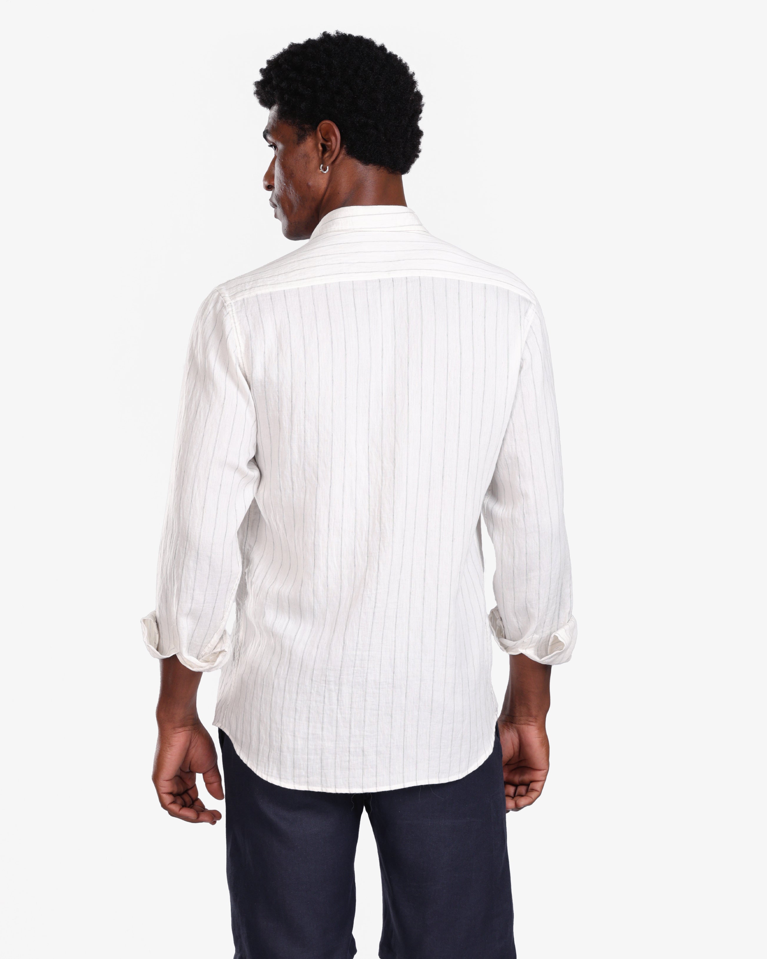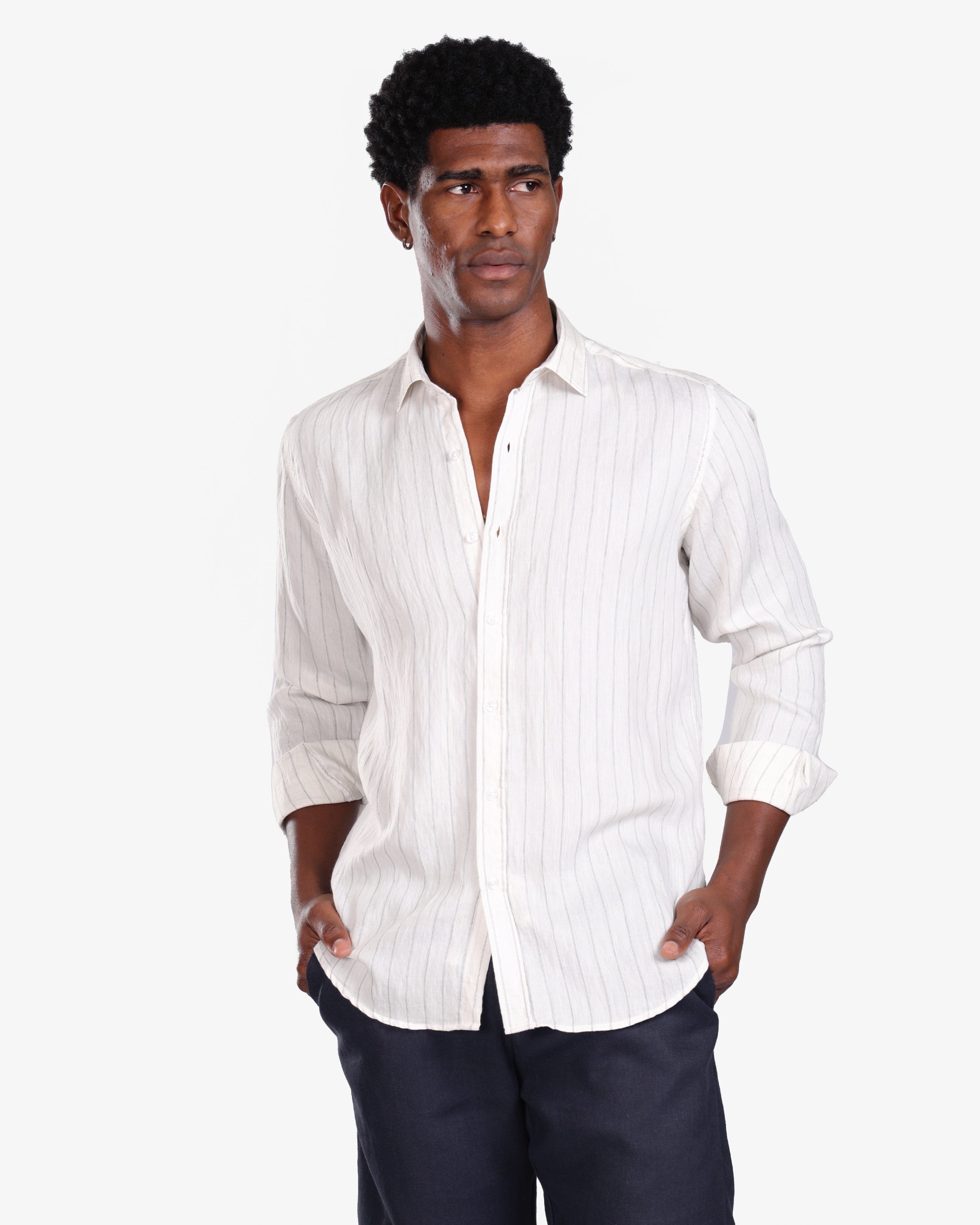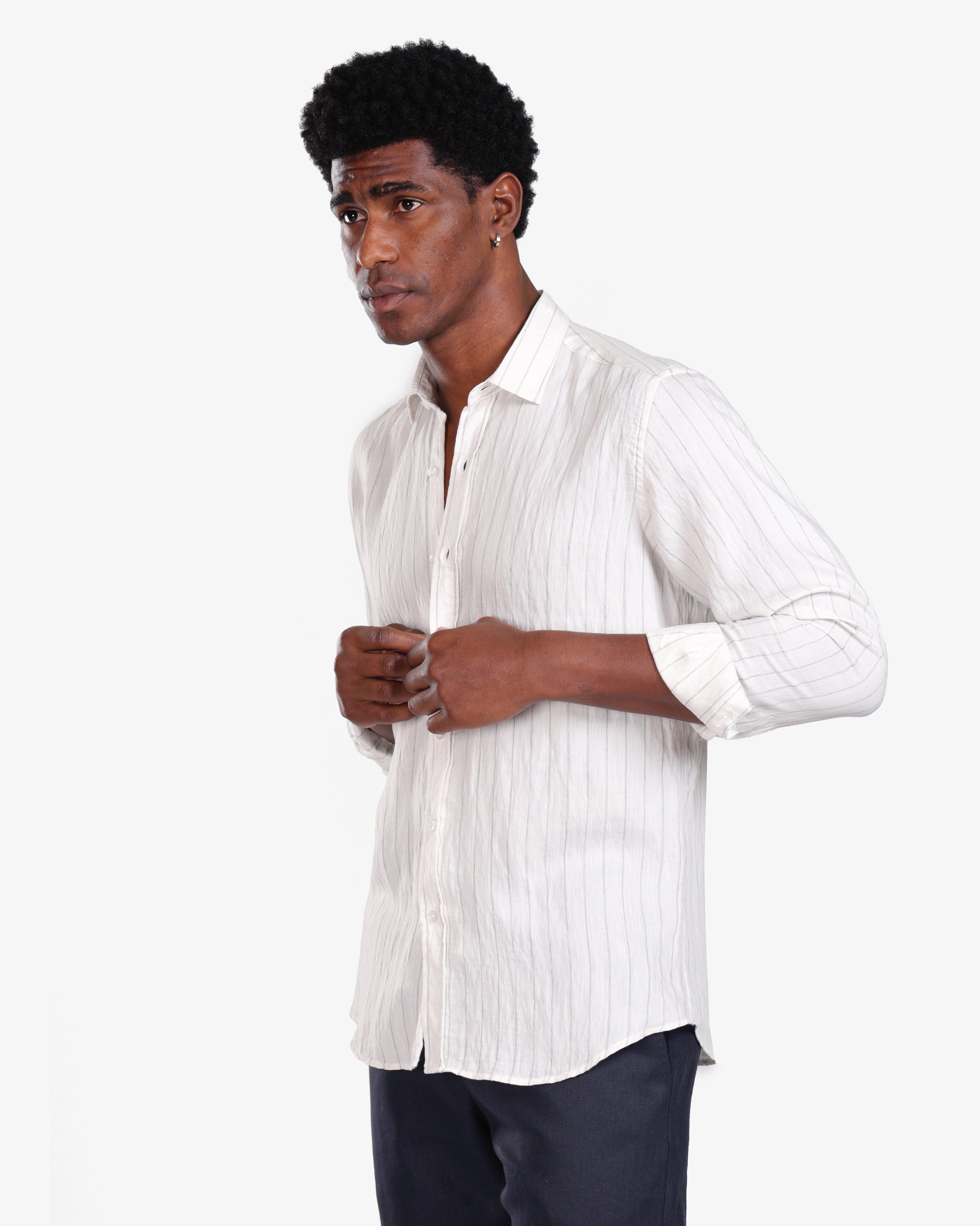 This pinstripe linen shirt combines classic elegance with contemporary comfort. Key features include: