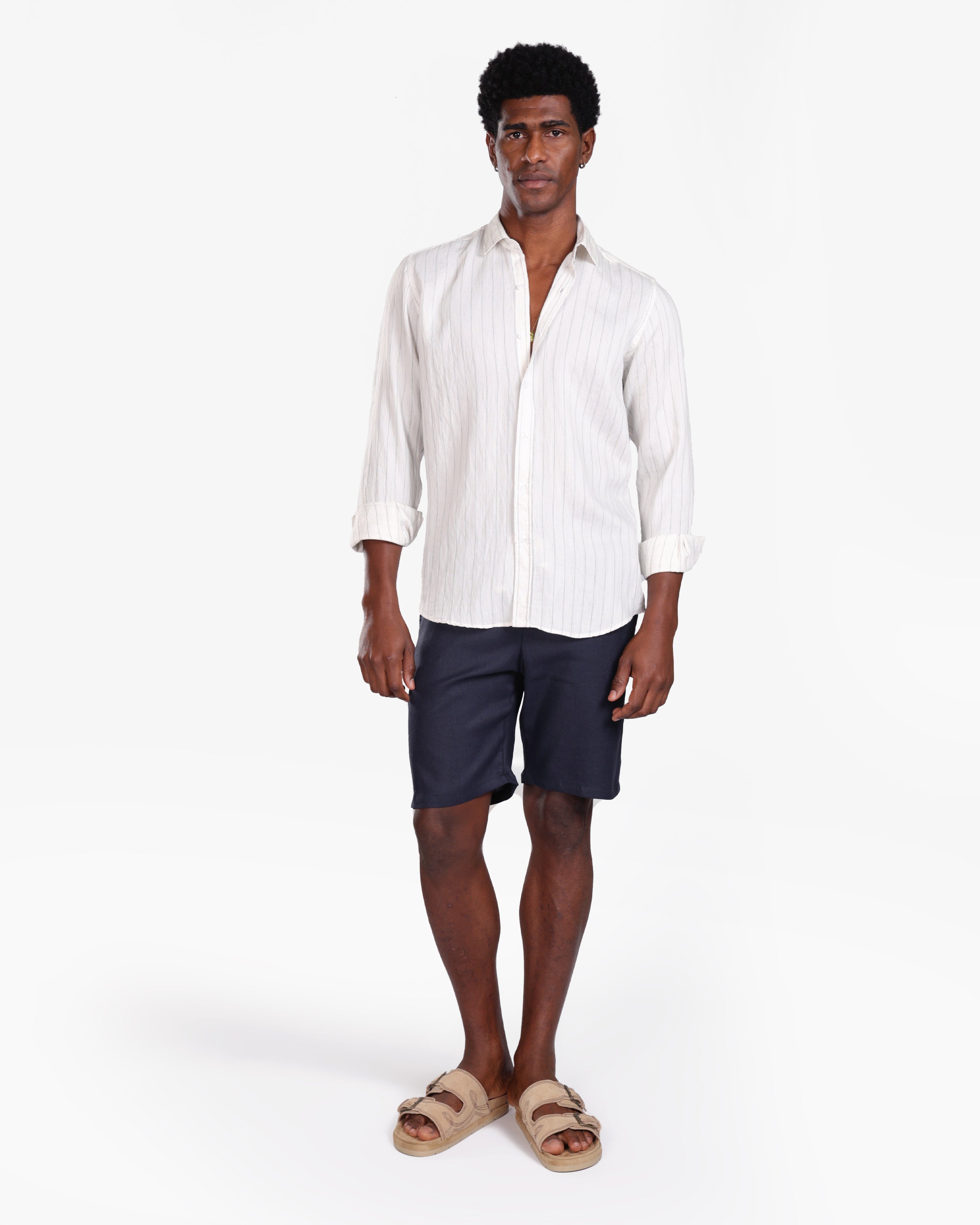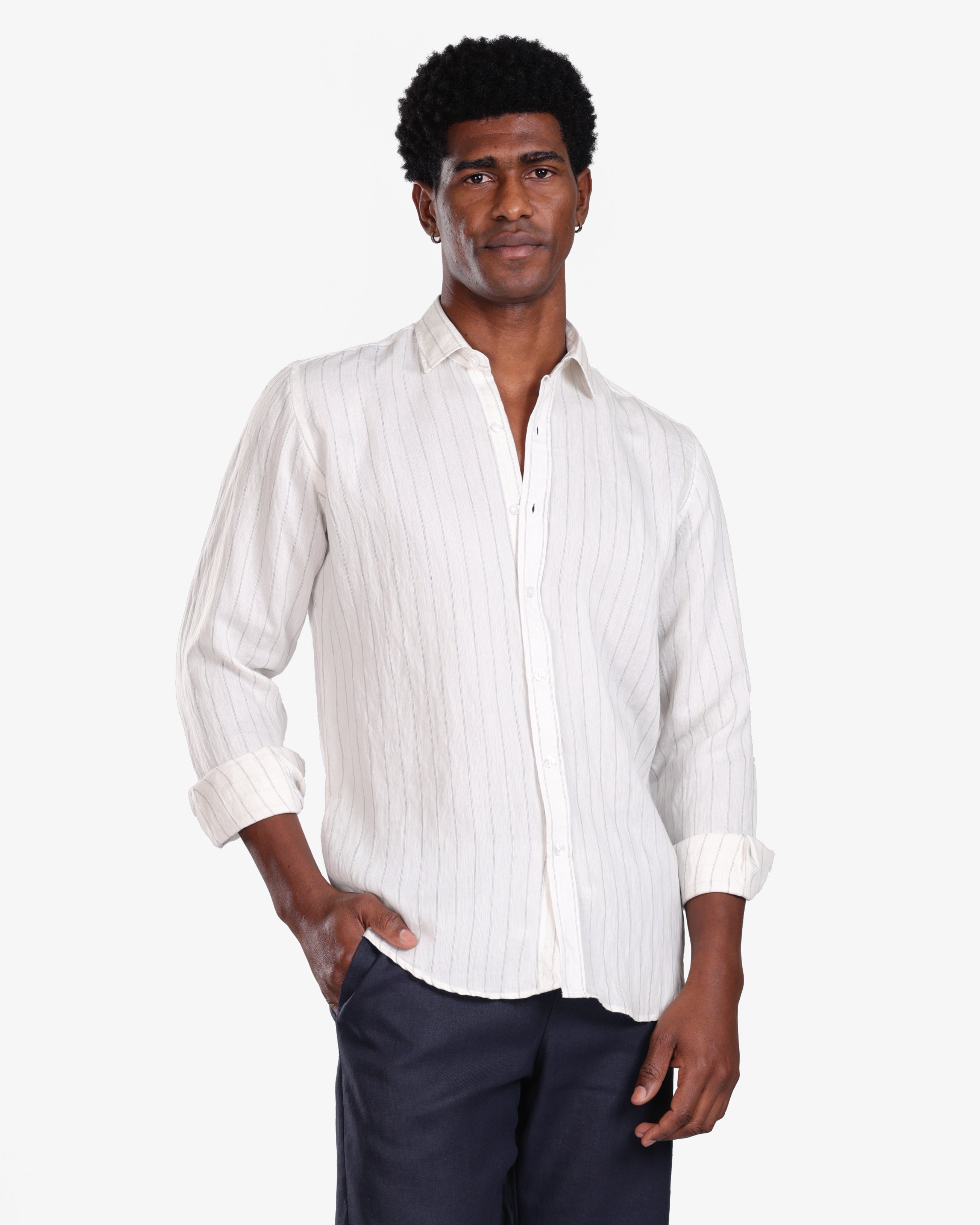 This essential shirt combines timeless pinstripe styling with the natural comfort of linen, making it a versatile addition to any thoughtfully curated warm-weather wardrobe.