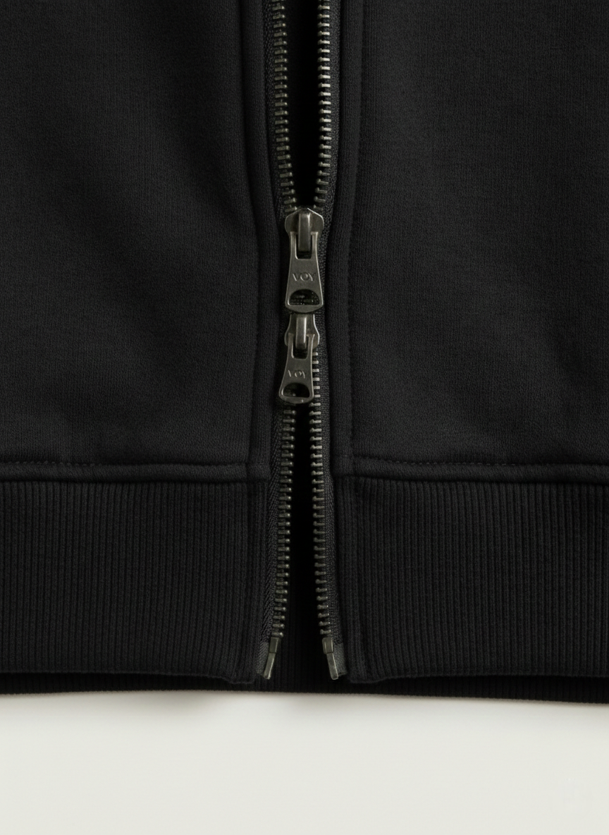 The double front zipper adds versatility in styling, while the cargo-style front pockets enhance both functionality and visual depth. Finished in a rich black tone, it’s a refined essential that transitions effortlessly from streetwear to elevated casual looks.