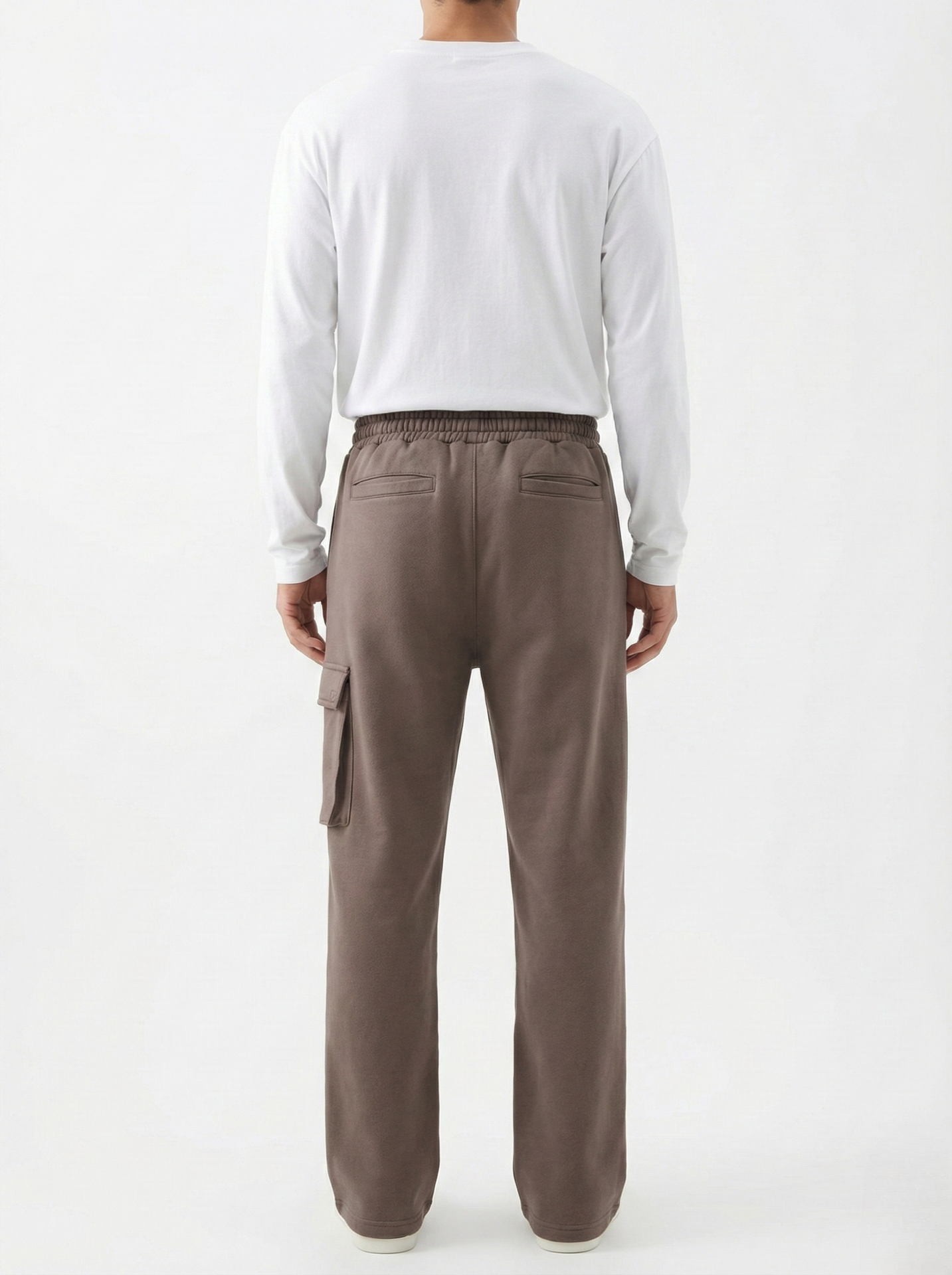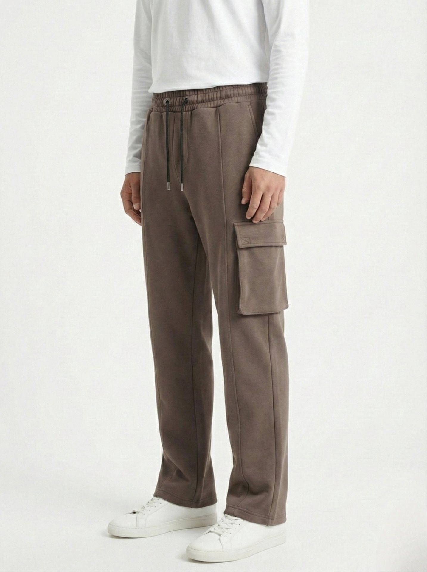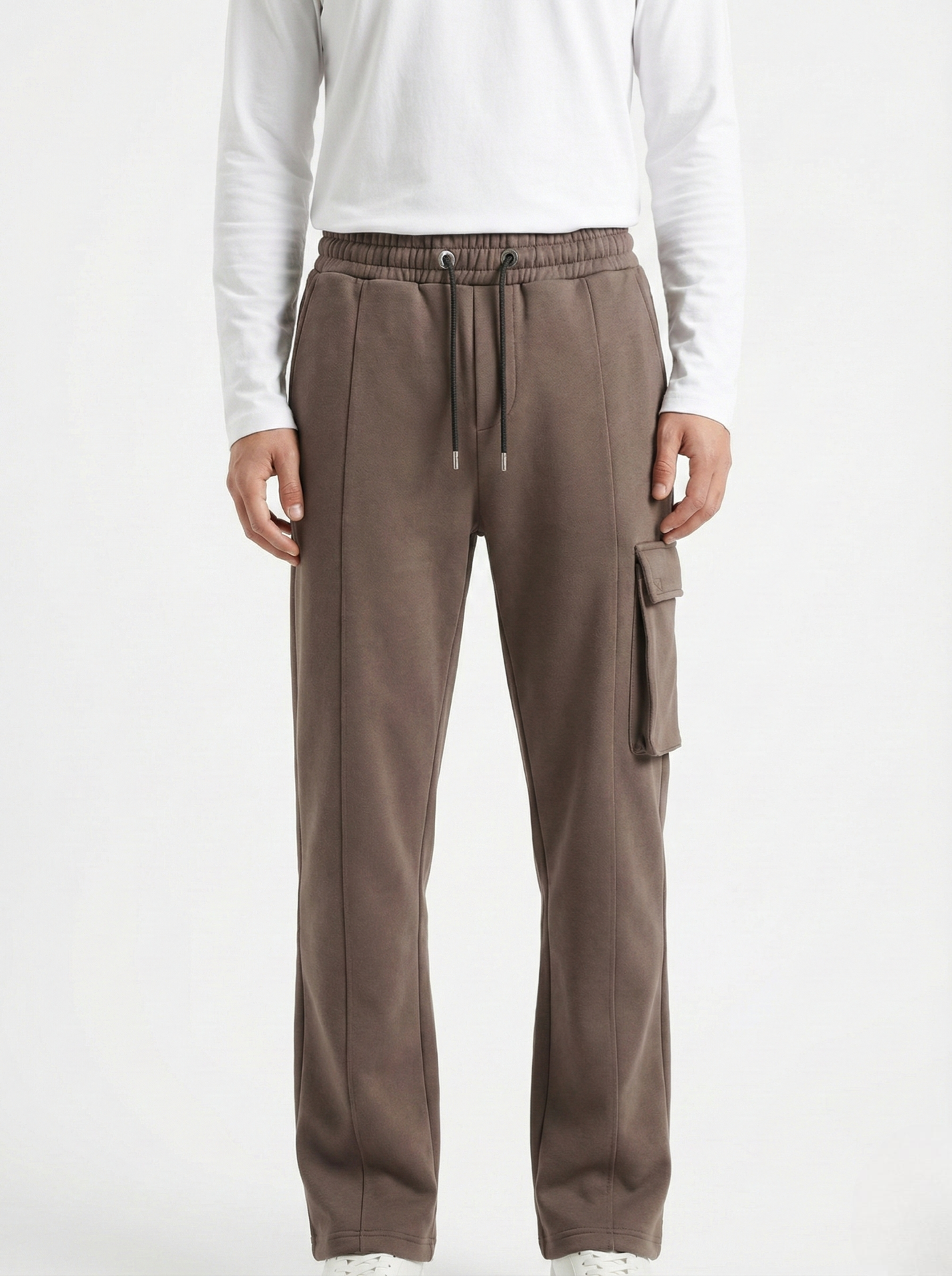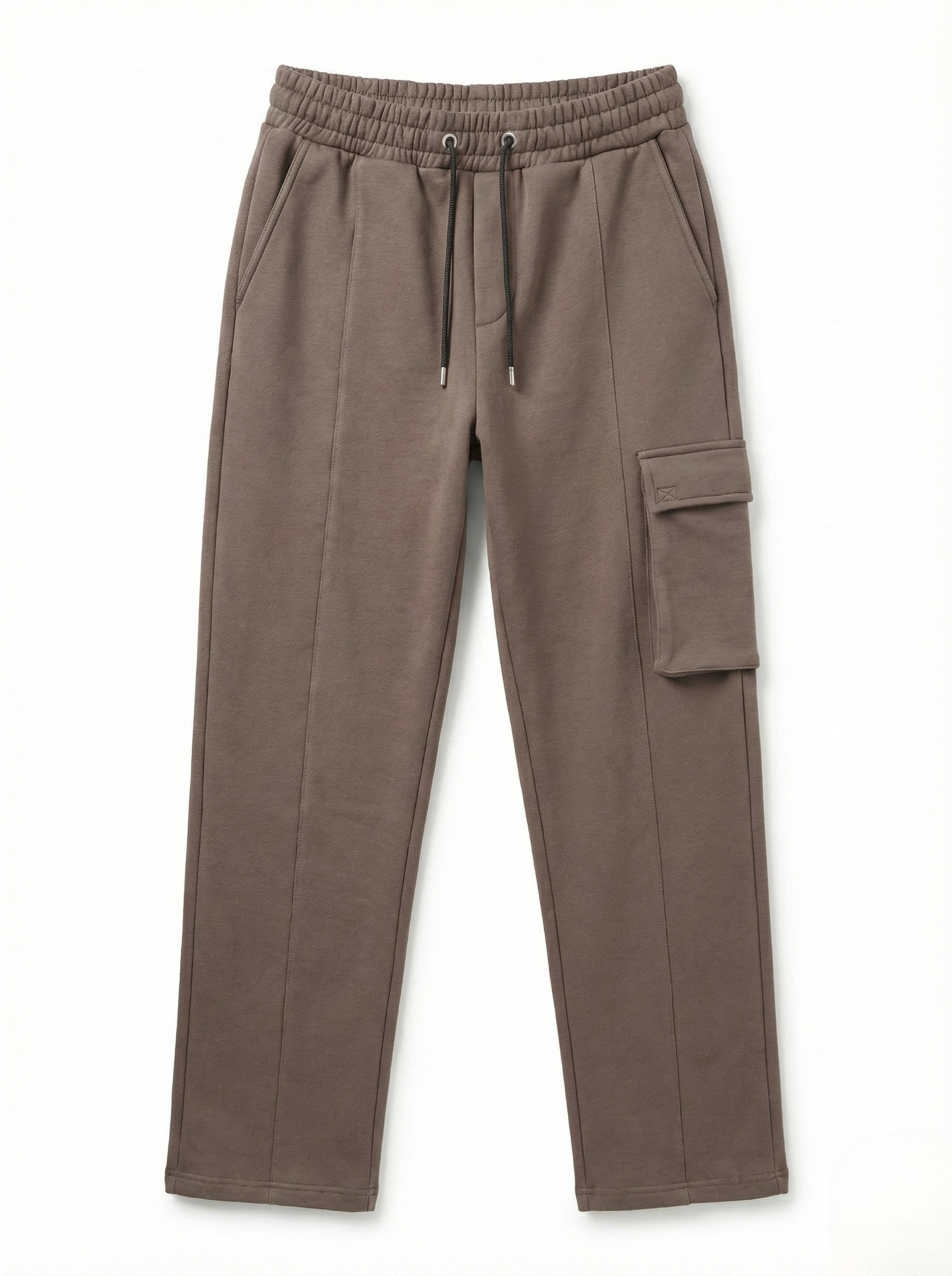 The relaxed straight-leg cut offers natural drape and unrestricted movement, enhanced by subtle front seam lines that visually elongate the leg. A single side cargo pocket adds functional character without disrupting the minimal look, while the elasticated waistband with adjustable drawstrings ensures a secure, adaptable fit.
