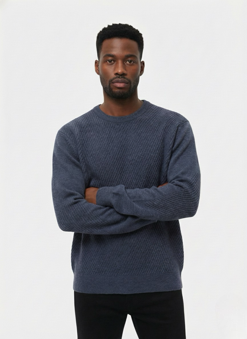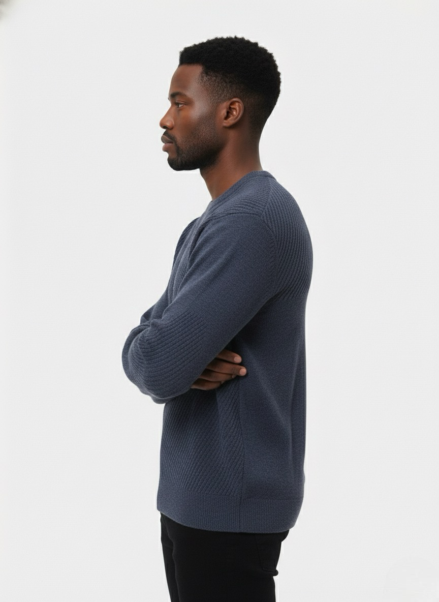 Made from a soft-touch textured knit, featuring subtle diagonal rib detailing across the body and sleeves — creating depth, movement, and a structured visual feel without compromising on comfort. The rib-knit collar, cuffs, and hem provide a slightly defined finish, ensuring shape retention and a polished silhouette.