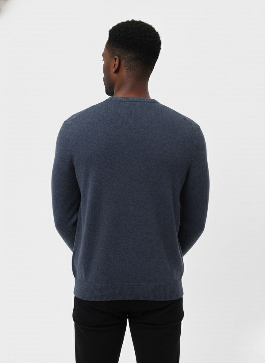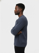 This crewneck sweater comes in a muted dusty indigo tone, offering a clean, elevated look that transitions effortlessly from casual layering to smart everyday wear.