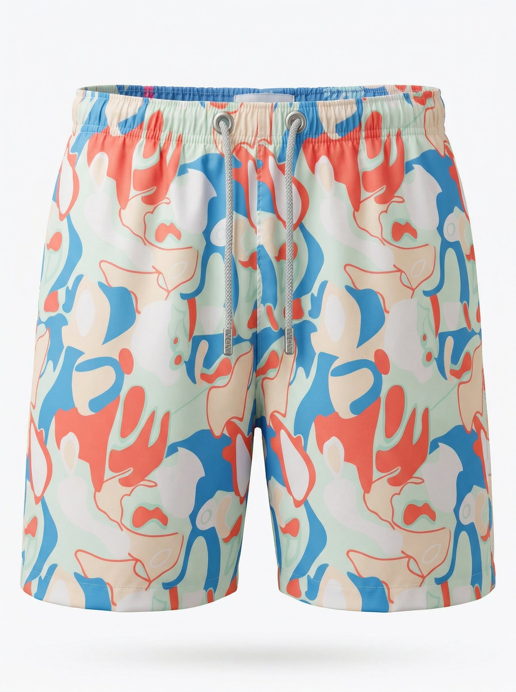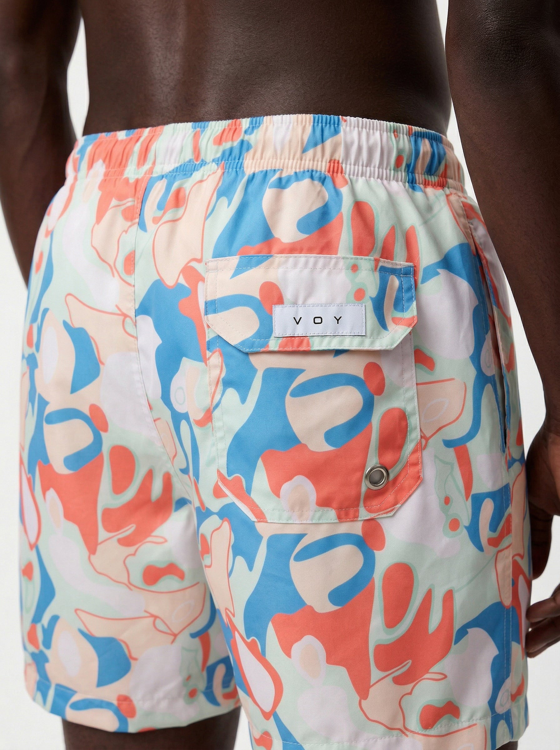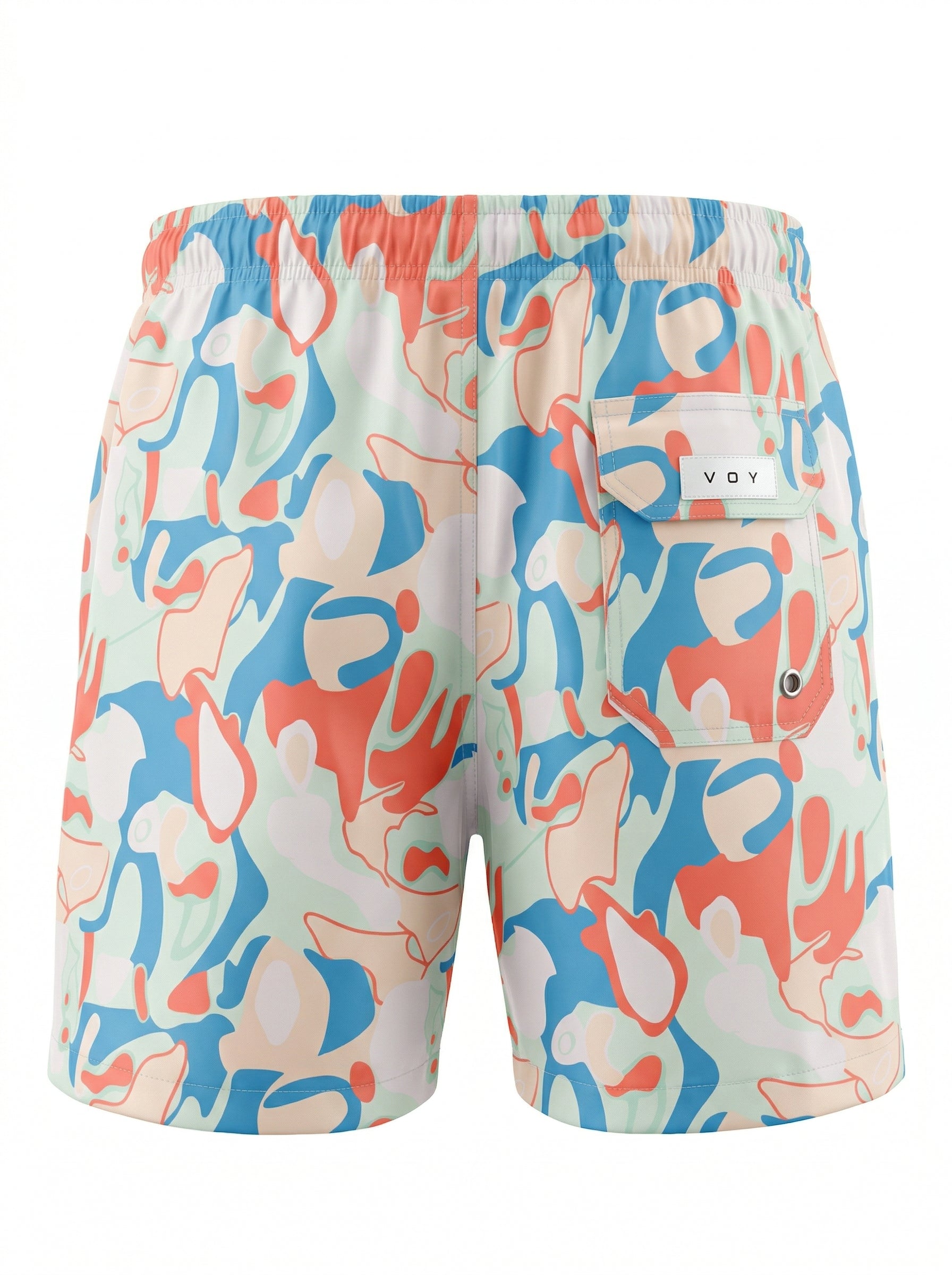Vibrant swim trunk featuring playful abstract shapes in coral, blue, and soft neutral tones.
