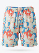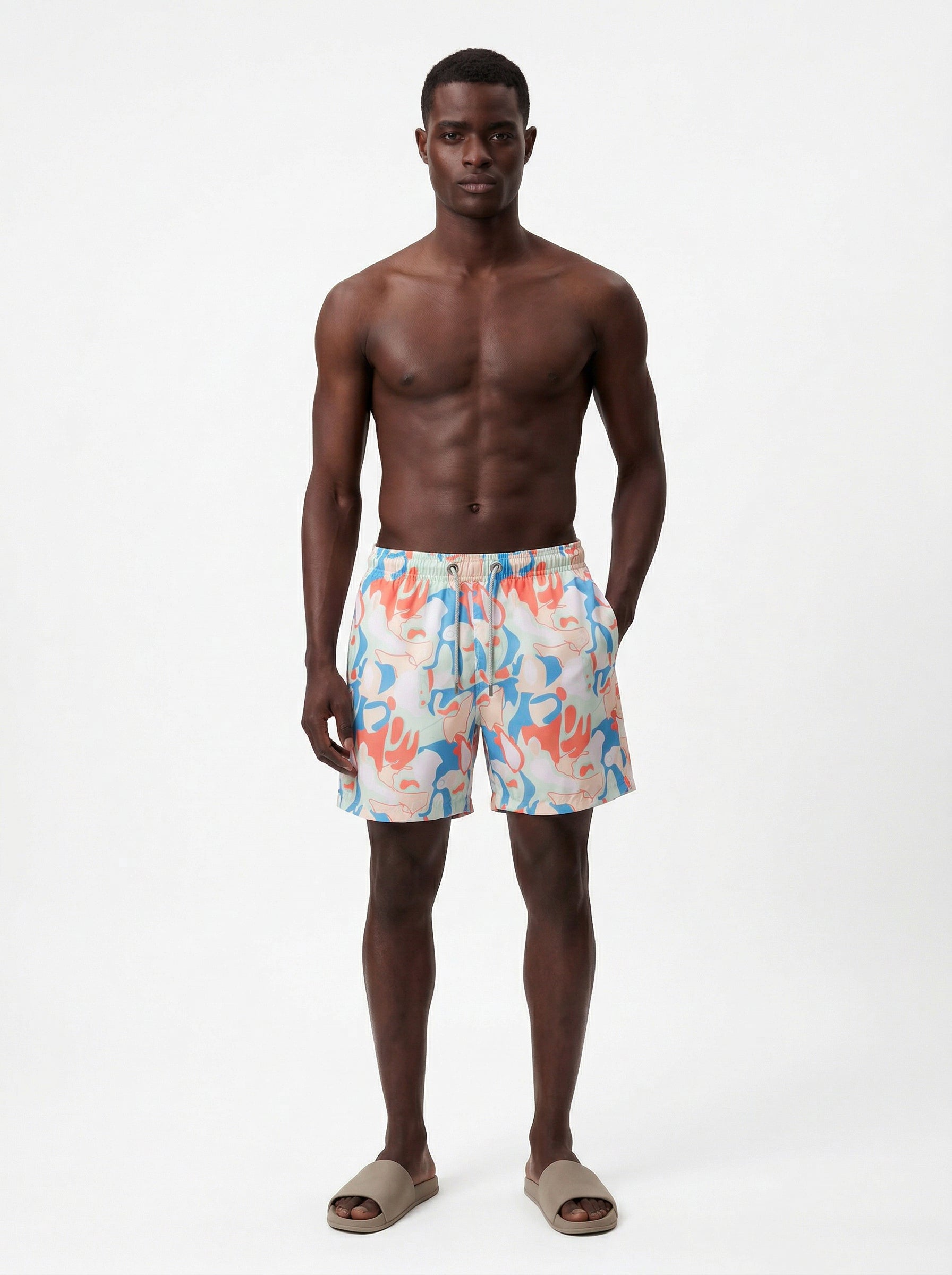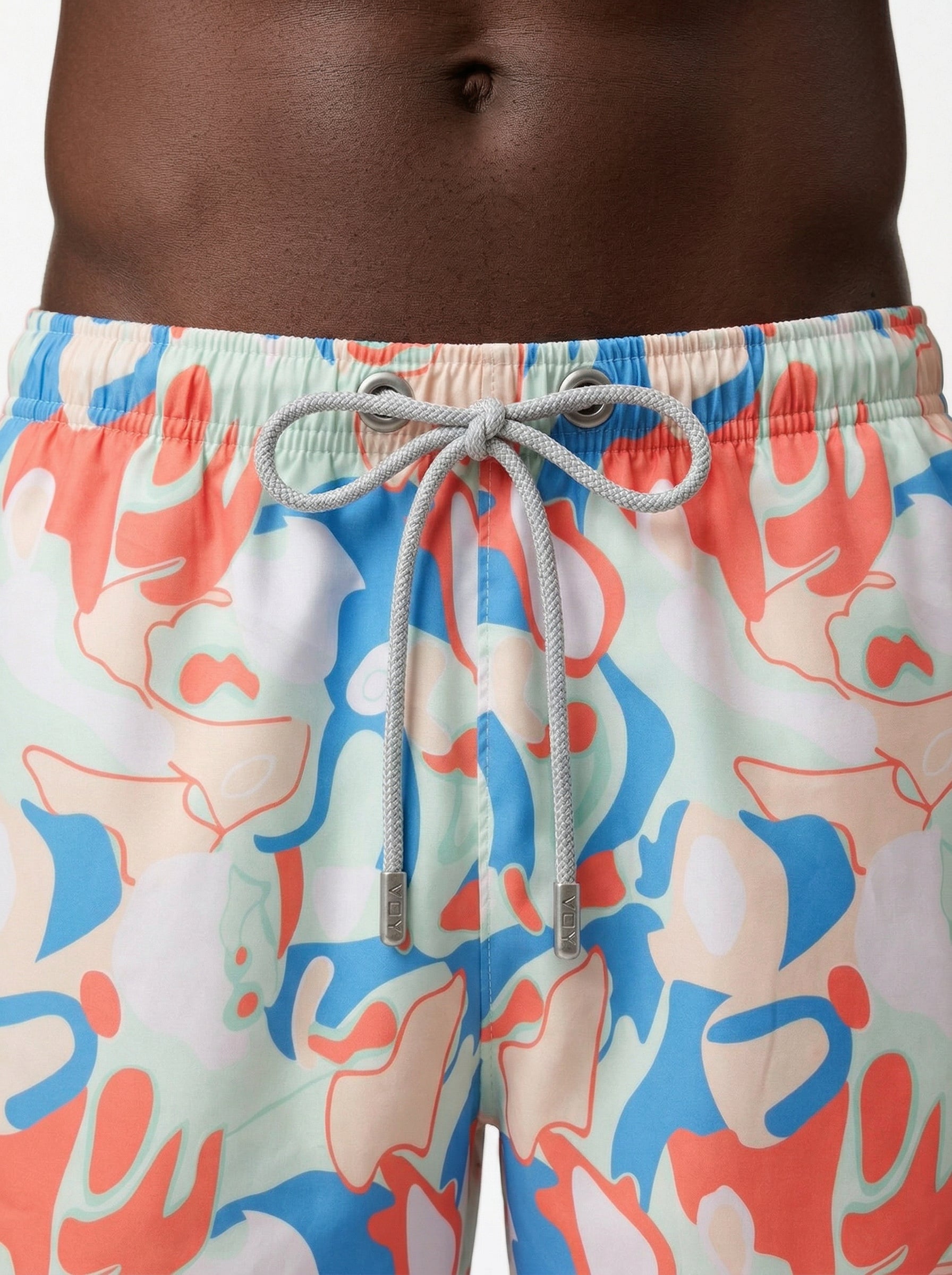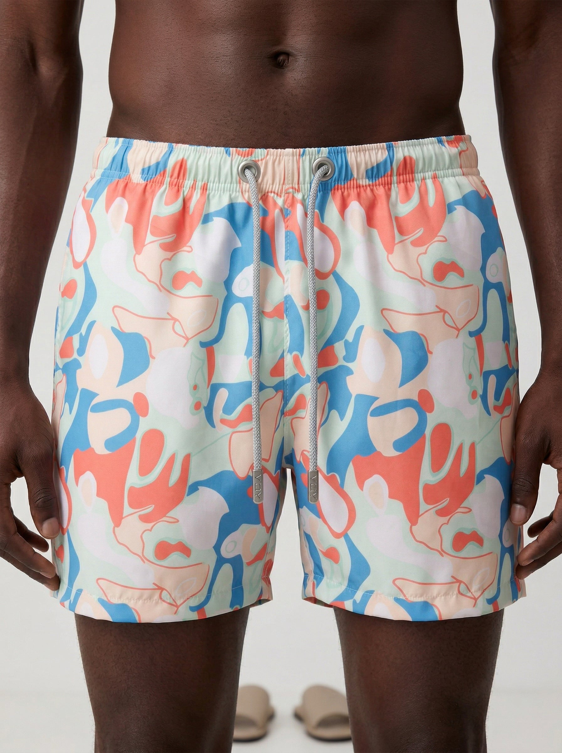 Vibrant swim trunk featuring playful abstract shapes in coral, blue, and soft neutral tones.
