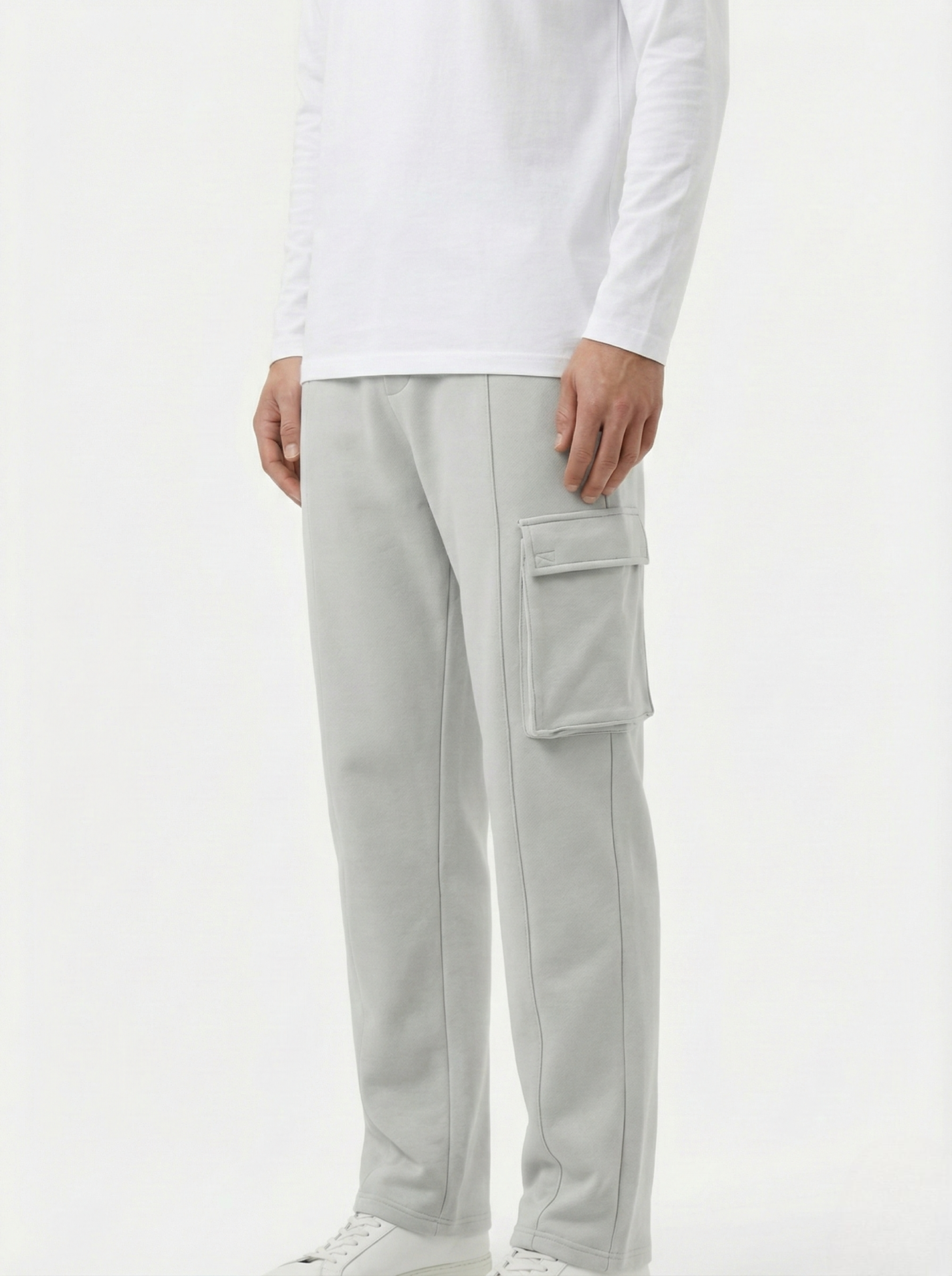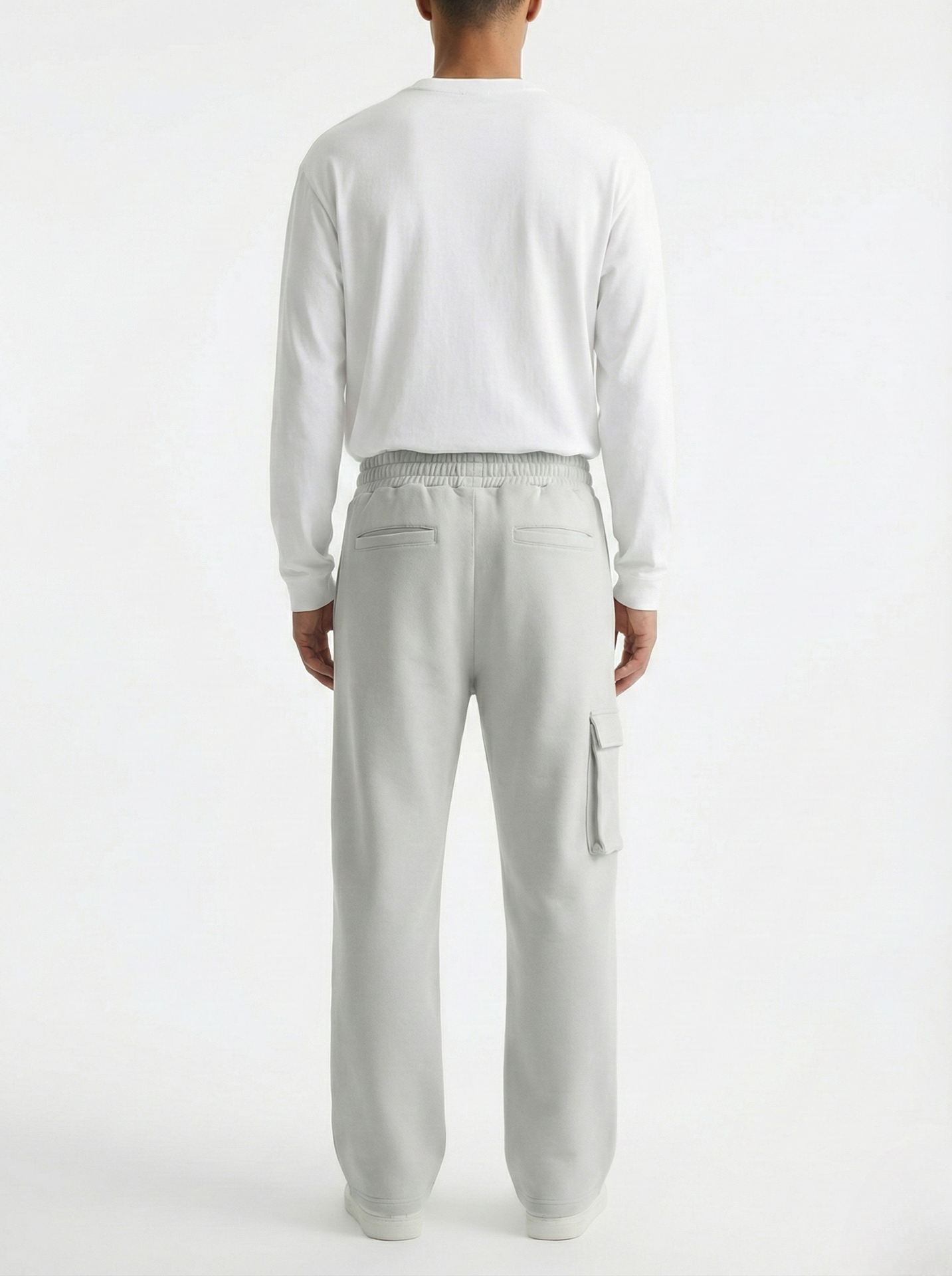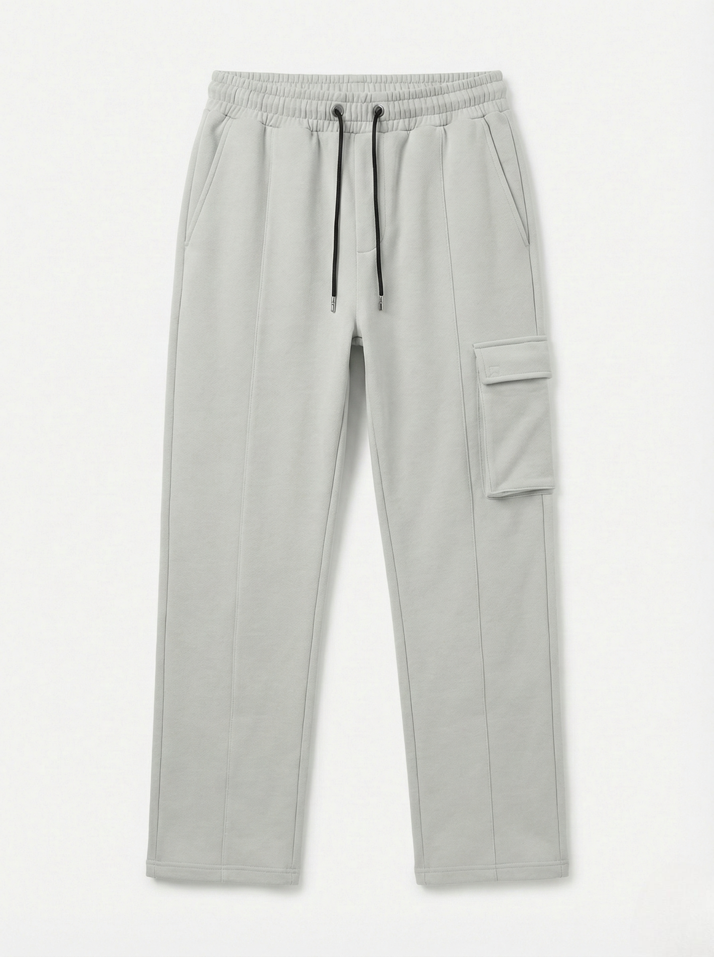 The relaxed straight-leg cut offers natural drape and unrestricted movement, enhanced by subtle front seam lines that visually elongate the leg. A single side cargo pocket adds functional character without disrupting the minimal look, while the elasticated waistband with adjustable drawstrings ensures a secure, adaptable fit.
