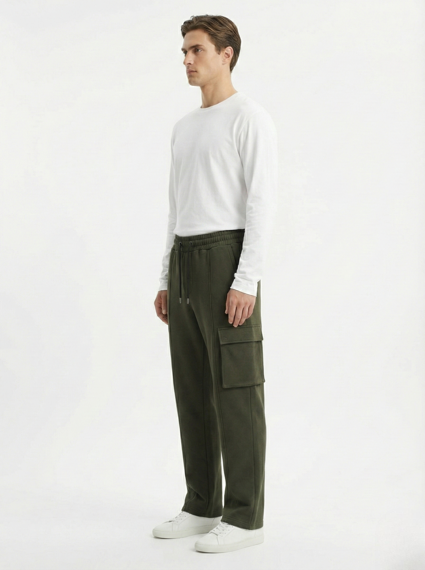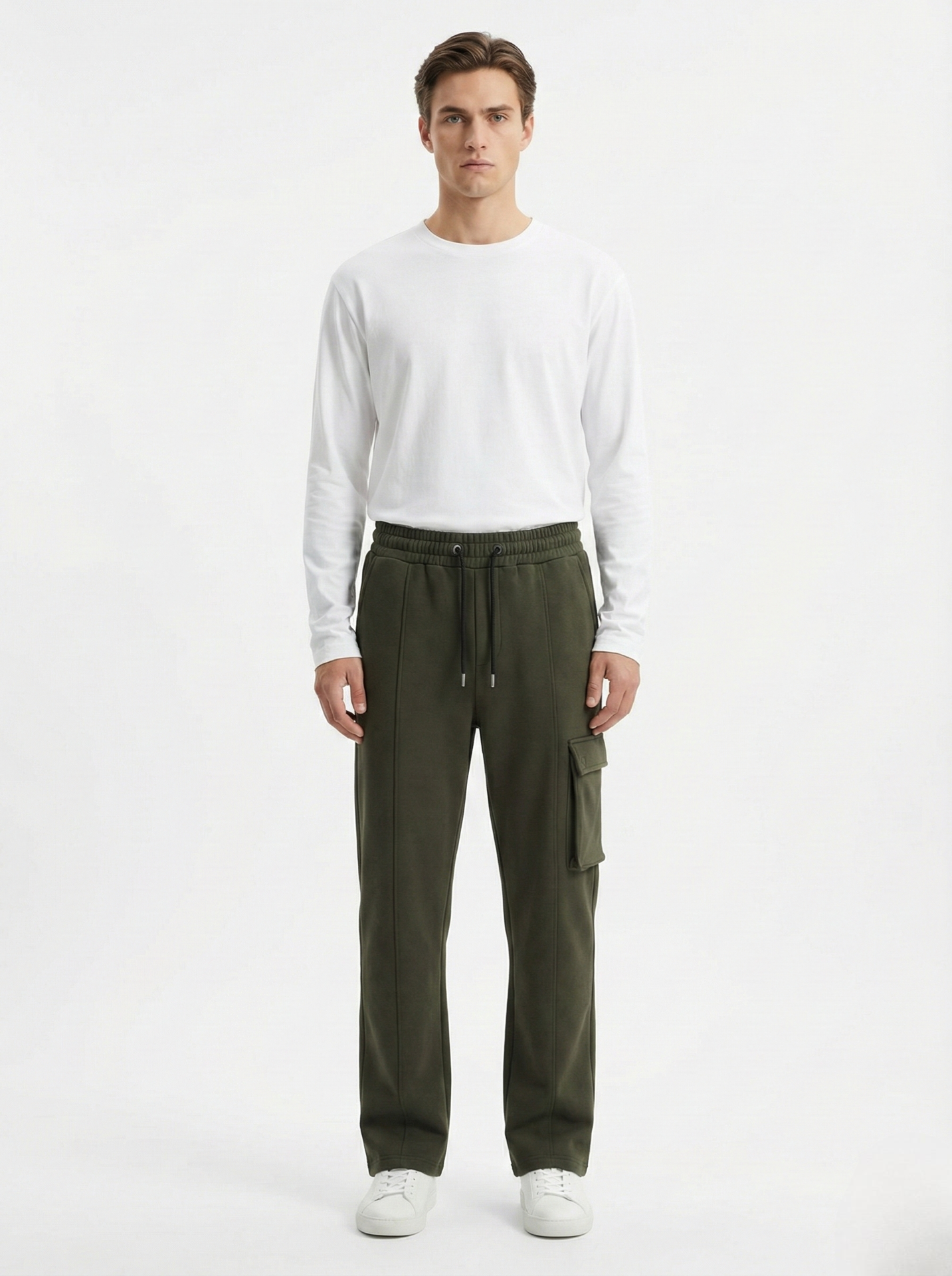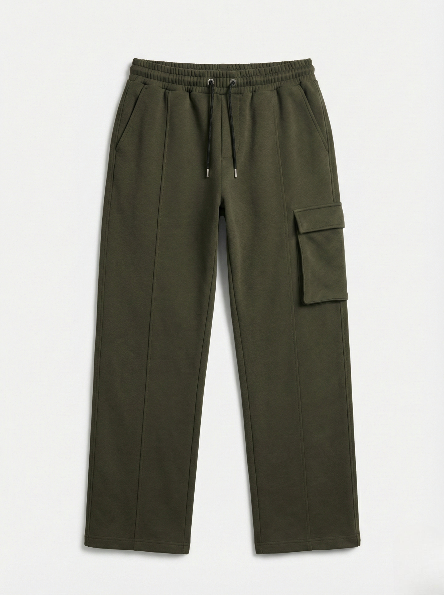 The relaxed straight-leg cut offers natural drape and unrestricted movement, enhanced by subtle front seam lines that visually elongate the leg. A single side cargo pocket adds functional character without disrupting the minimal look, while the elasticated waistband with adjustable drawstrings ensures a secure, adaptable fit.