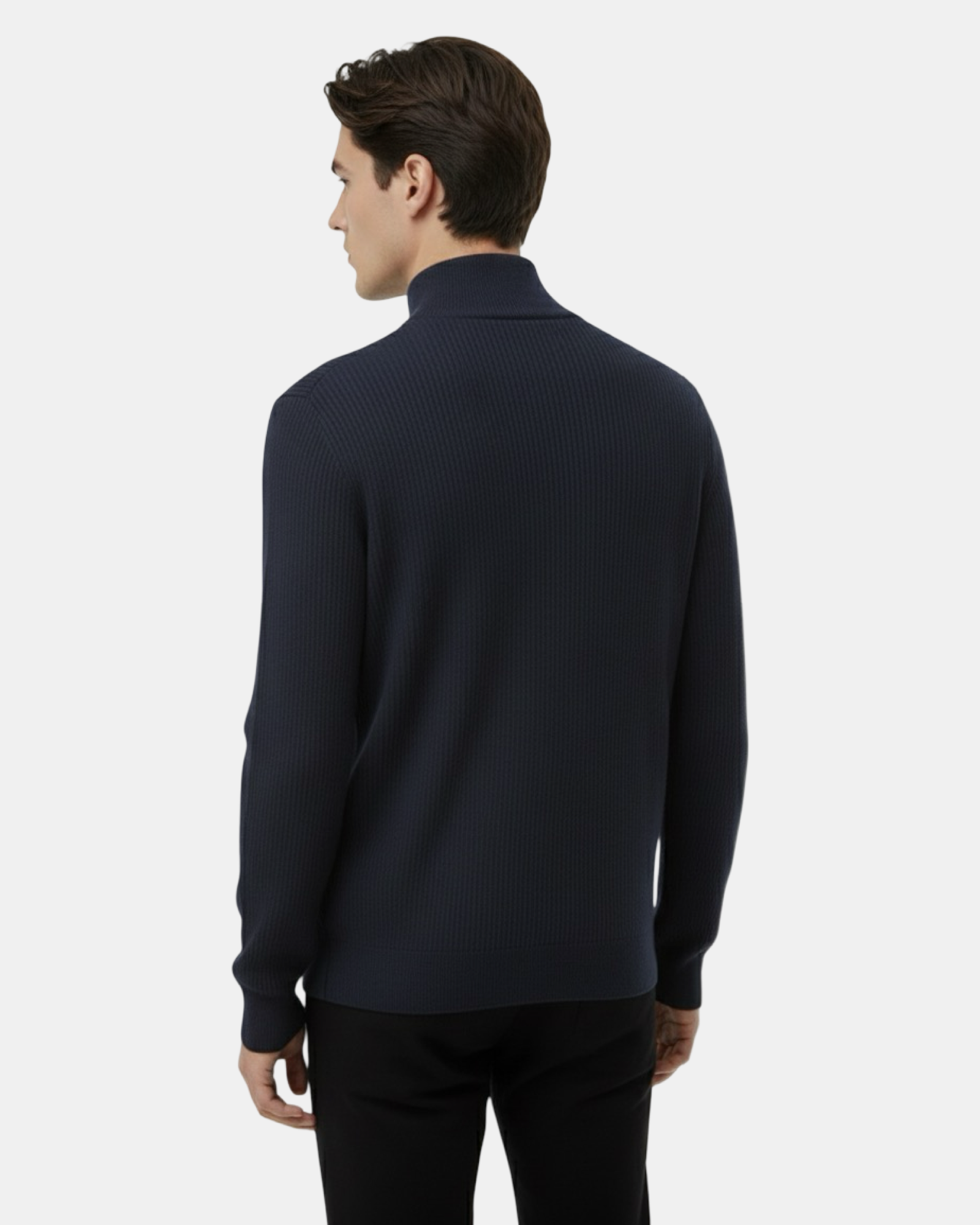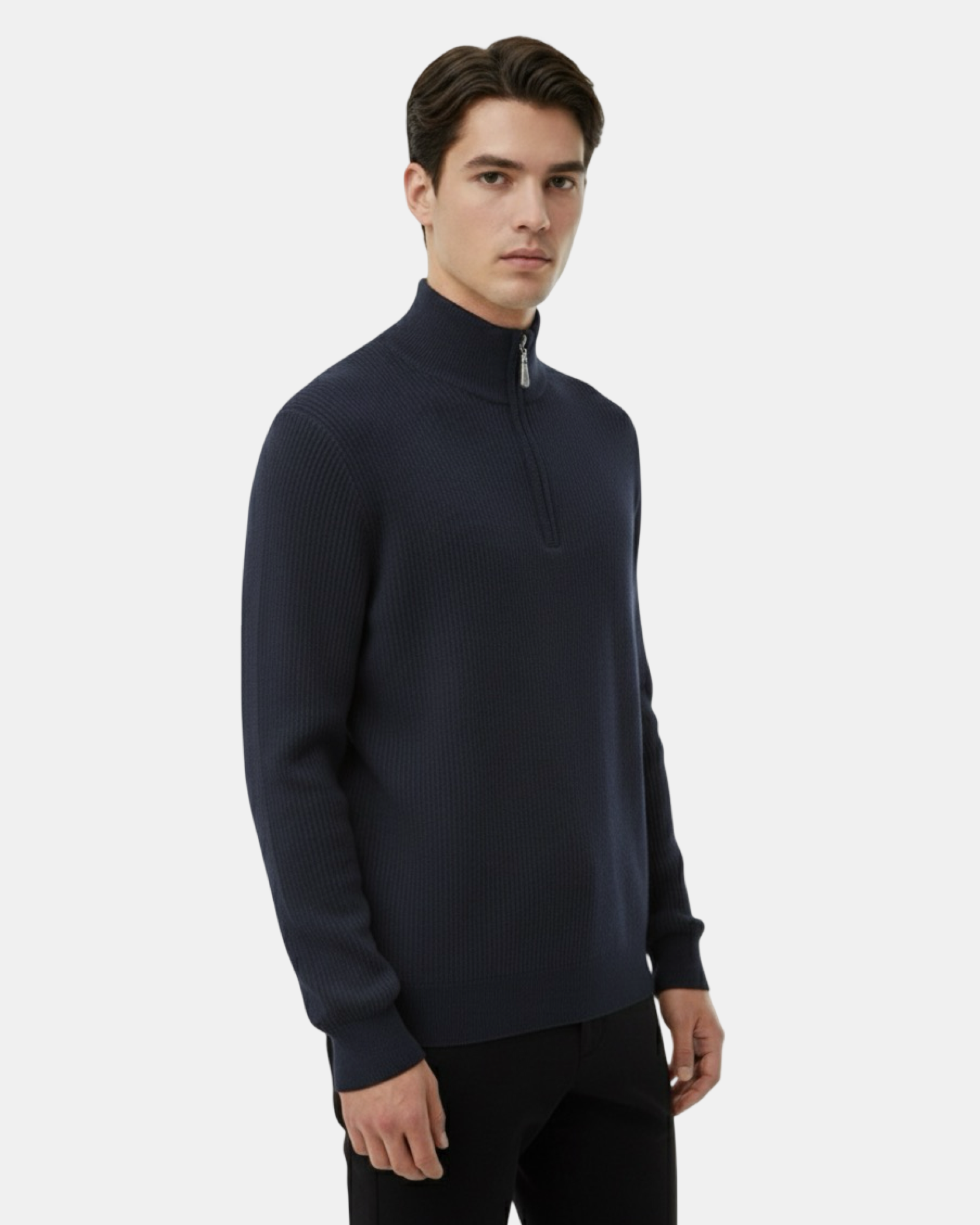 The Navy Ribbed Half-Zip Knit Sweater features a clean high-neck silhouette with a smooth metal half-zip — allowing easy styling between elevated casual and smart layering looks.