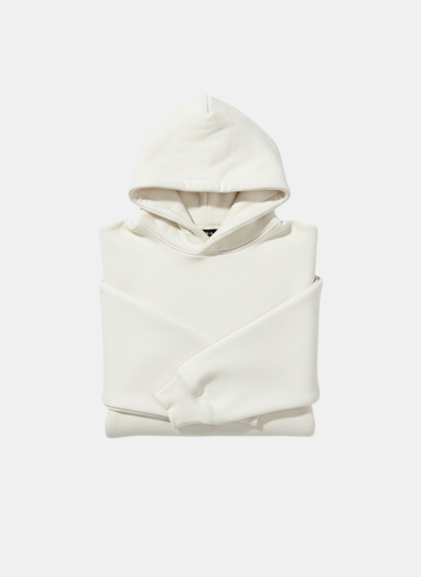 Constructed from a breathable lightweight cotton-blend fleece, it offers all-season wearability — soft on the skin, smooth matte surface, and perfect layering weight. Finished with a spacious hood, front kangaroo pocket, ribbed cuffs and hem for shape retention, and clean seams for a sleek, elevated look.