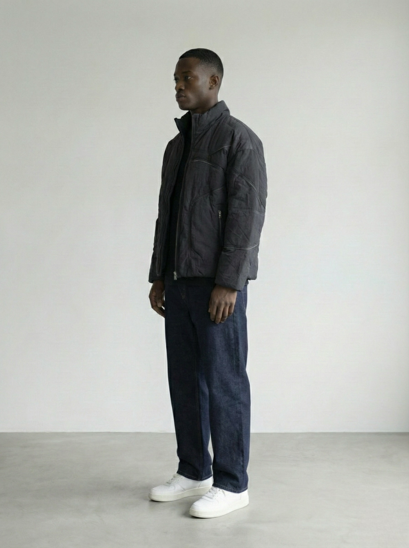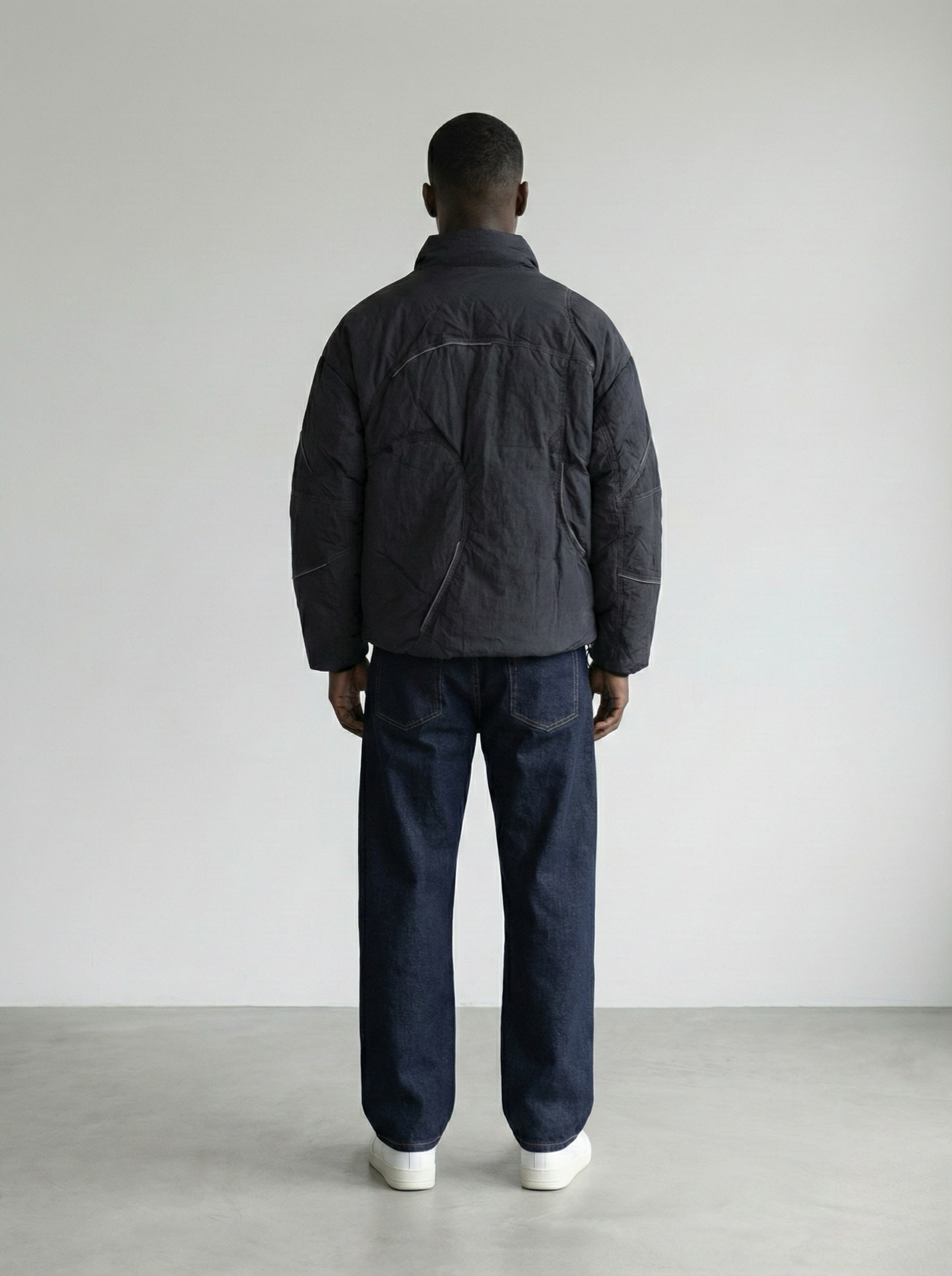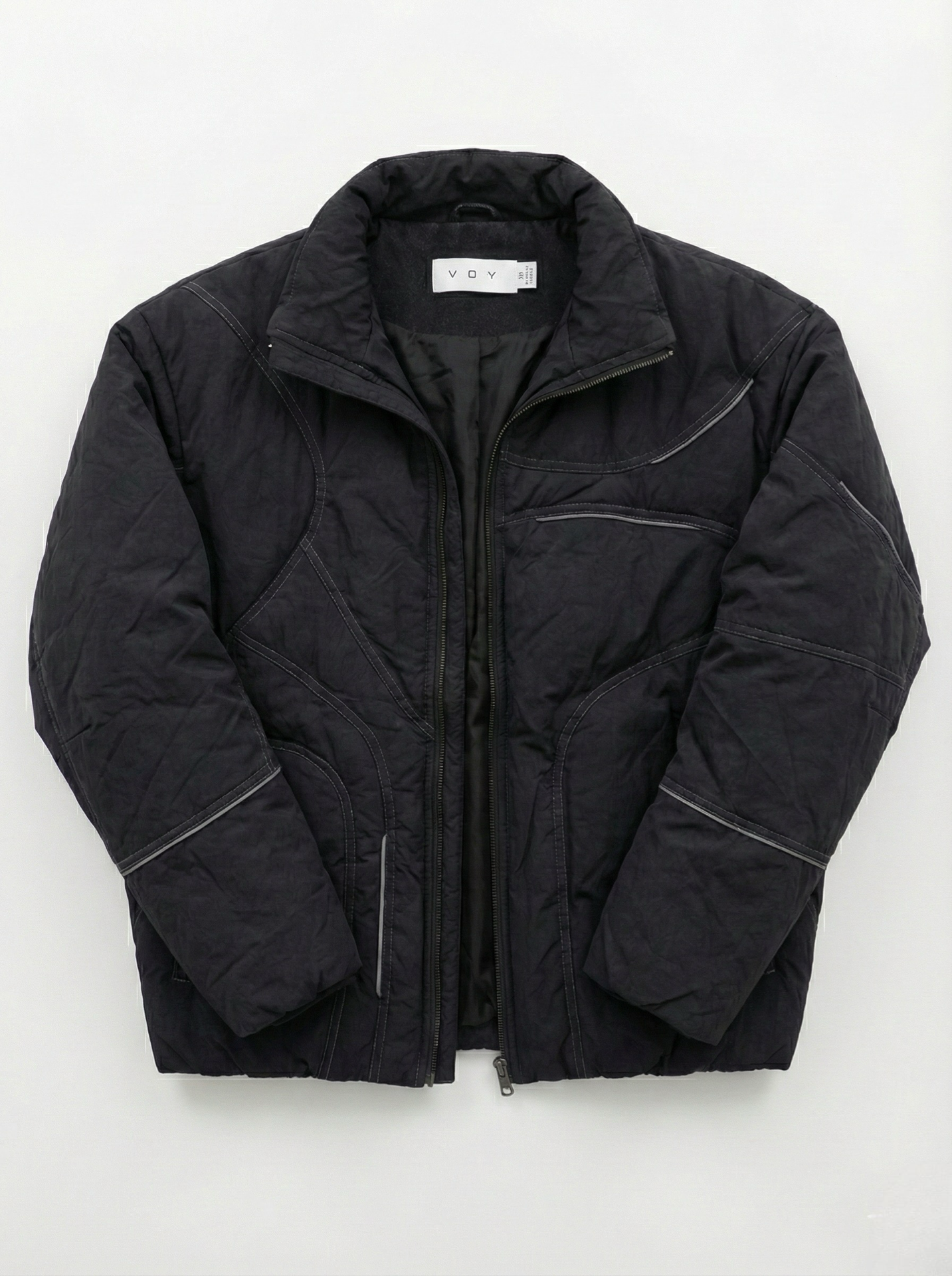 A dynamic quilted puffer jacket with technical contour stitching and a sharp modern silhouette. Designed with a sleek stand collar, asymmetric curved quilt lines, and contrast trim details that highlight its structured geometry. Features full front zipper closure, zipped side pockets, and an angled chest zipper pocket for a refined utility touch. Lightweight padding offers warmth without bulk, while the durable shell maintains a crisp, textured look. A perfect blend of urban functionality and clean minimal aesthetics.