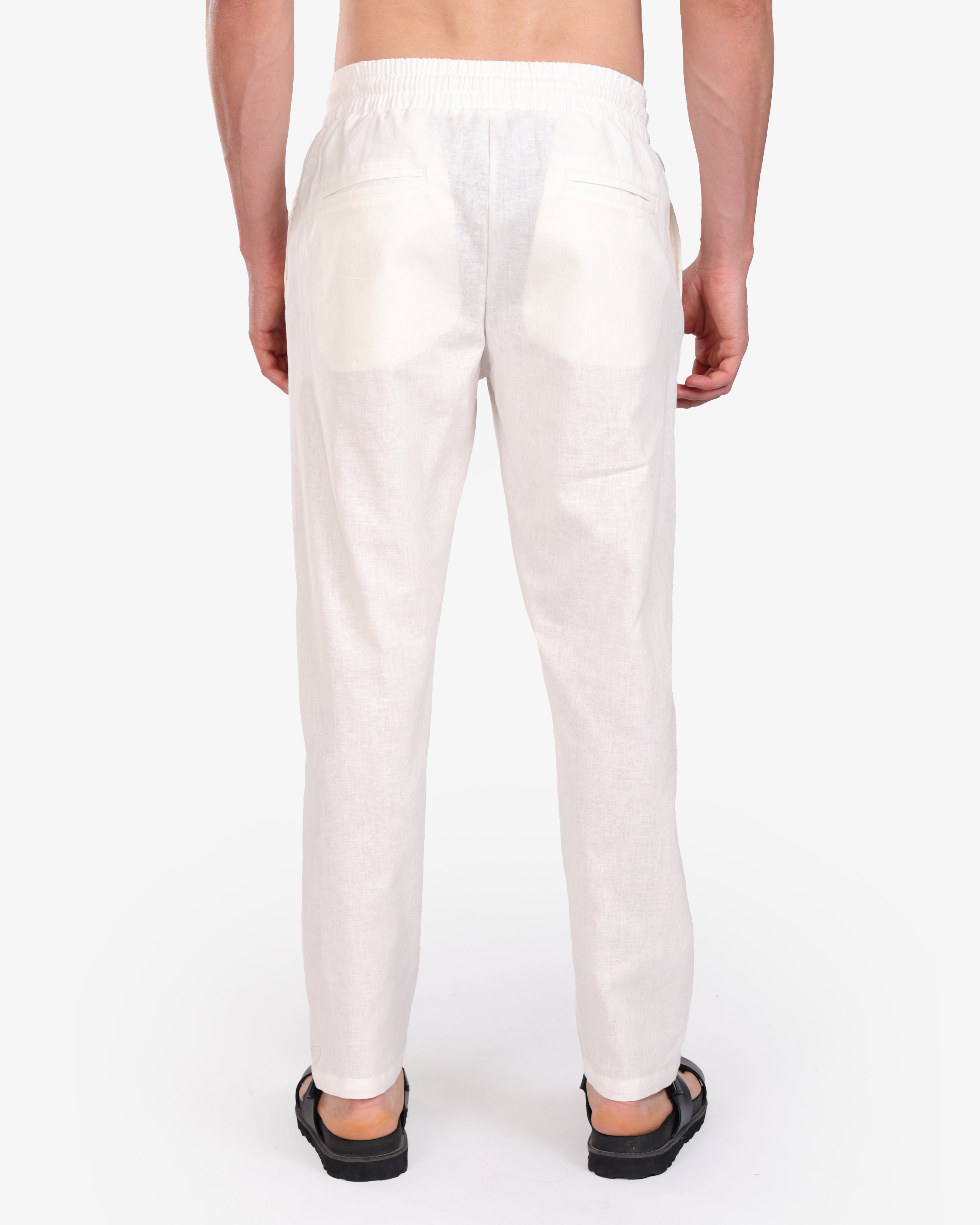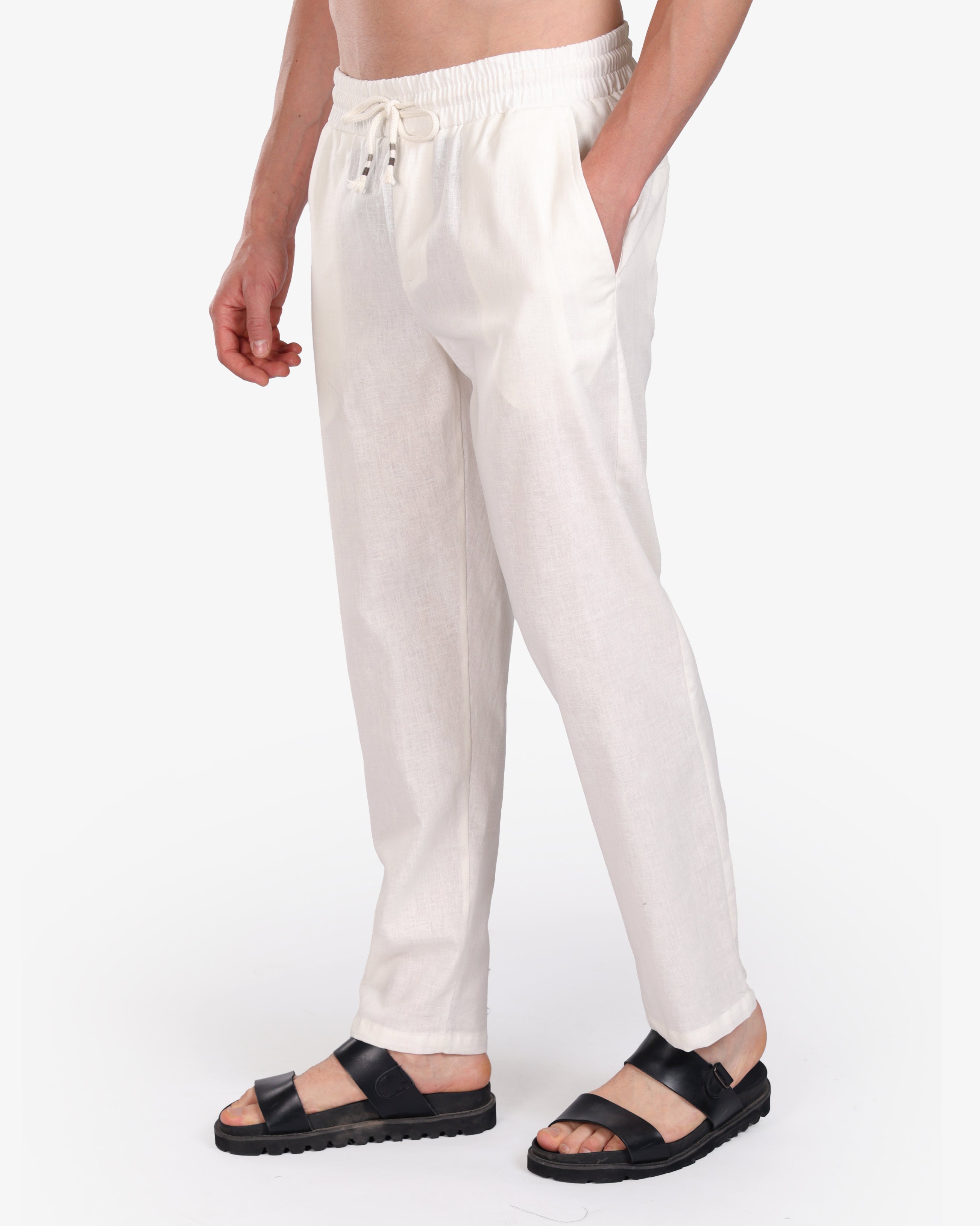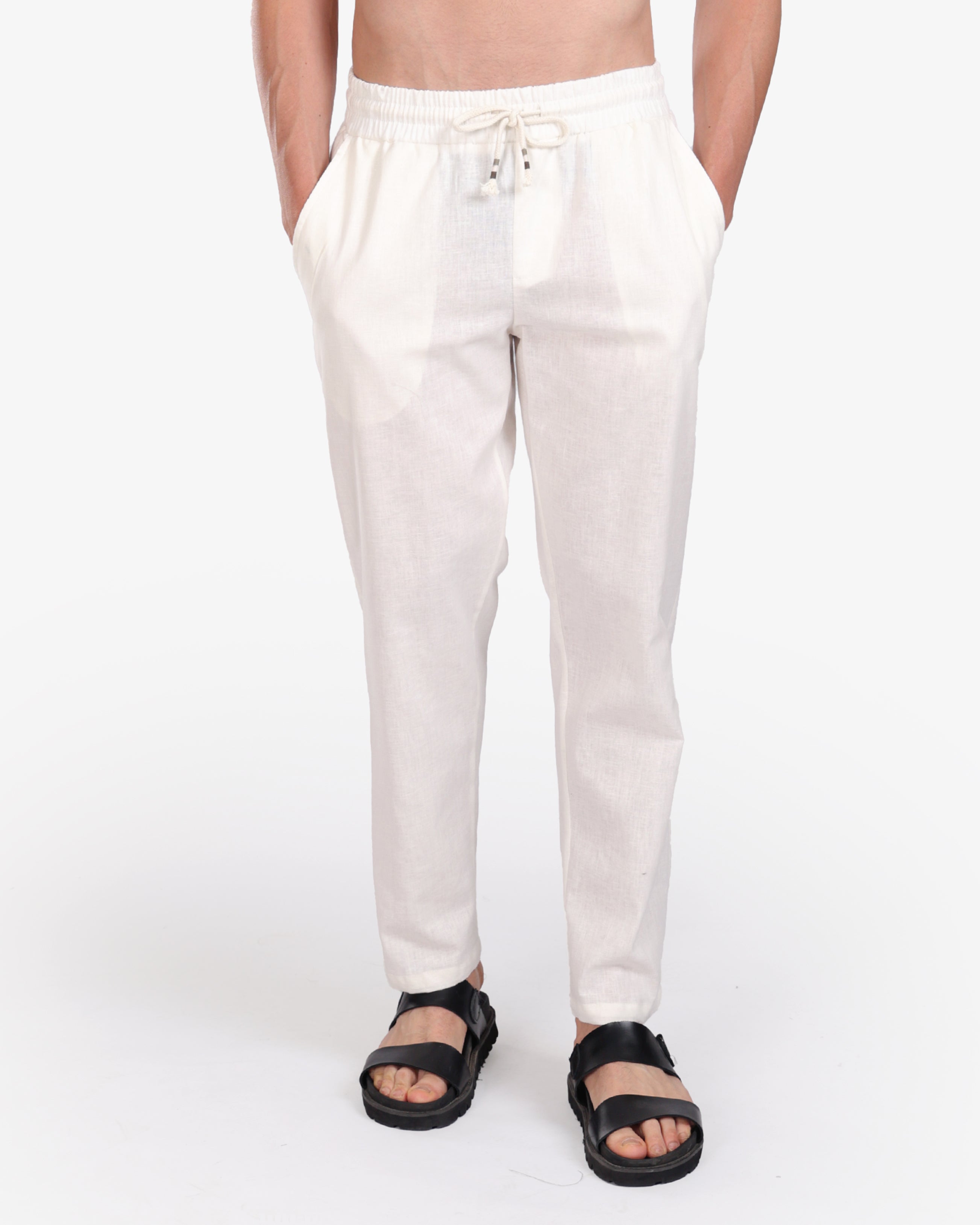 WHITE RELAXED 100% LINEN SLIM-FIT DRAWSTRING PANTS S26N