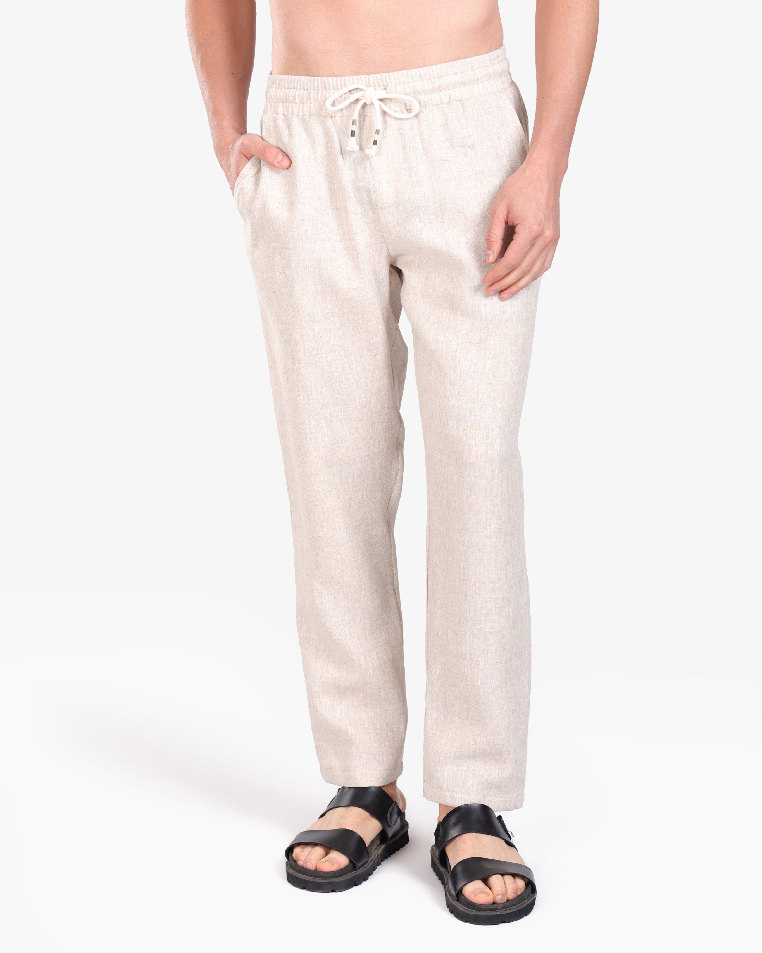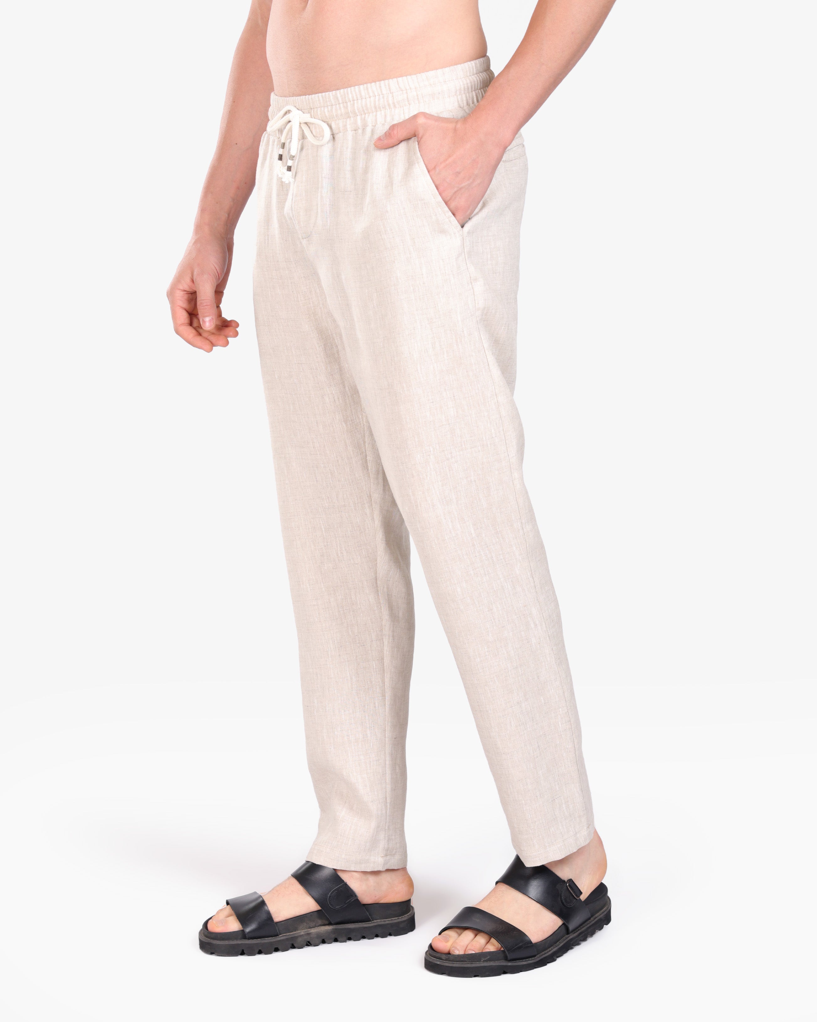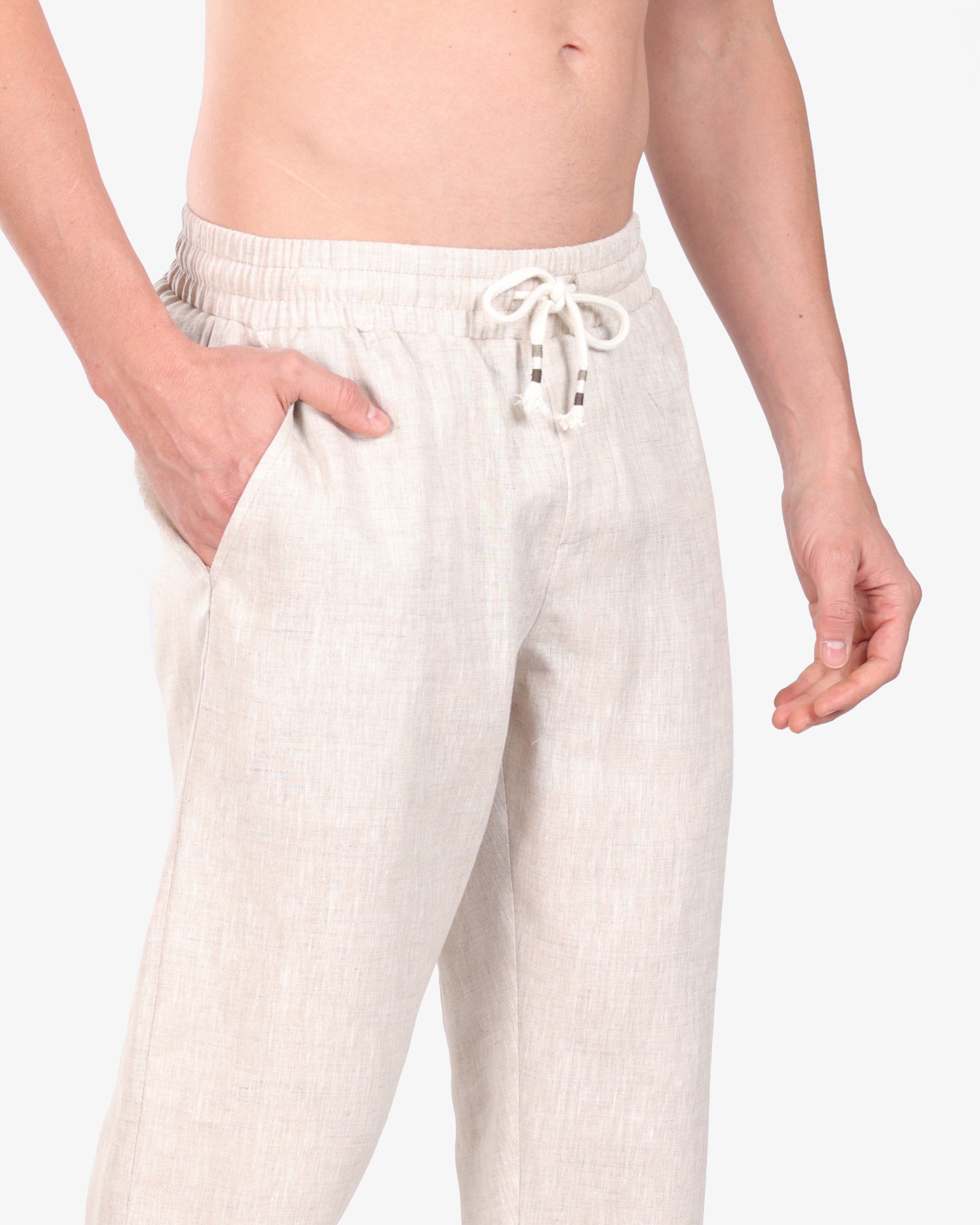 FLAX BEIGE RELAXED 100% LINEN SLIM-FIT DRAWSTRING PANTS S26N