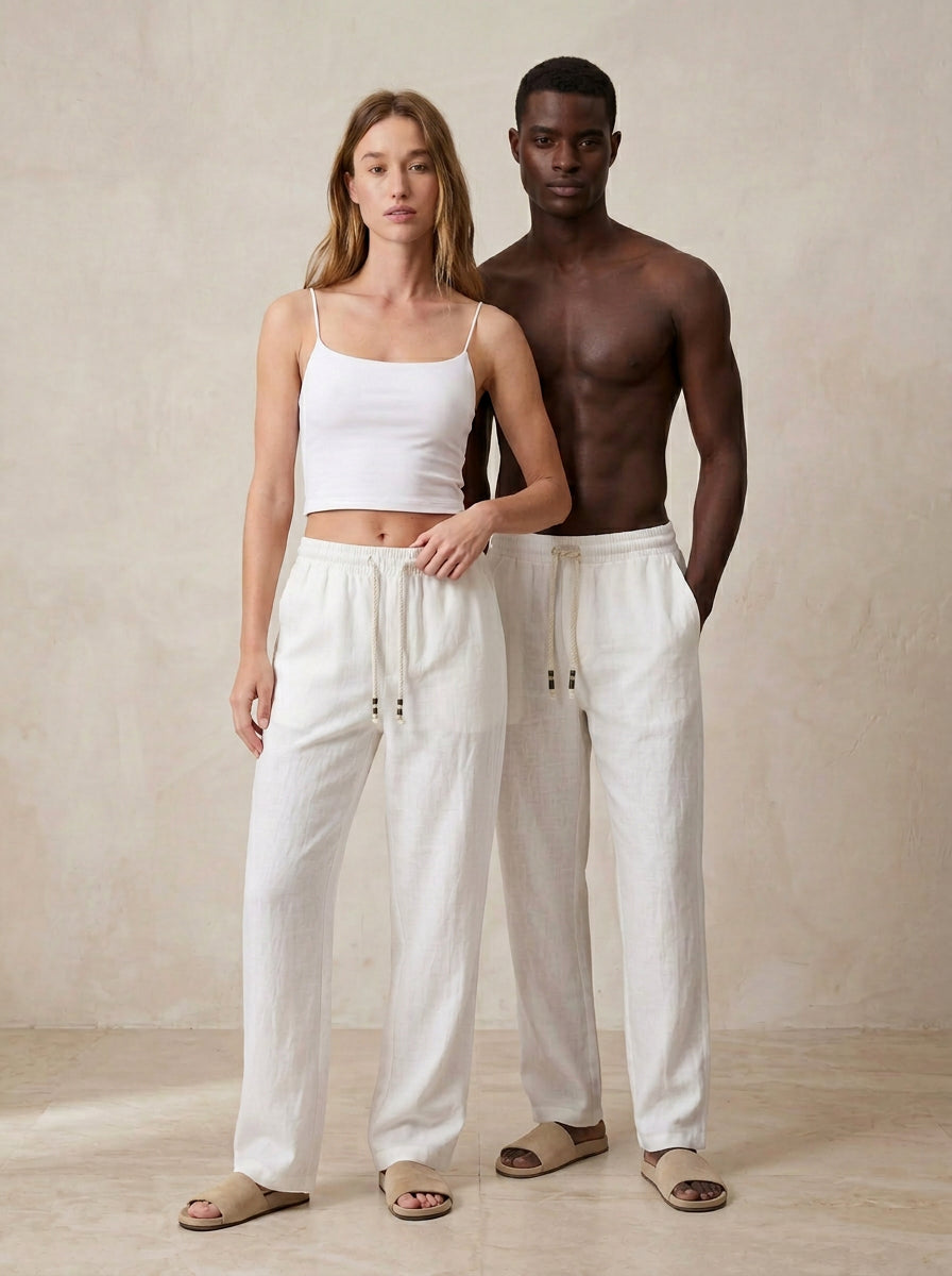 The Off White Straight-Leg Pure Linen Drawstring Pants S26N are crafted from premium breathable linen designed for warm-weather ease and everyday refinement. The fabric reveals the authentic character of pure linen, with a natural texture and subtle organic creases that enhance its relaxed aesthetic.