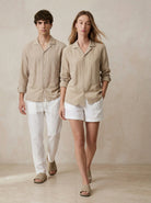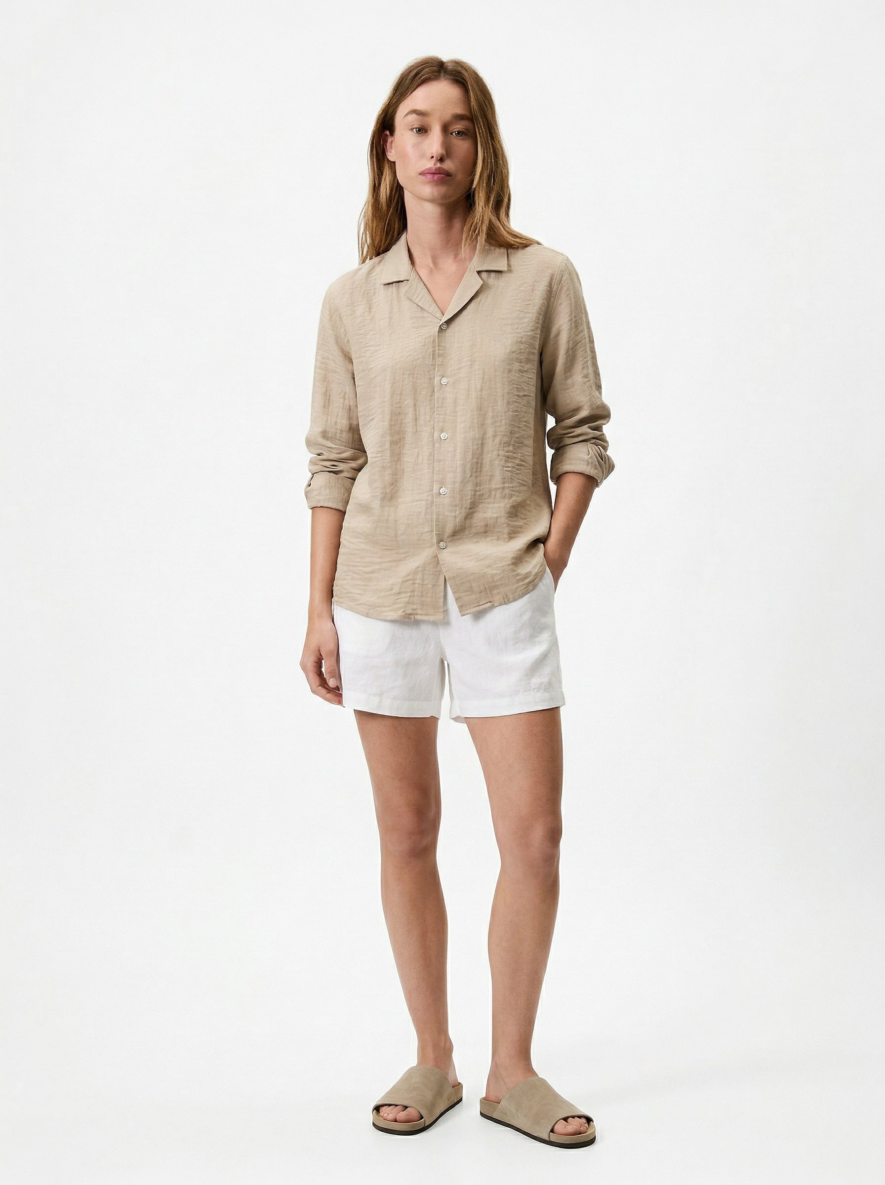 The Desert Sand Wrinkled Pure Linen Relaxed Shirt S26N is designed for breathable comfort and relaxed summer styling. Crafted from pure linen, the fabric features a natural wrinkled texture that reflects the authentic character of linen while enhancing airflow and lightweight comfort.
