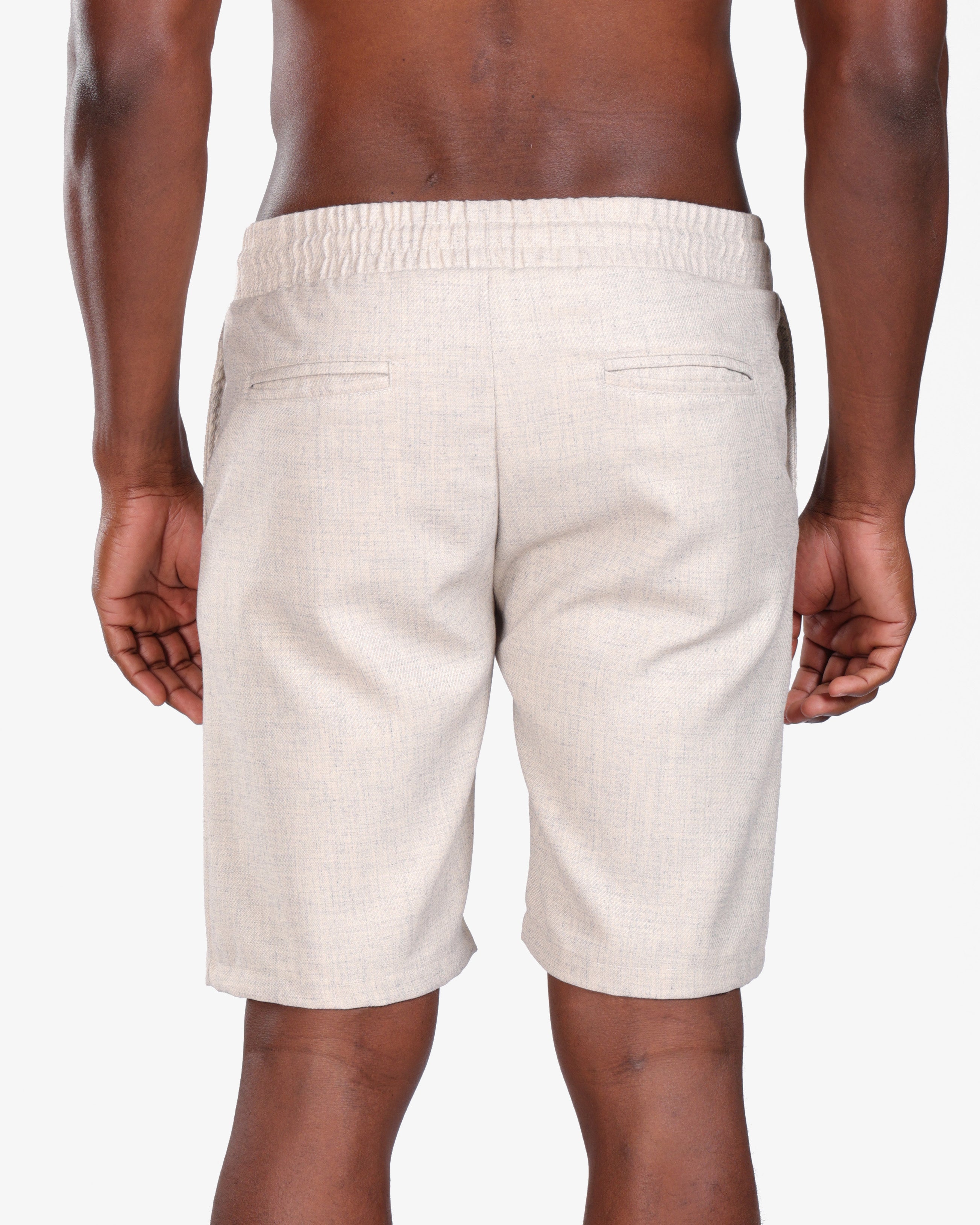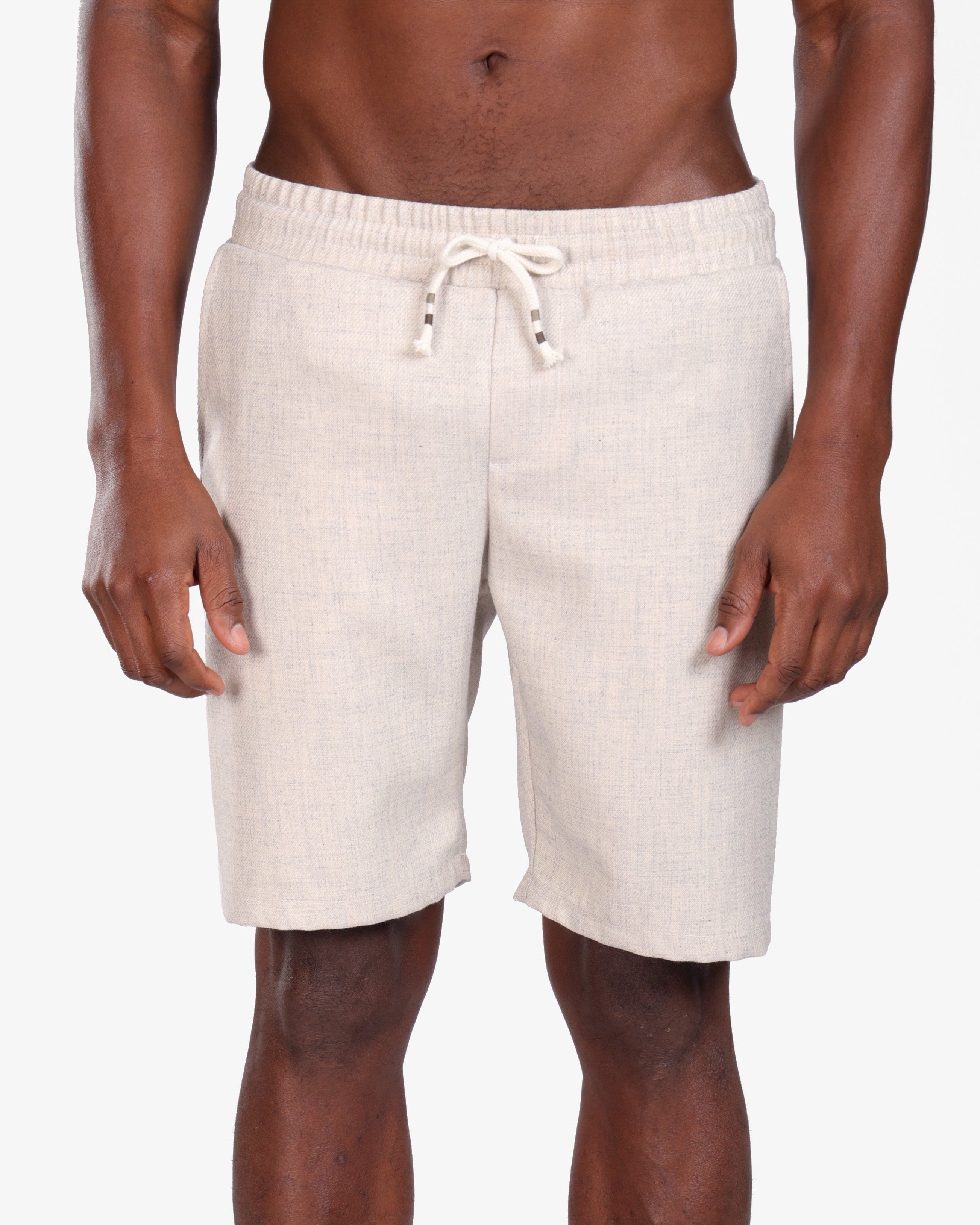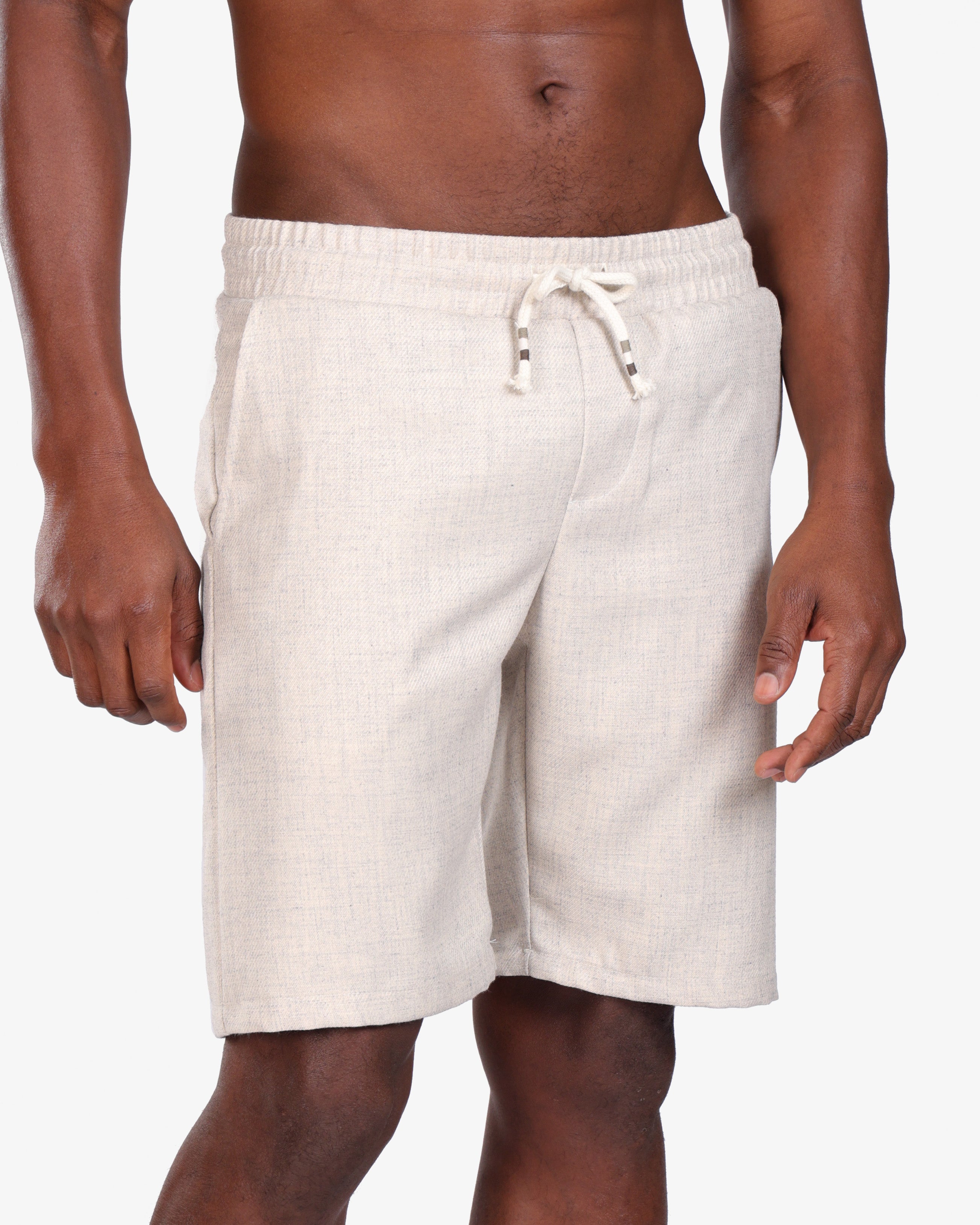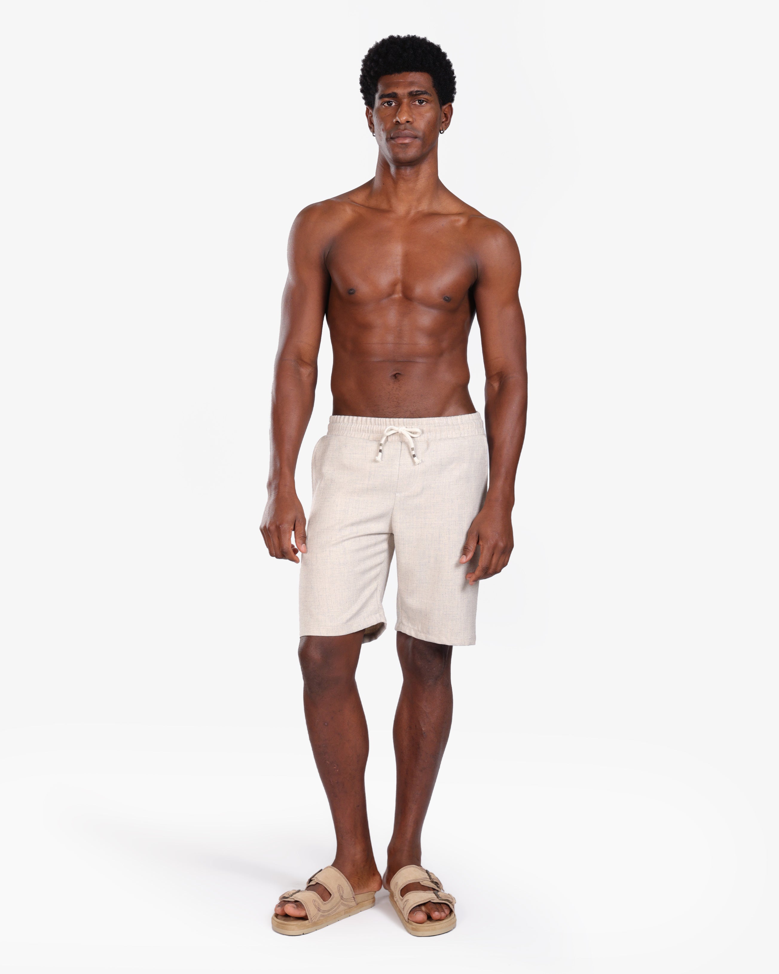 Crafted from a breathable linen-blend fabric, these beige drawstring shorts deliver effortless comfort and timeless style. Designed with a relaxed fit, they feature an elastic waistband with adjustable drawstrings for a secure yet flexible feel. The subtle woven texture adds a refined finish, making them versatile for both casual outings and elevated summer looks.