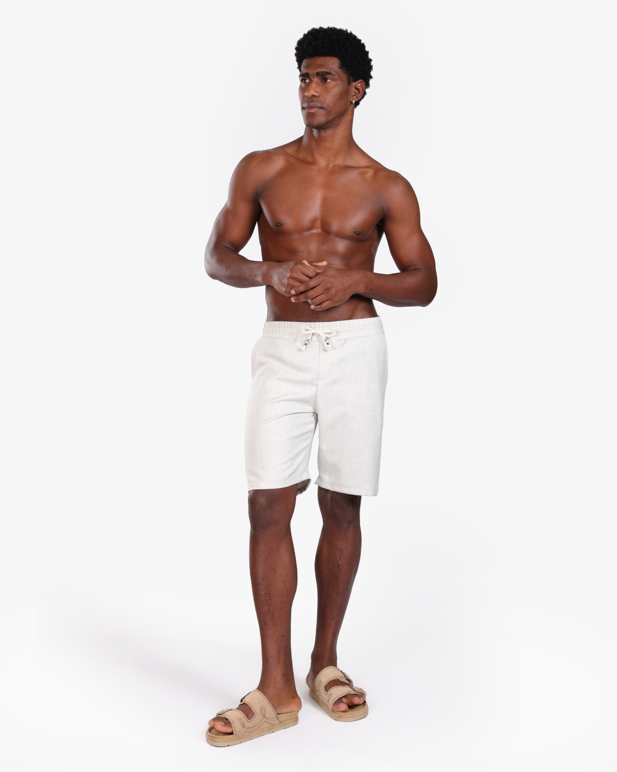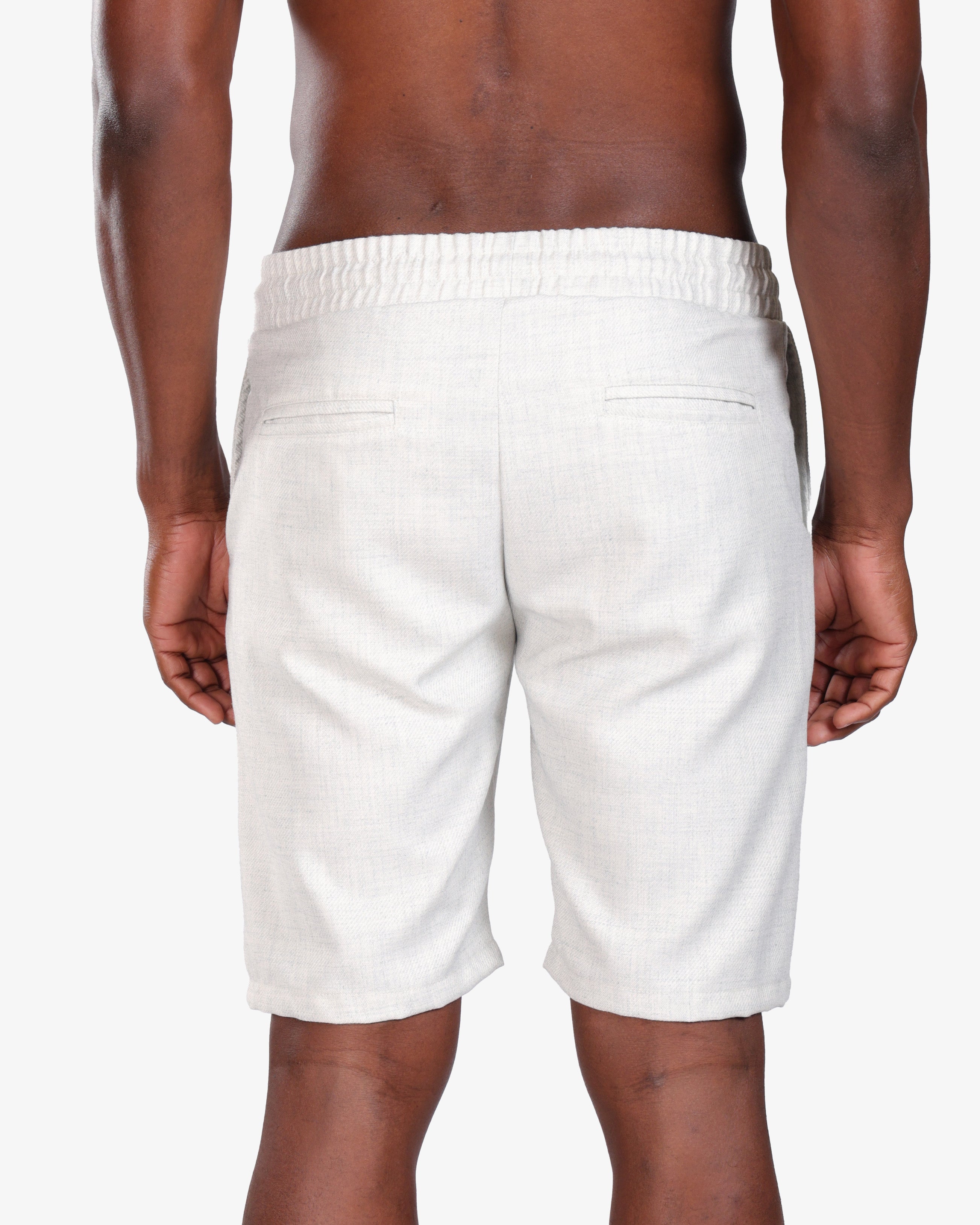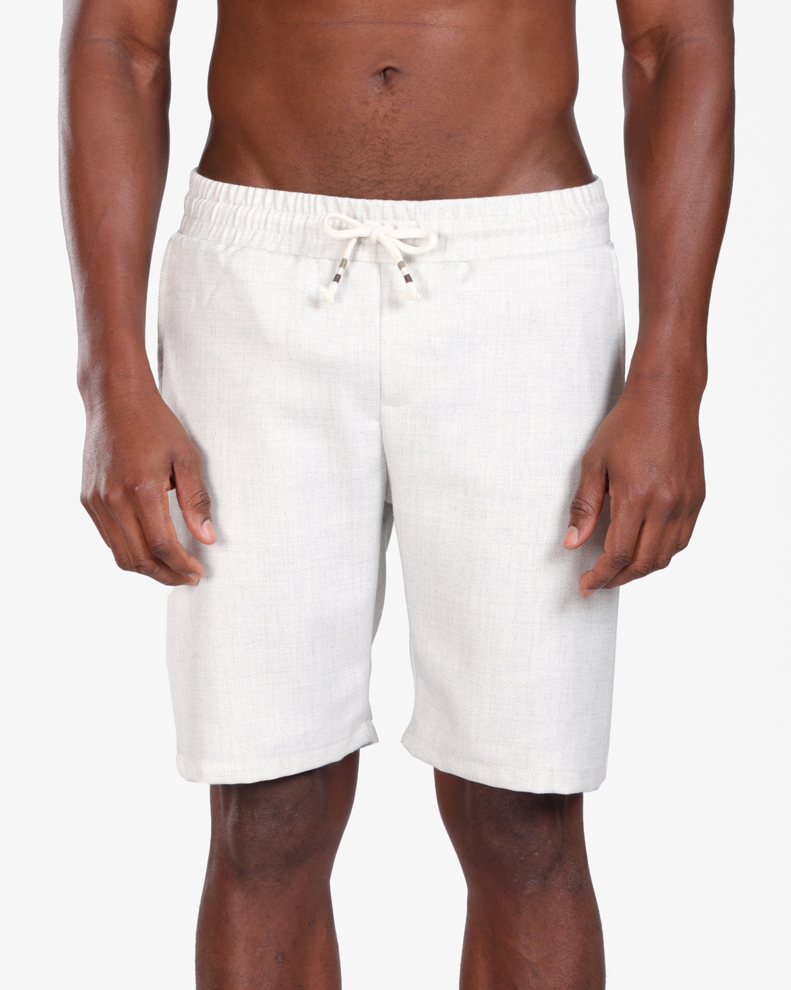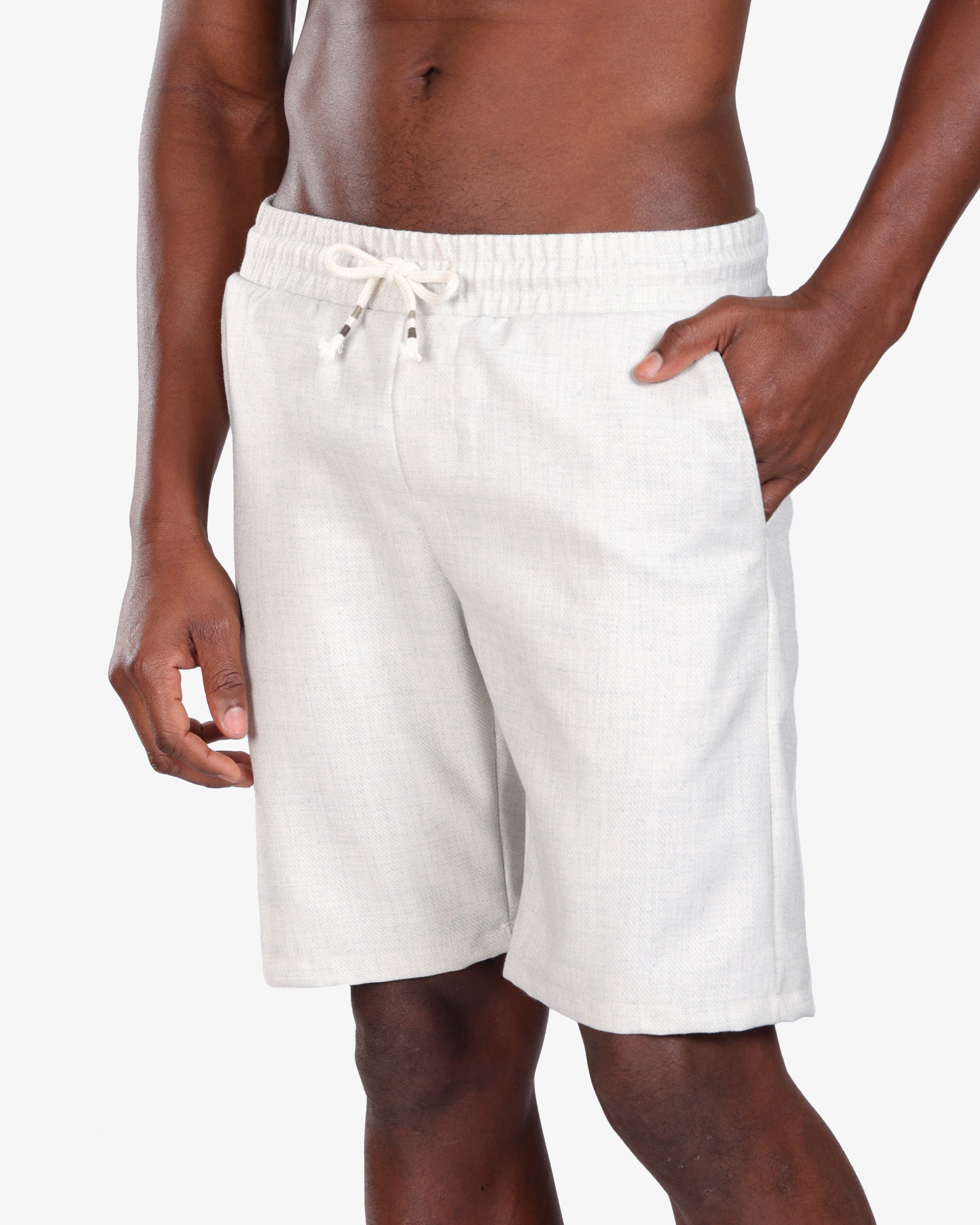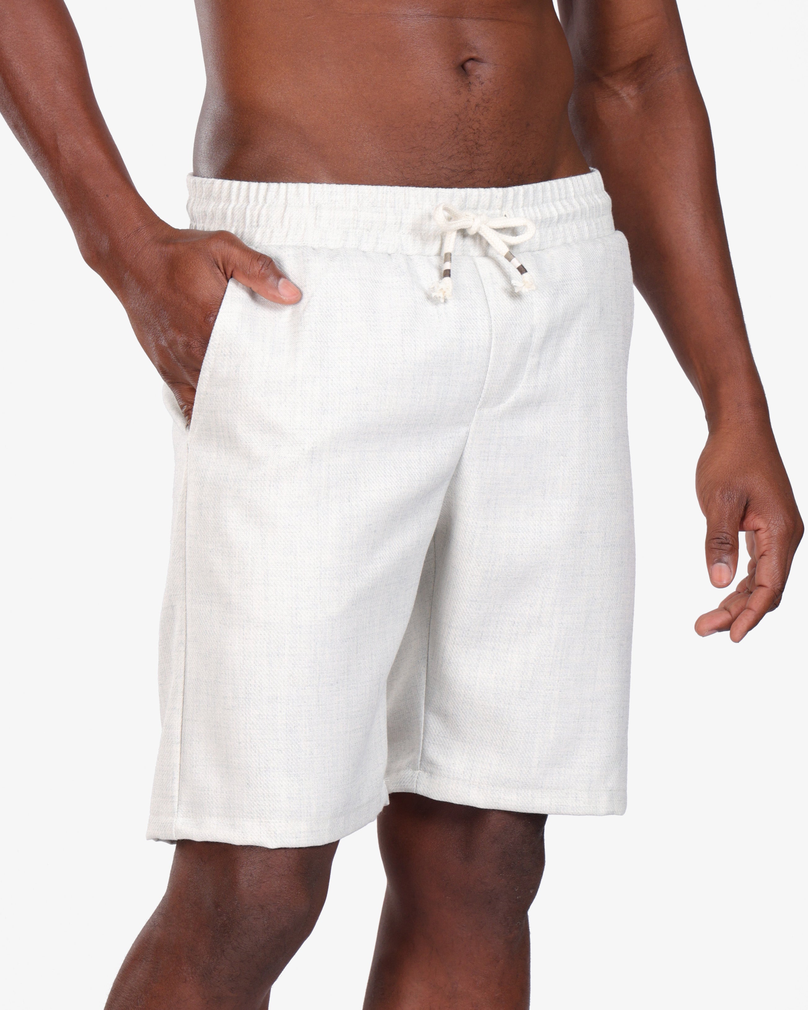Crafted from a breathable linen-blend fabric, these off-white drawstring shorts deliver effortless comfort and timeless style. Designed with a relaxed fit, they feature an elastic waistband with adjustable drawstrings for a secure yet flexible feel. The subtle woven texture adds a refined finish, making them versatile for both casual outings and elevated summer looks.