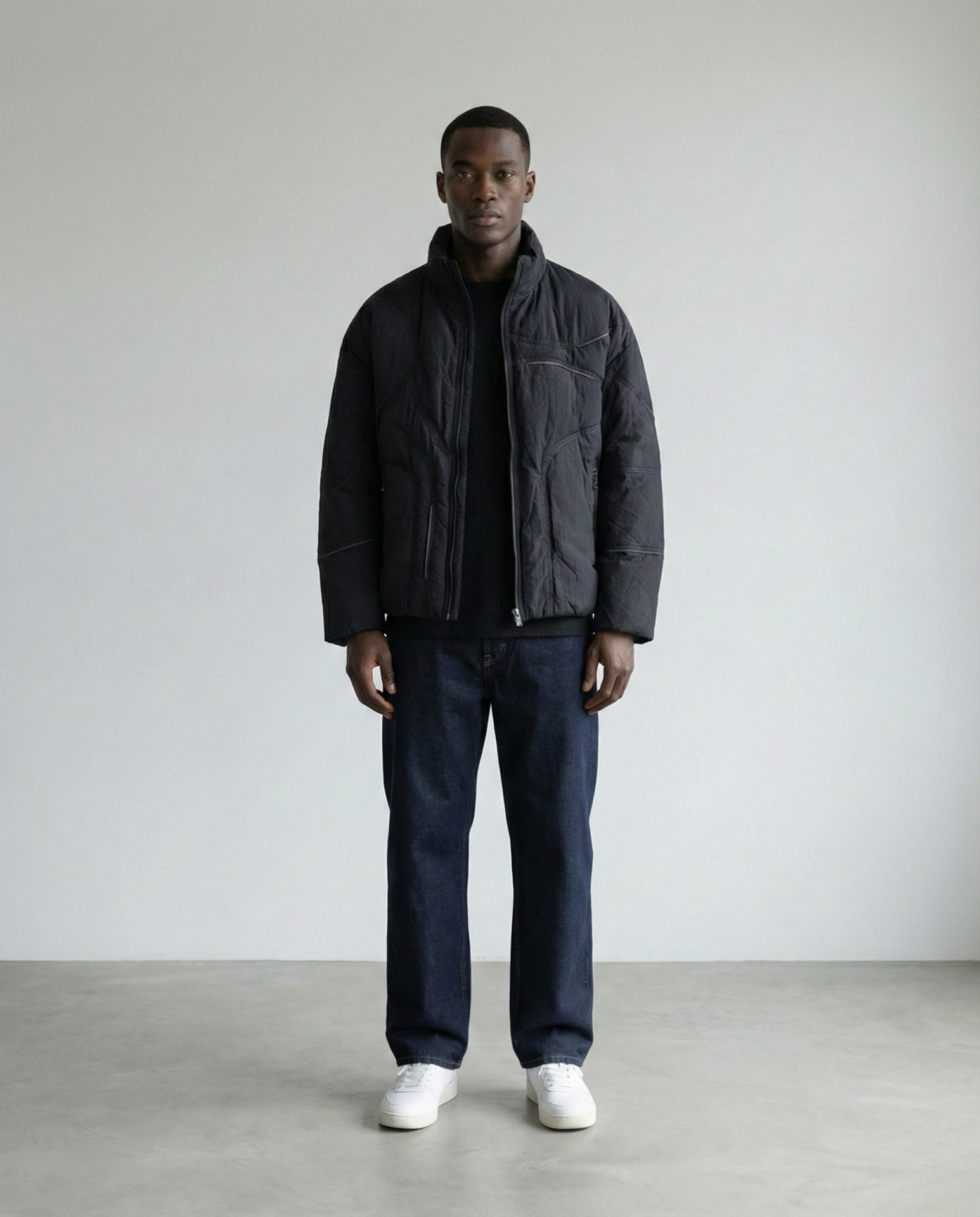 A dynamic quilted puffer jacket with technical contour stitching and a sharp modern silhouette. Designed with a sleek stand collar, asymmetric curved quilt lines, and contrast trim details that highlight its structured geometry. Features full front zipper closure, zipped side pockets, and an angled chest zipper pocket for a refined utility touch. Lightweight padding offers warmth without bulk, while the durable shell maintains a crisp, textured look. A perfect blend of urban functionality and clean minimal aesthetics.