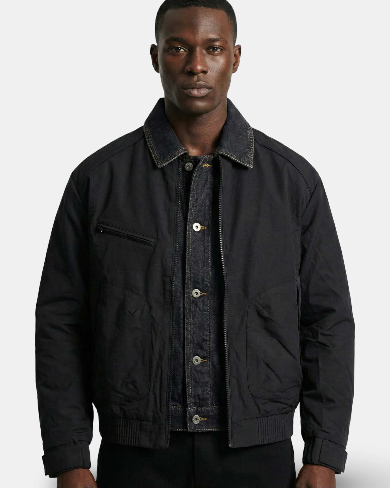 - Layered bomber jacket with shirt-style collar