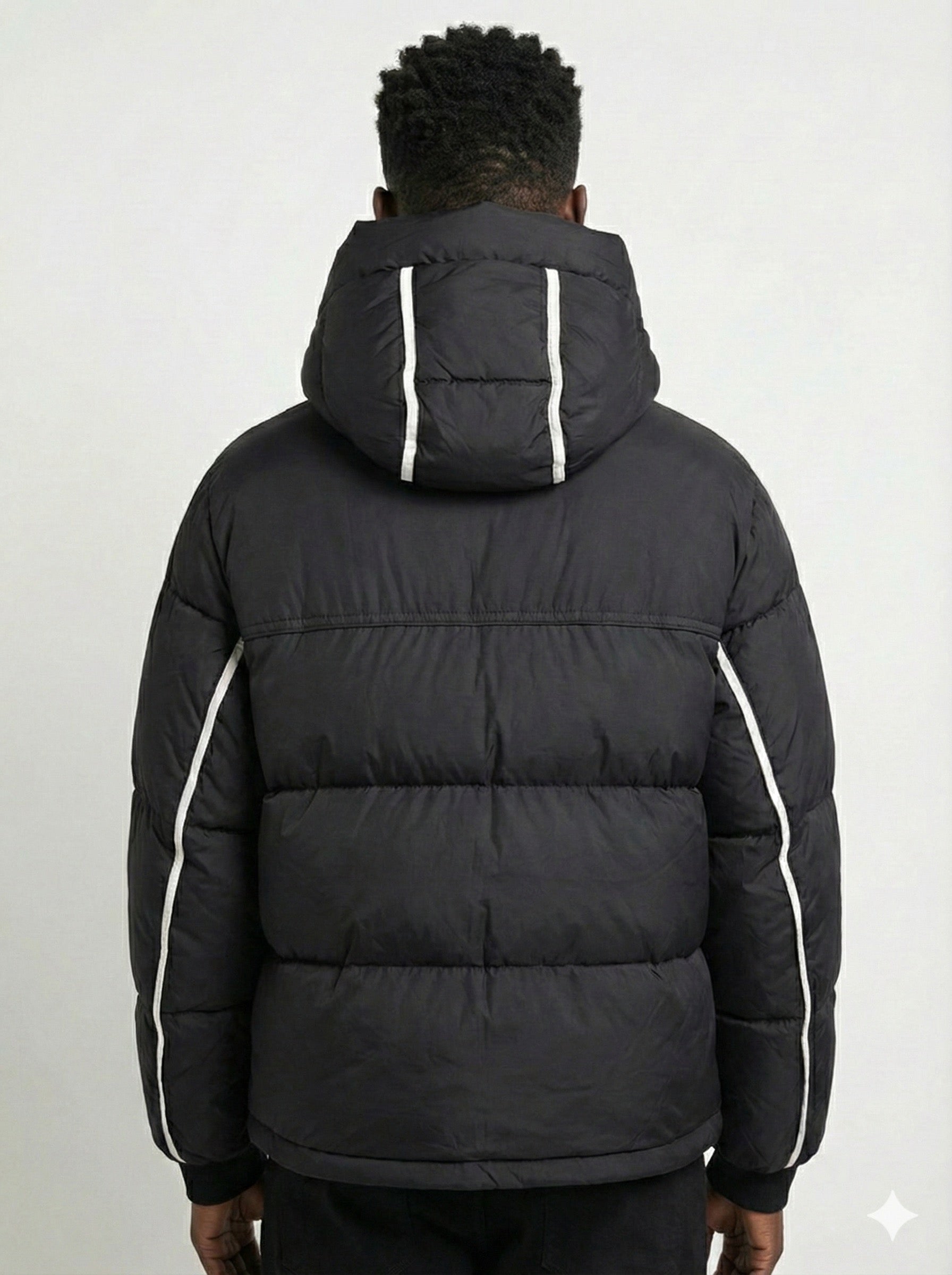 Dark, structured, and quietly elevated — this puffer jacket delivers a clean winter aesthetic with a modern contrast finish. Crafted in deep midnight black with a smooth matte shell, it features subtle white contrast piping along the zipper, sleeves, and pockets — adding refined definition to its minimal silhouette without disrupting the sleek, editorial look.