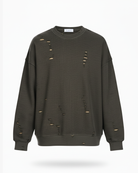Crafted from textured waffle-knit fabric, the piece features intentional distressing throughout the body, sleeves, and neckline — creating a raw yet refined worn-in aesthetic that feels lived-in, not worn out.