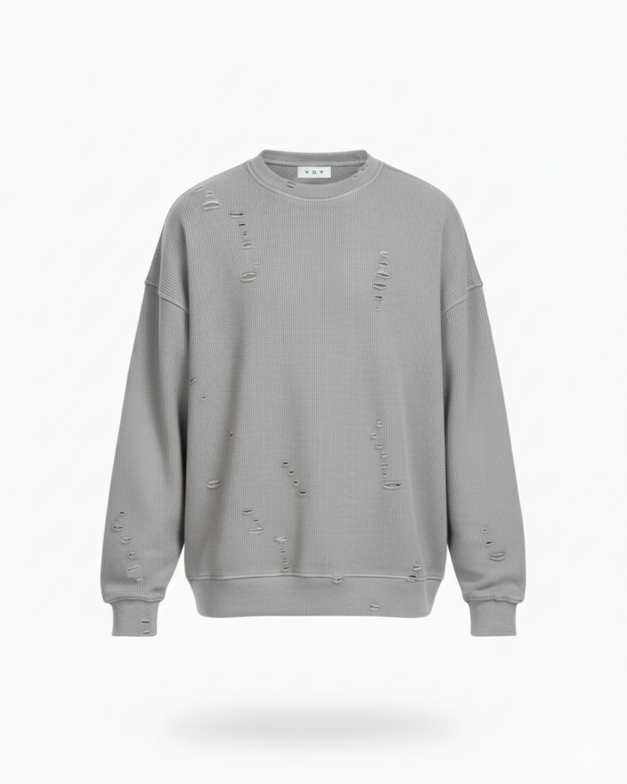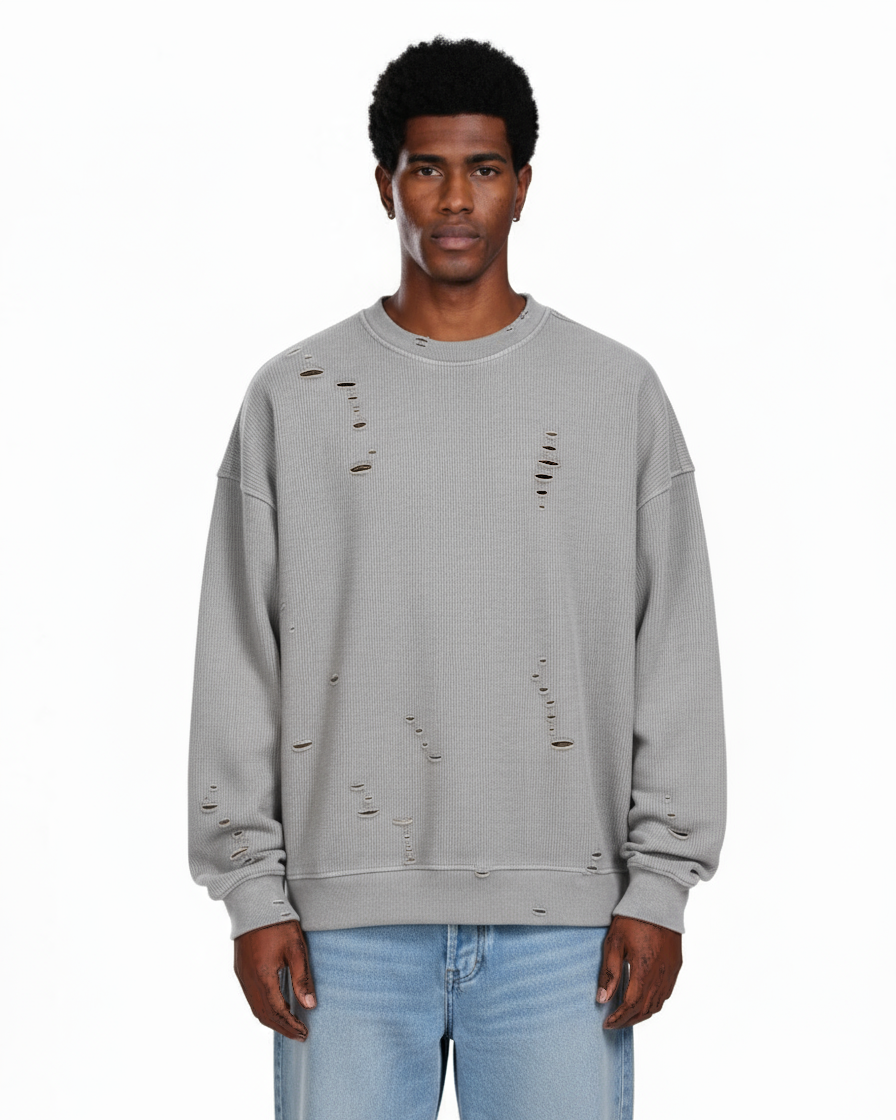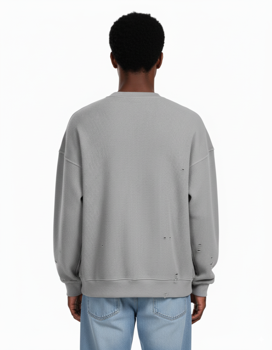 Designed with a relaxed silhouette and classic ribbed crew neckline, it delivers a clean drop on the body with an effortless casual appeal. The waffle texture adds depth and character, while the distress touches elevate it into a statement piece — subtle yet bold, modern yet timeless.