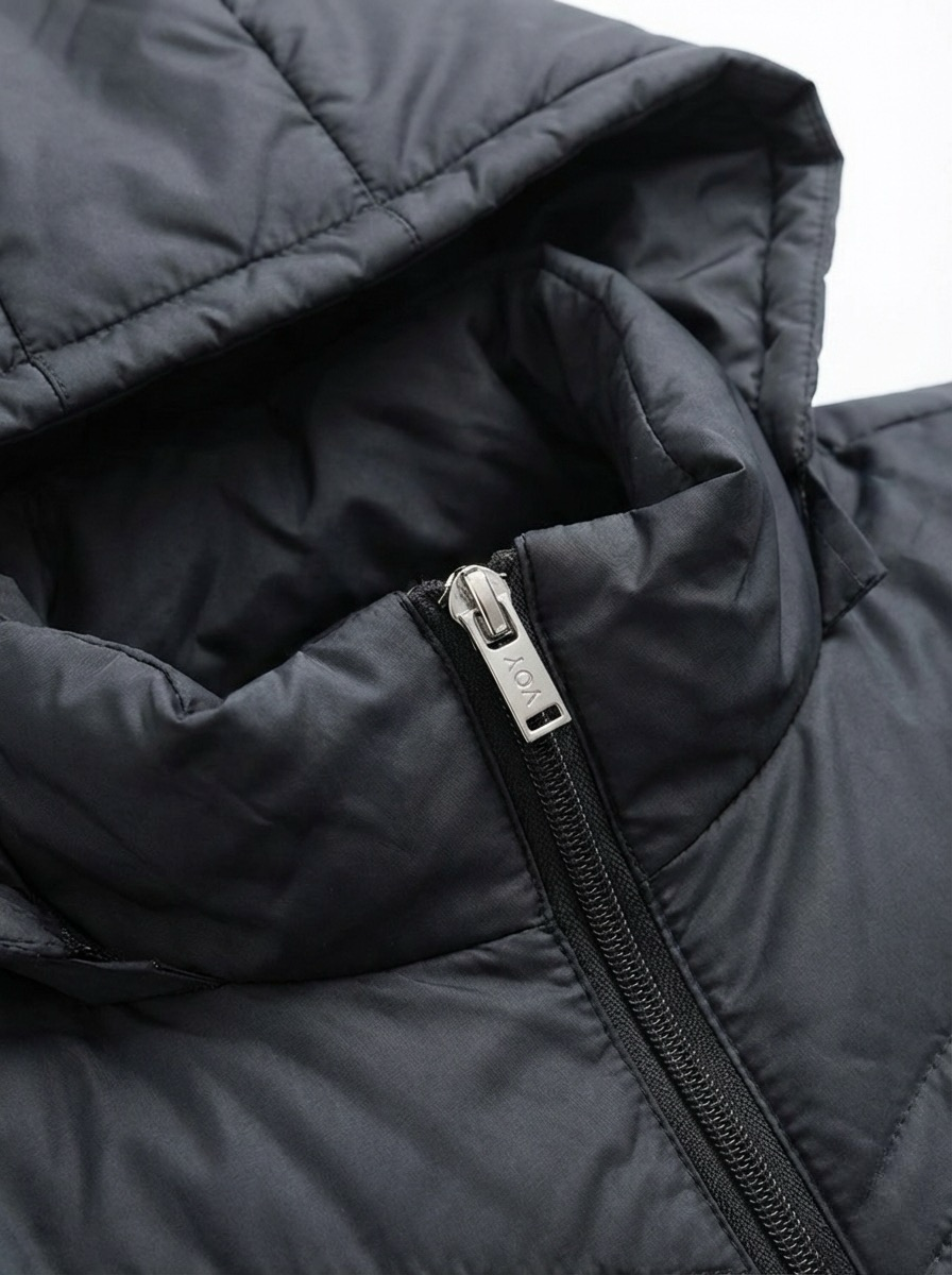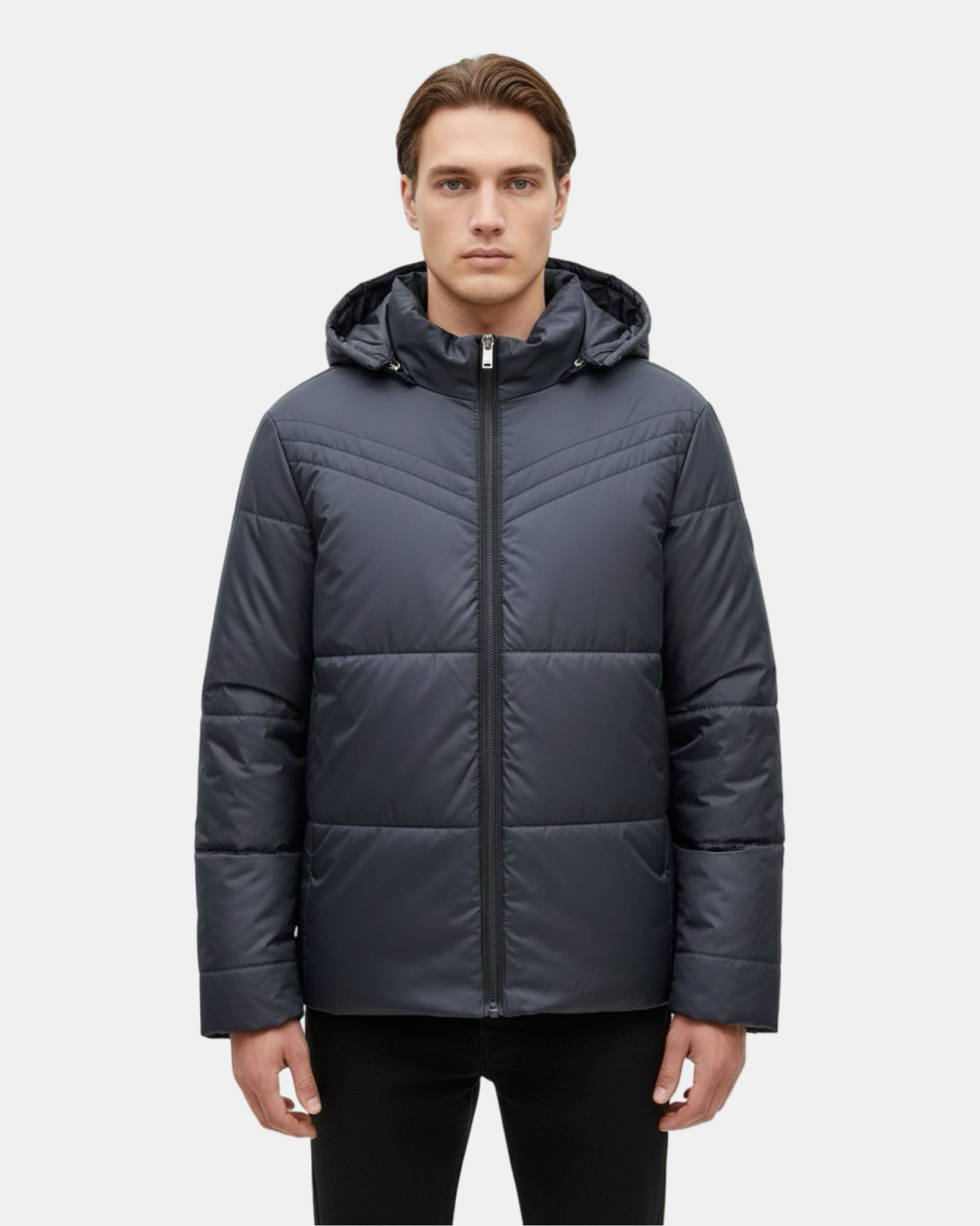 Designed with subtle V-shaped quilted lines across the chest for a defined look, integrated adjustable hood, and full-length zipper closure for enhanced protection against cold weather. The jacket retains a sleek streamlined profile without unnecessary bulk, making it ideal for both urban layering and cold outdoor settings.