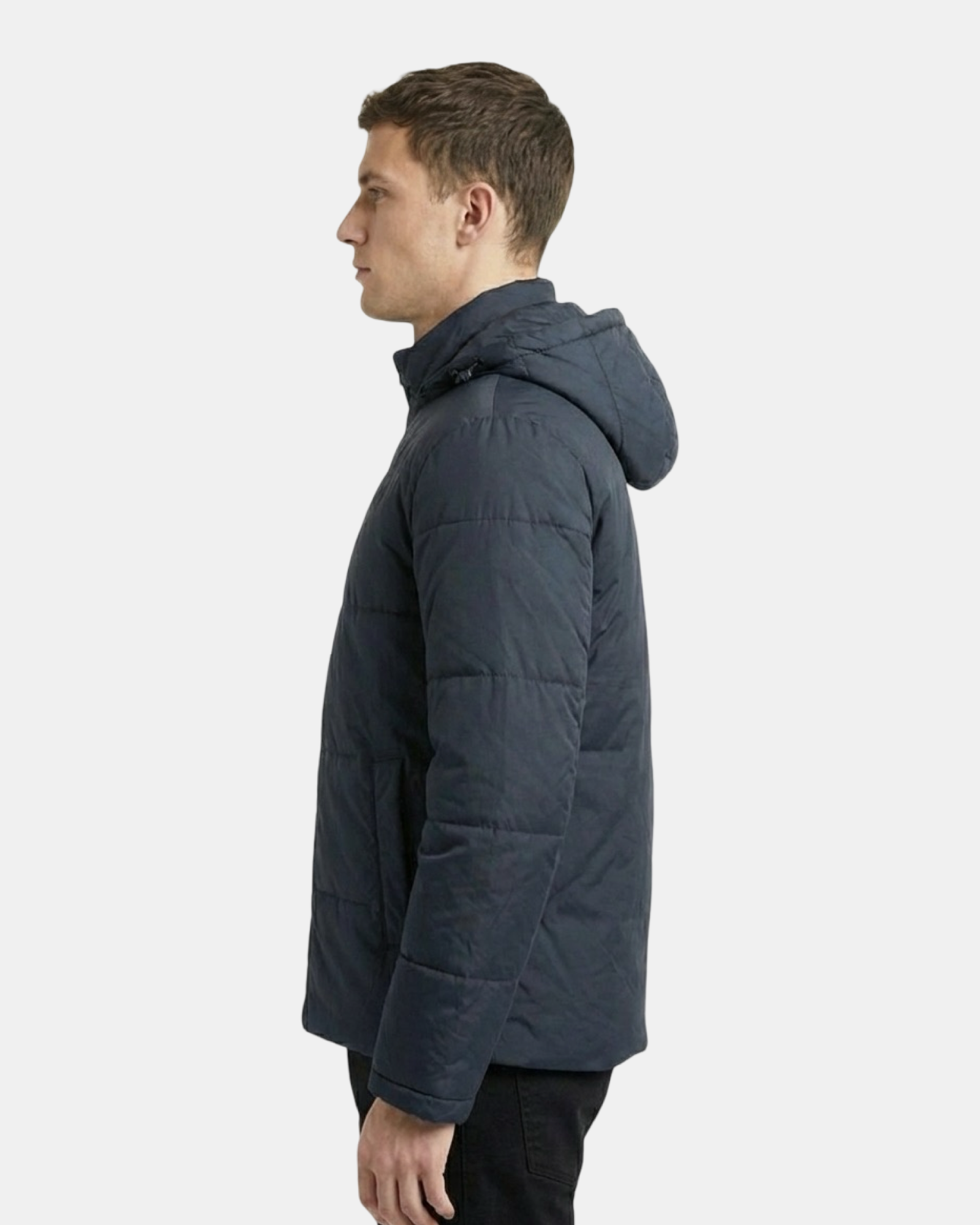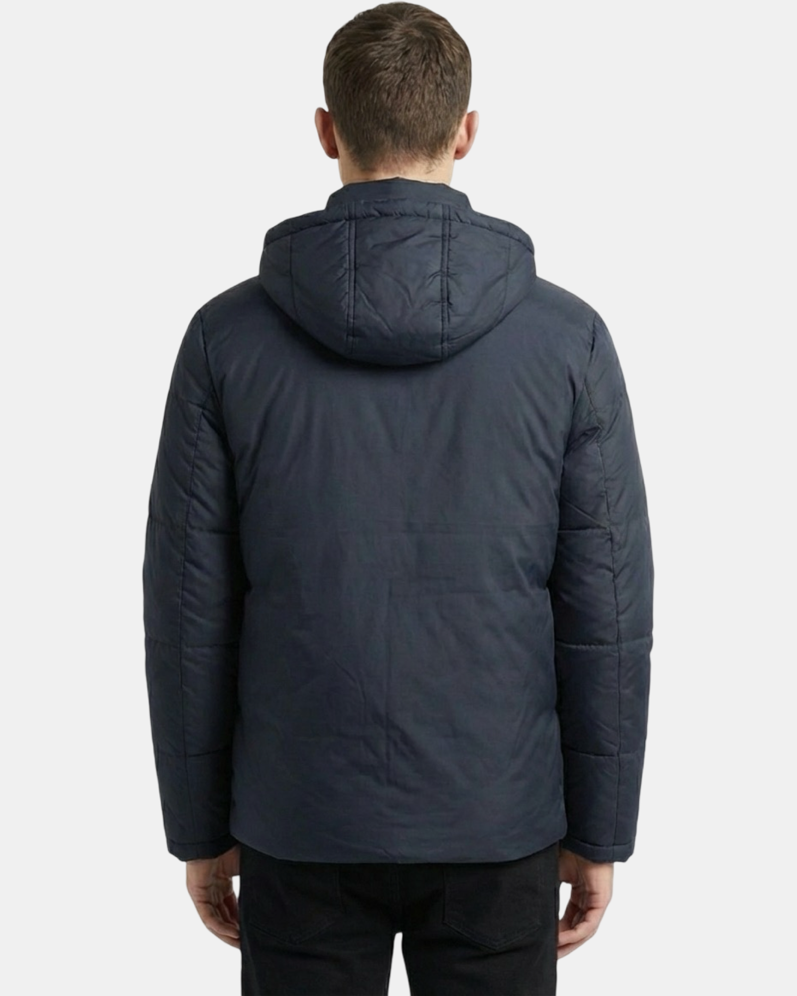 The Midnight Navy Padded Hooded Puffer W25N features a clean, structured silhouette with lightweight insulation and a matte finish — blending modern minimalism with functional performance.
