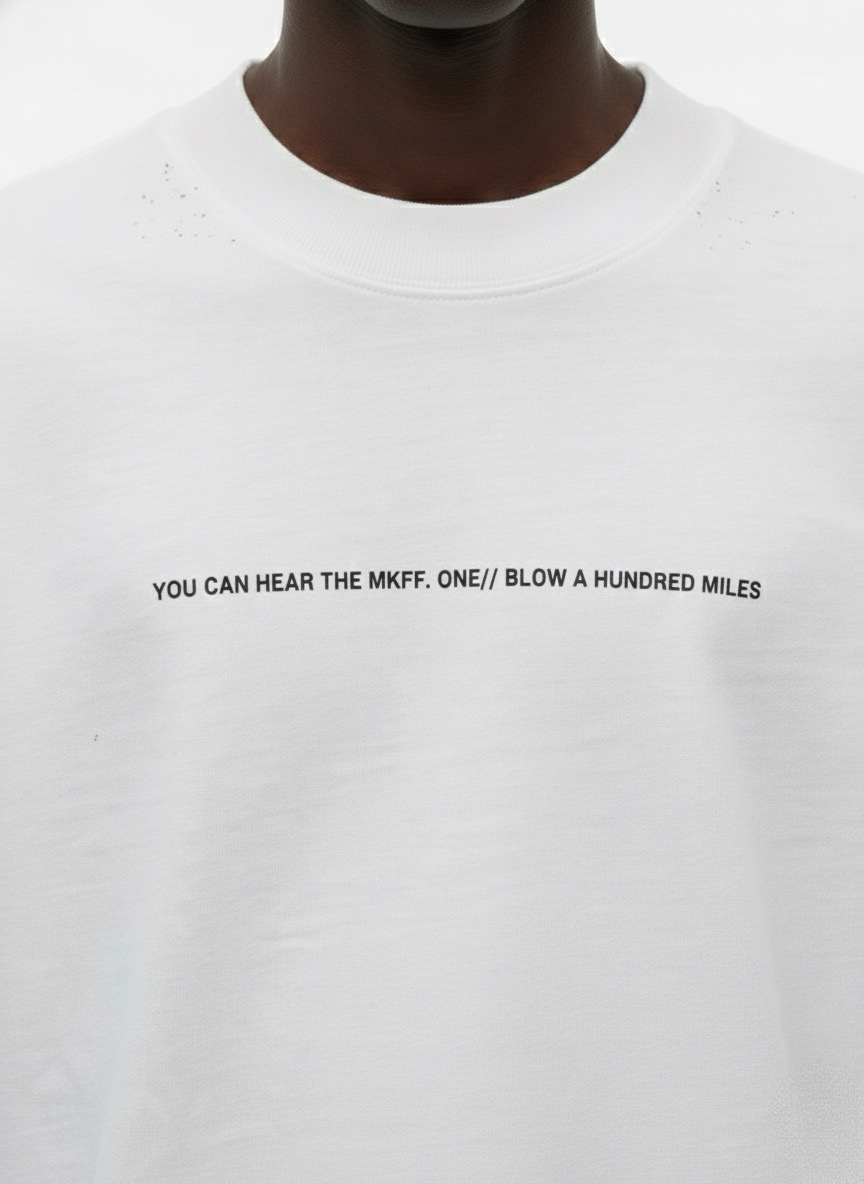 At the chest, a fine-line black typographic graphic adds subtle character while keeping the look refined and understated. The raw unfinished hem enhances the effortless look, giving it a modern unpolished edge without compromising comfort or quality.