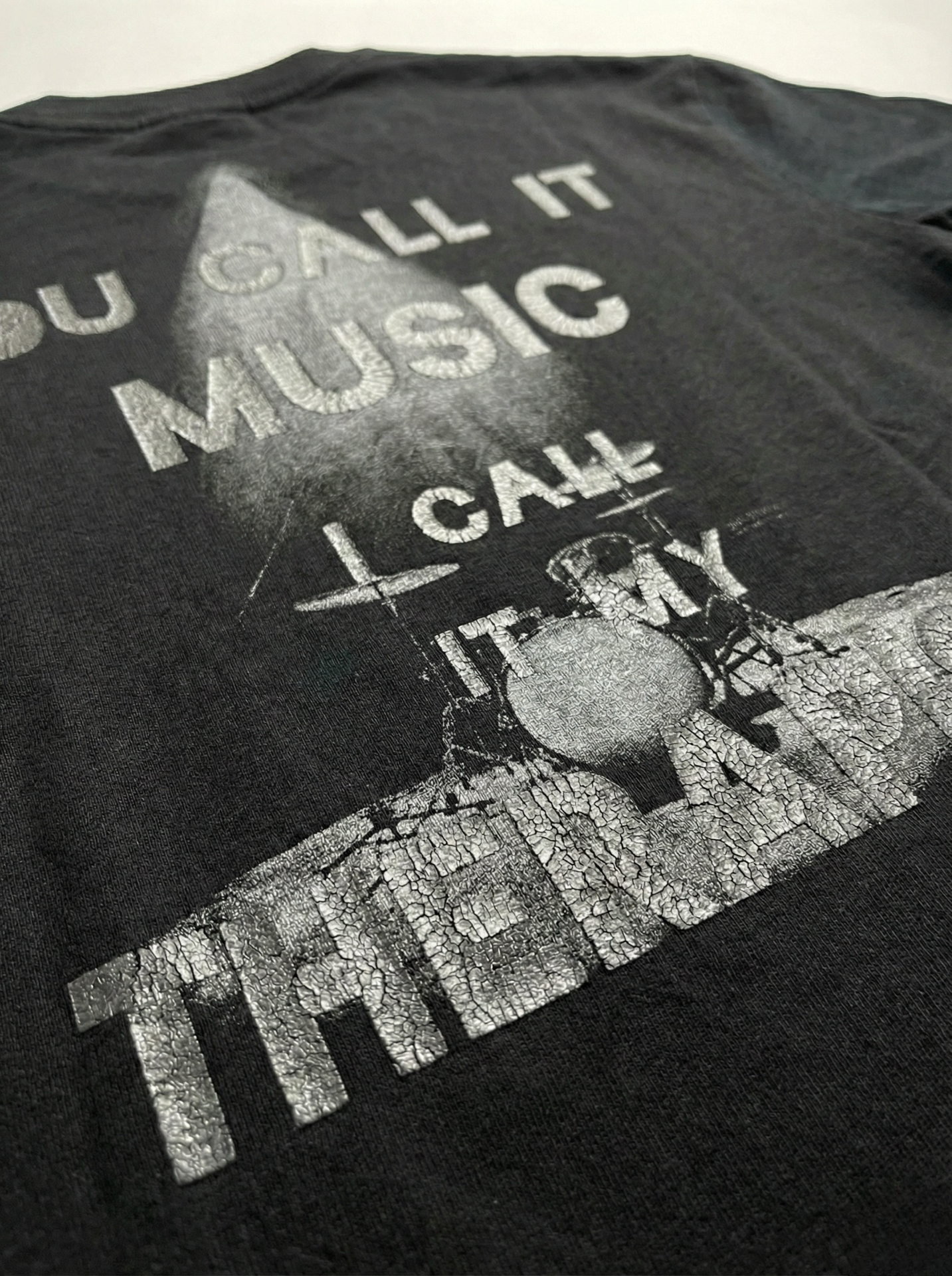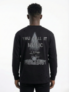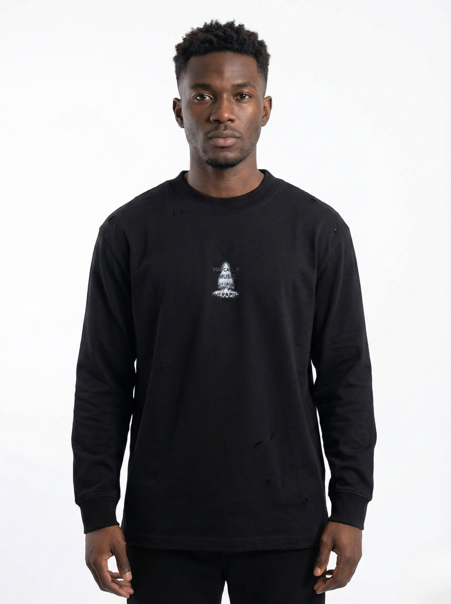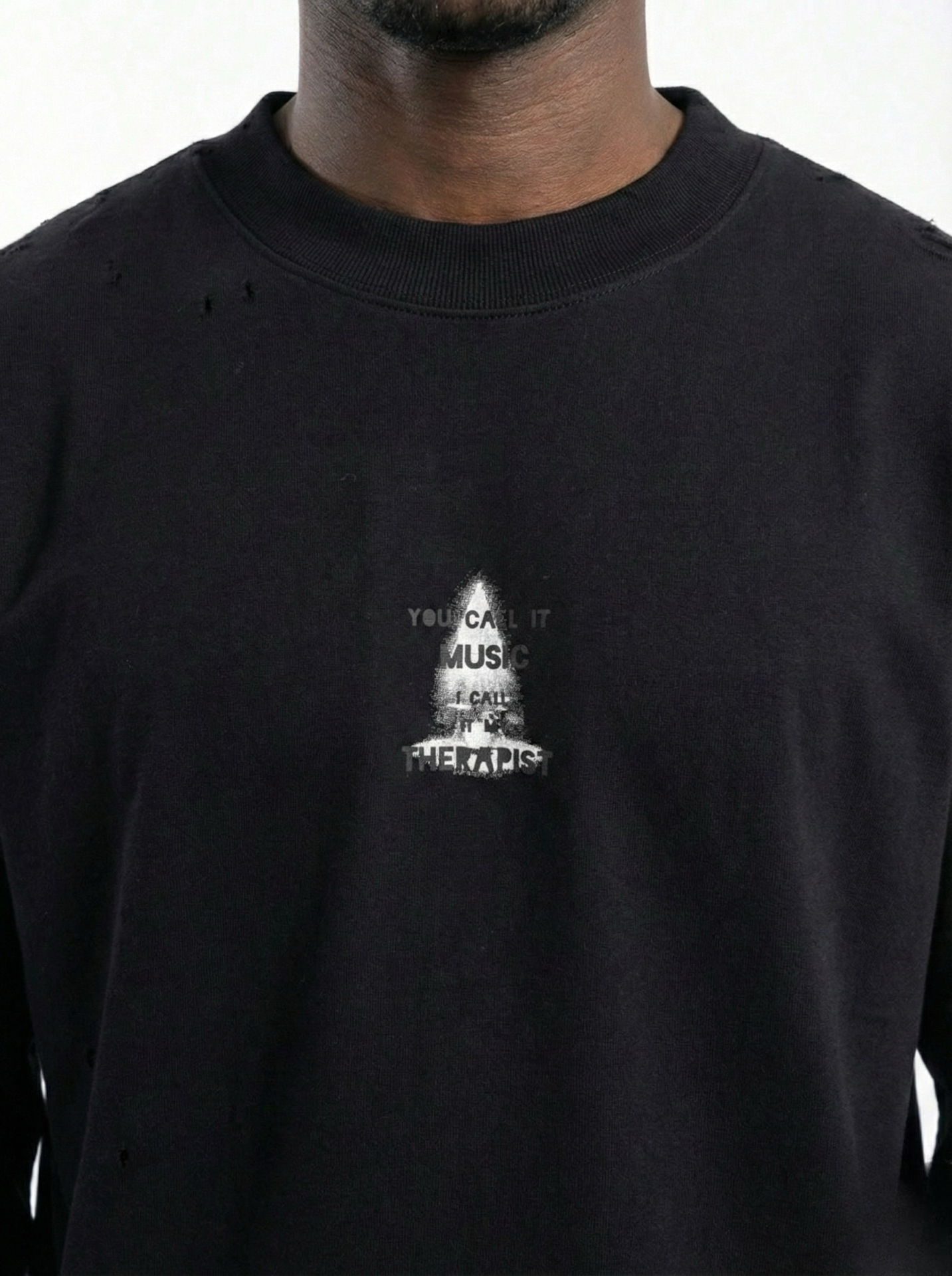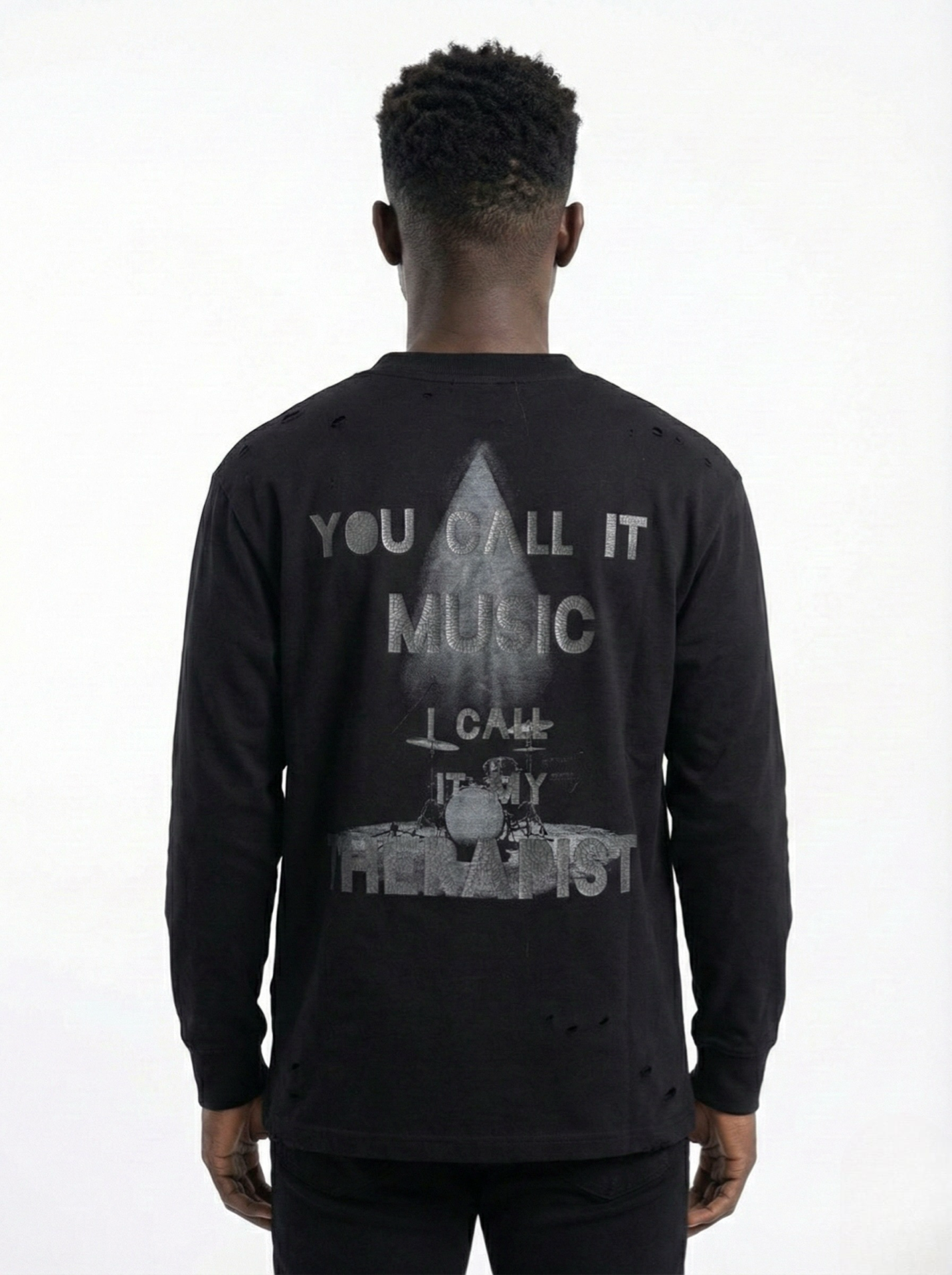 The front features a minimalist faded graphic print placed at the center chest, while the back showcases a bold full-sized artwork combining a spotlight graphic, drum illustration, and expressive typography: “YOU CALL IT MUSIC, I CALL IT MY THERAPIST” — capturing the emotional connection between sound and soul.