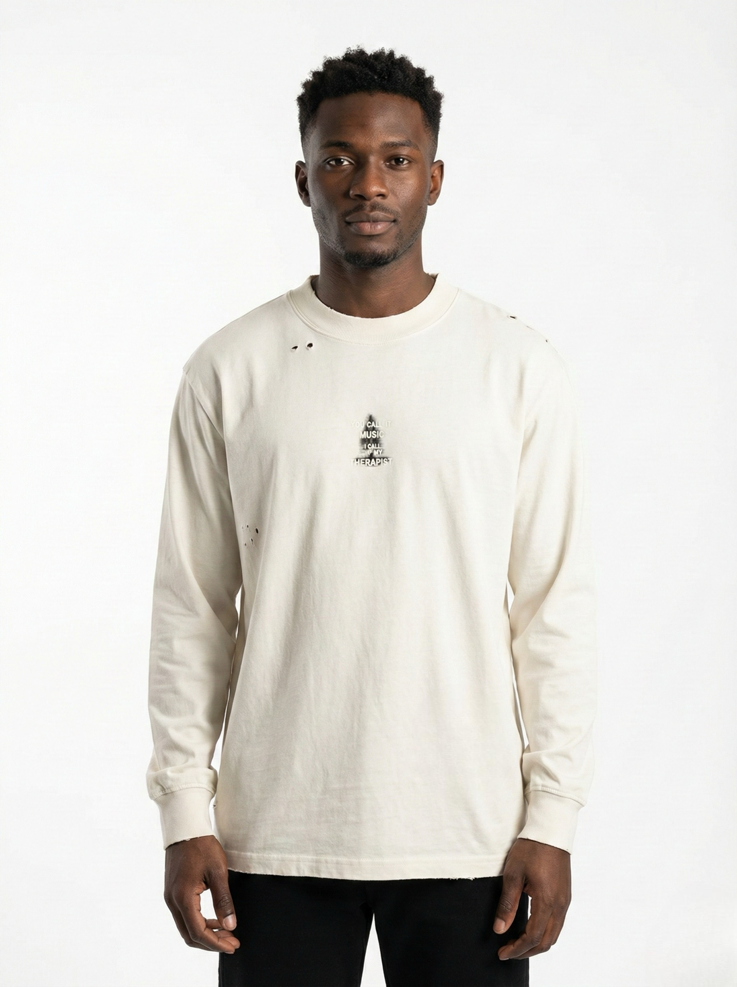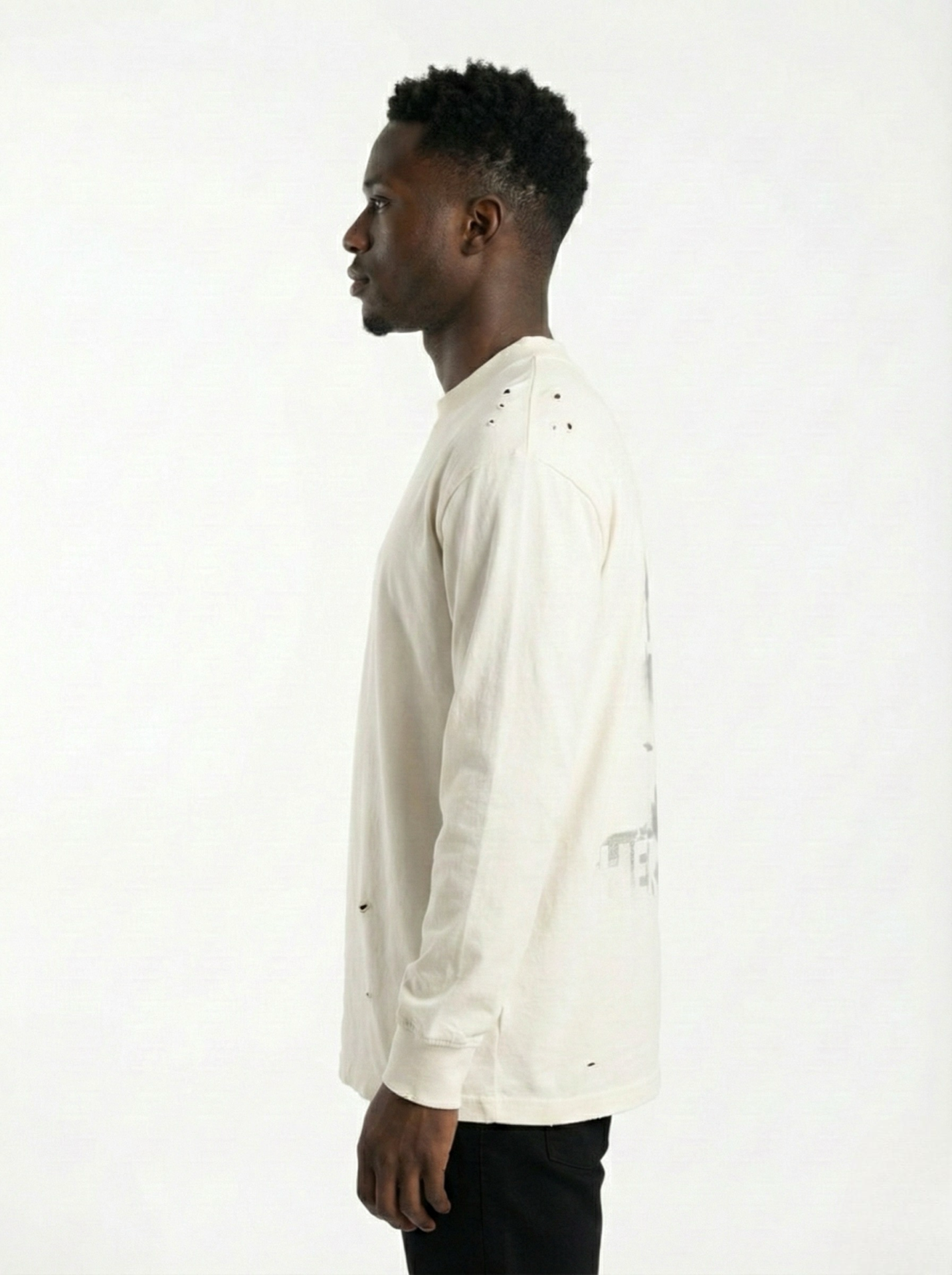 A clean yet expressive graphic long-sleeve tee, blending minimalist street style with raw vintage character. Made from premium soft-touch cotton in a muted milk white shade with a smooth matte surface and natural drape. Designed with a relaxed straight fit, ribbed neckline, and intentional distressed holes across the shoulders, chest, and hem — giving it a worn-in, authentic edge.