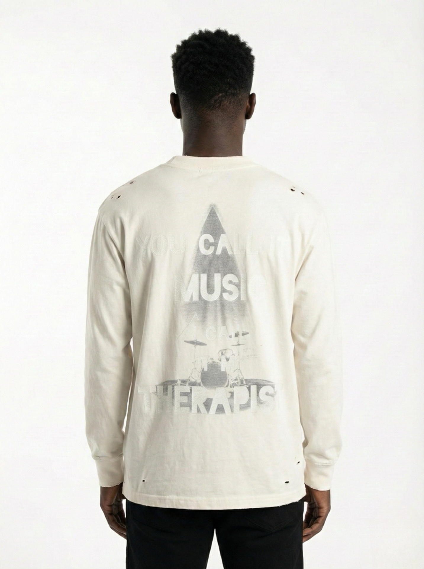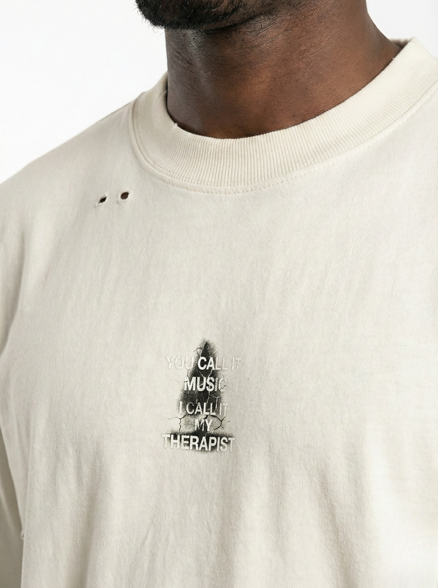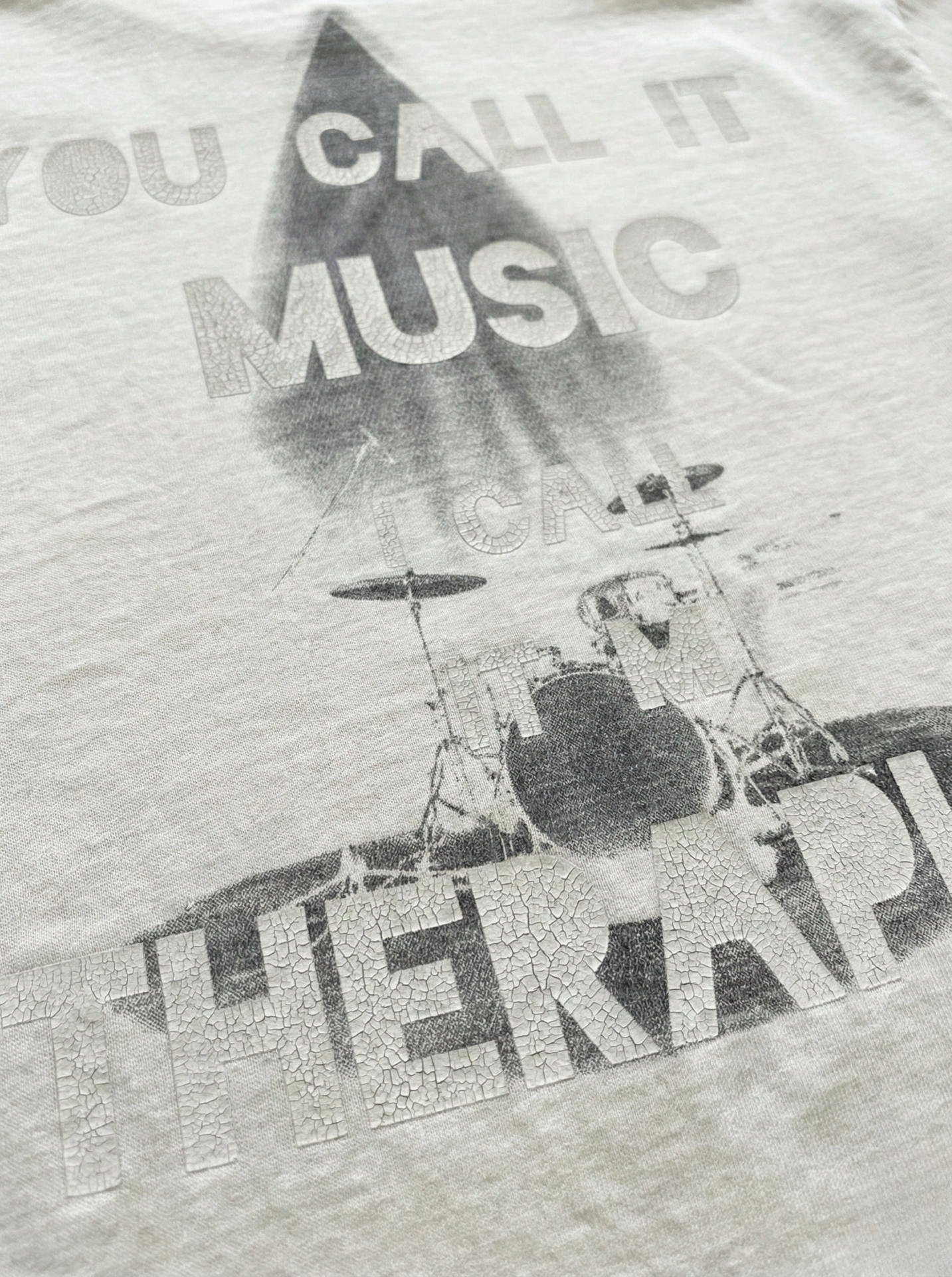 The front features a subtle, lightly faded mini graphic print at the center chest, while the back showcases a full statement artwork combining spotlight effects, drum illustration, and typography: “YOU CALL IT MUSIC, I CALL IT MY THERAPIST” — rendered in a washed-out grey tone for a naturally aged vintage look.