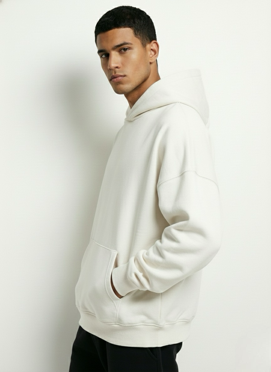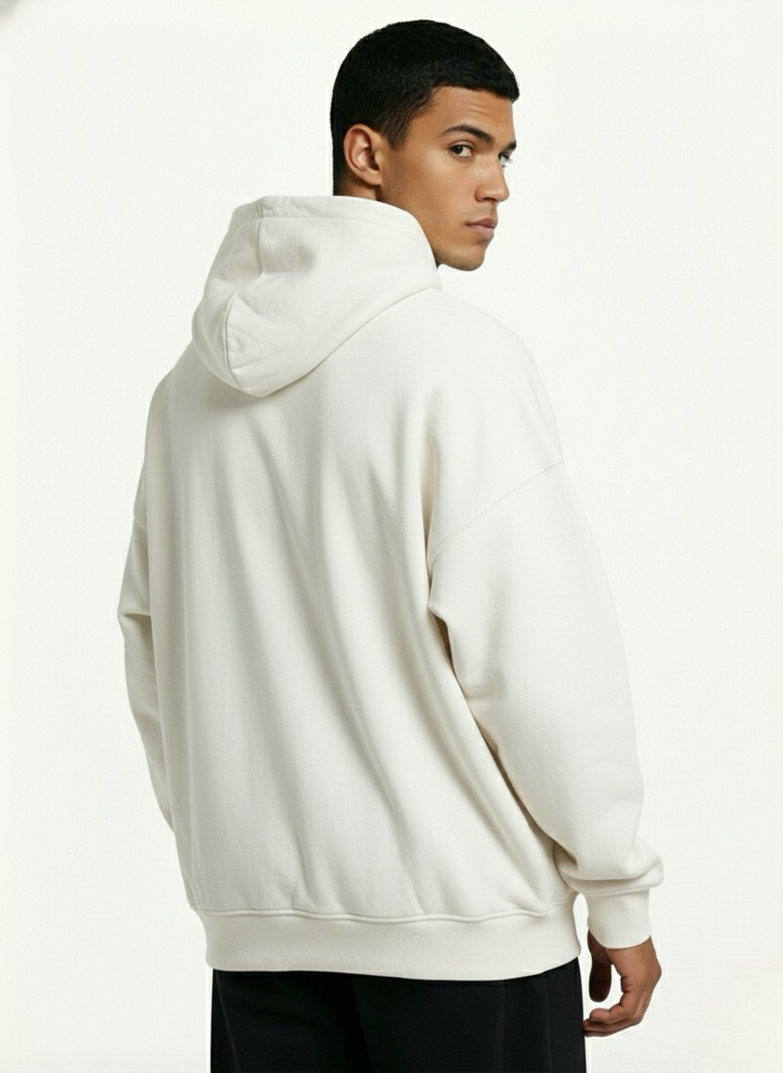 This lightweight oversized hoodie comes in a muted white tone — a refined, black blend designed for modern timeless wardrobes. Featuring a relaxed drop-shoulder silhouette with naturally loose sleeves, it delivers an airy drape without compromising structure.