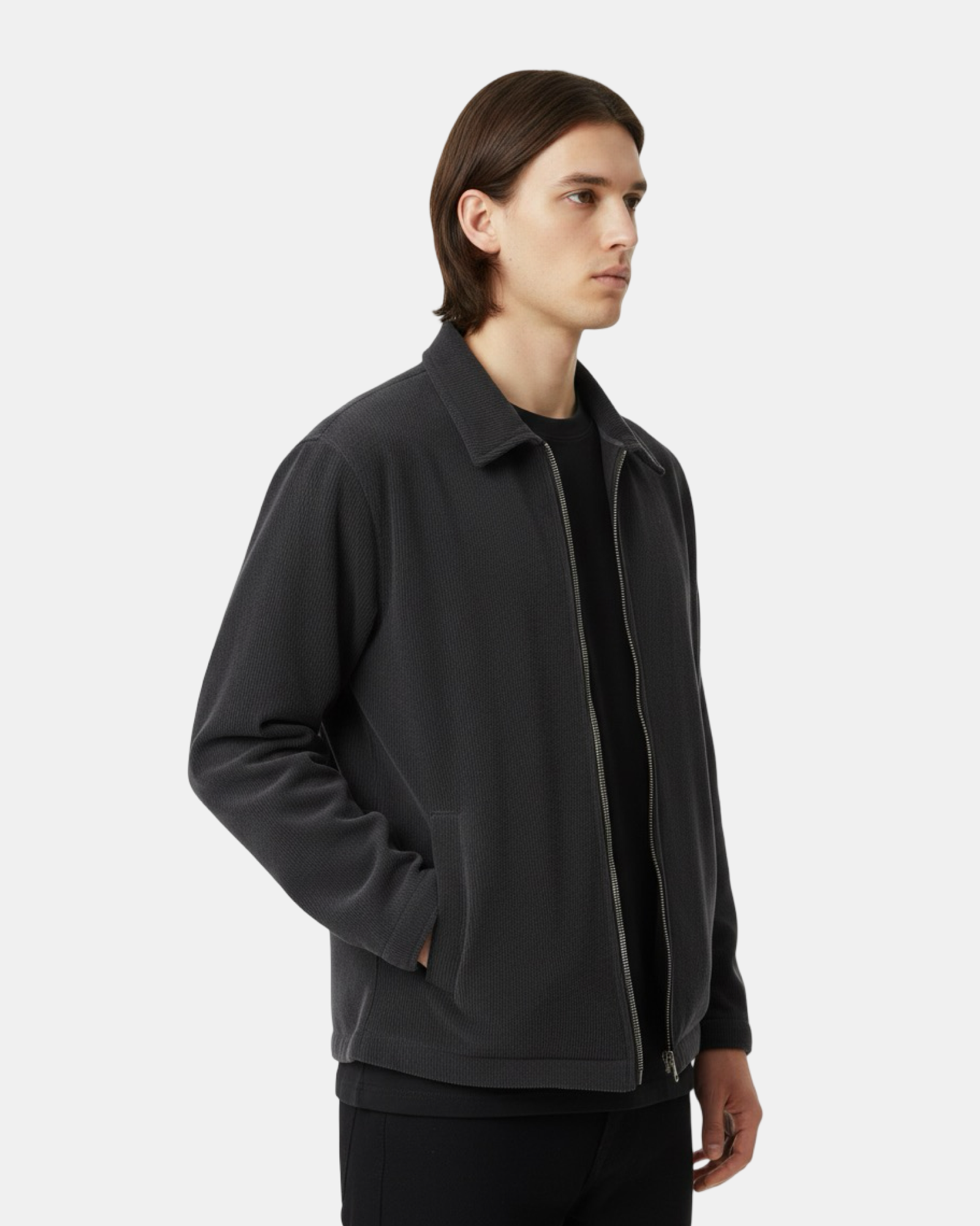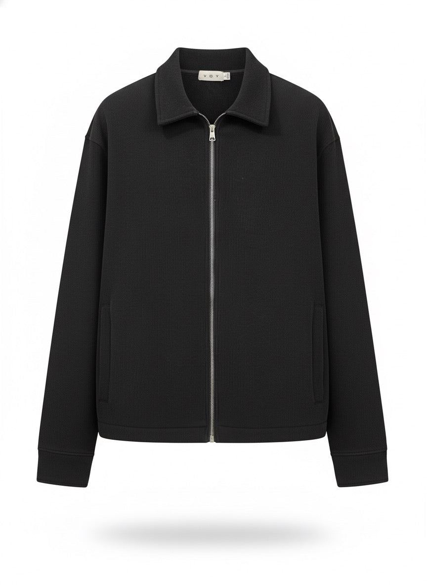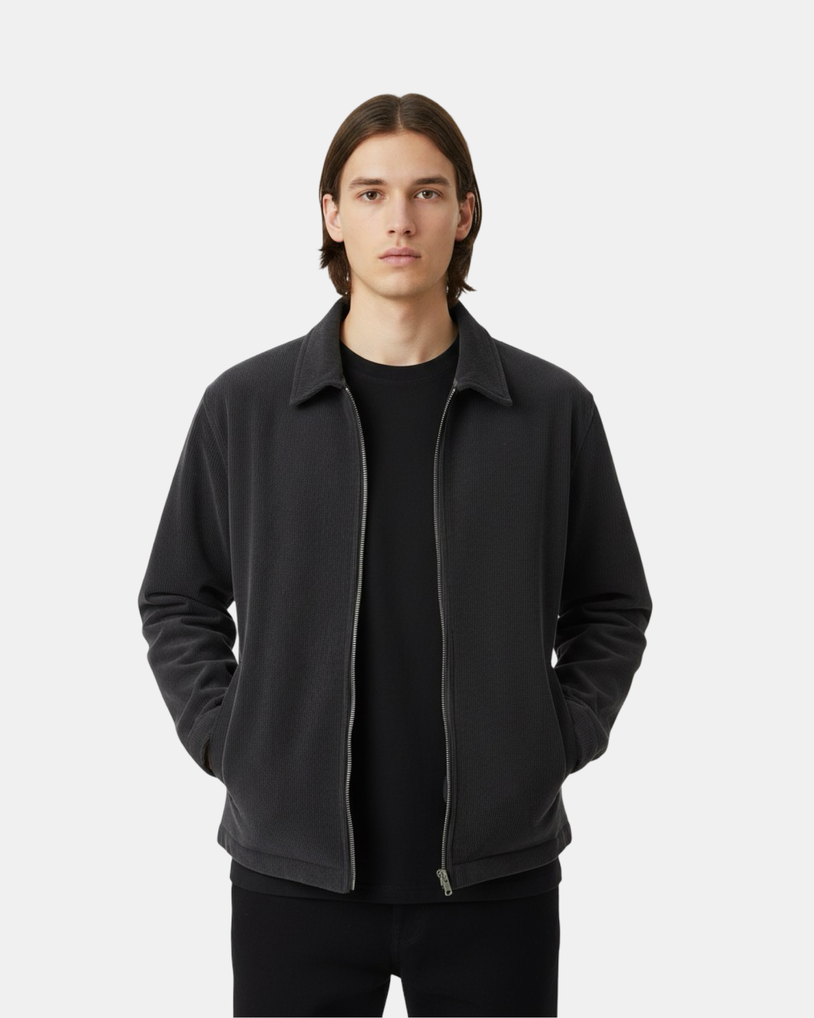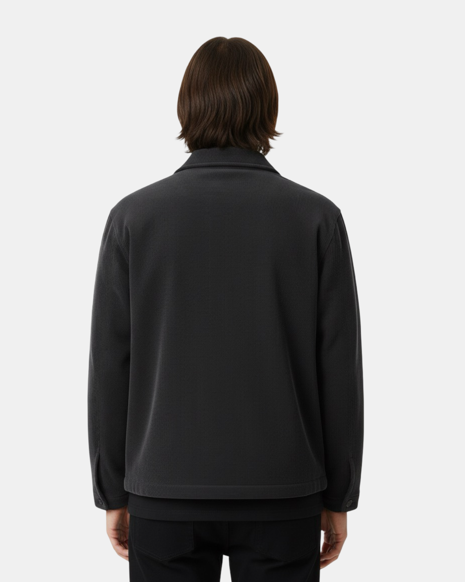 The black Corduroy Zip-Up Overshirt W25N merges timeless texture with modern refinement. Crafted from premium fine-wale corduroy and lined with soft velvety fabric on the inside, it offers both warmth and sophistication. Designed to function as a light jacket or layered overshirt, it delivers a structured silhouette and elevated comfort in a deep charcoal tone — perfect for transitional and cool-weather styling.