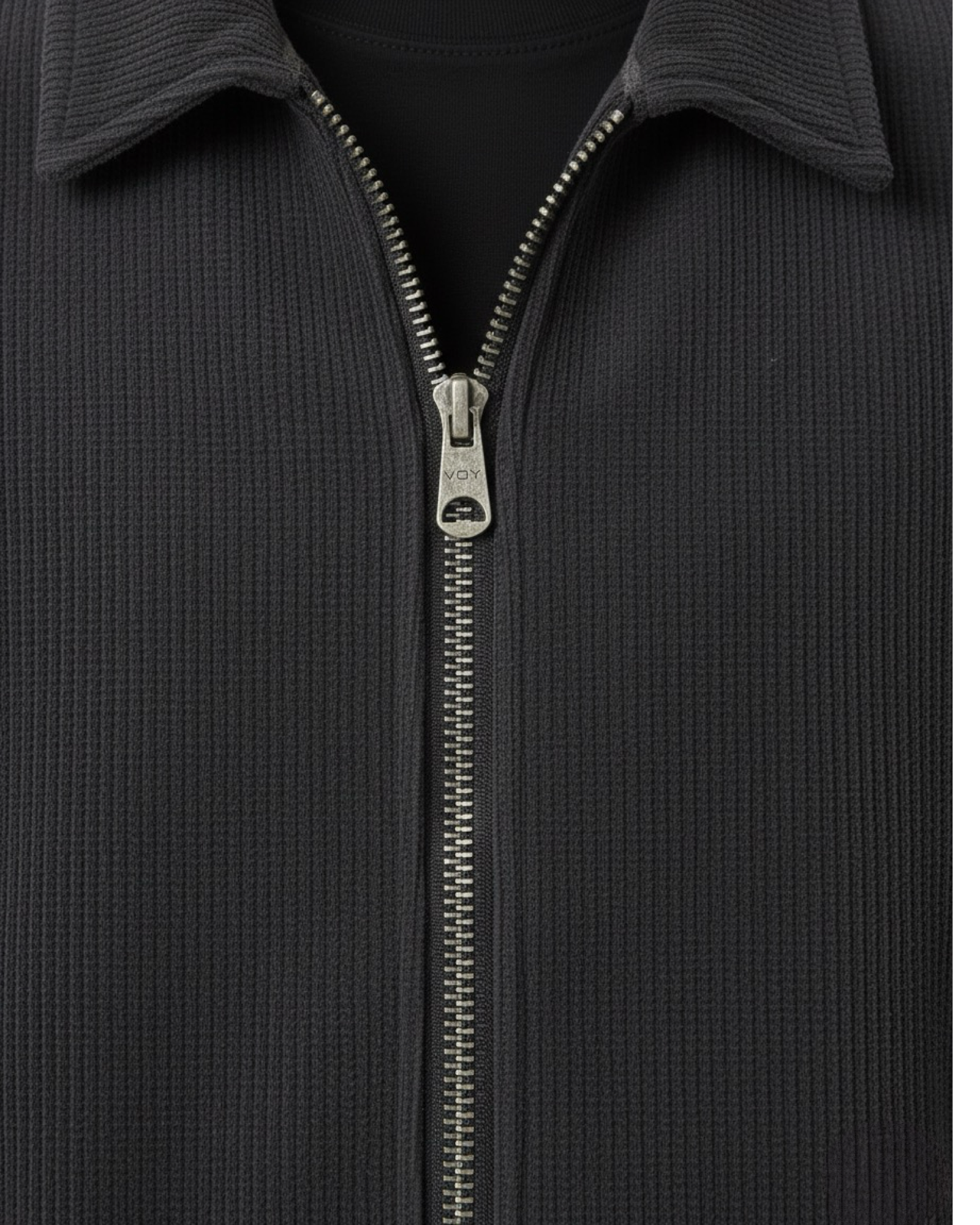 Full-length metal zipper with engraved VOY puller