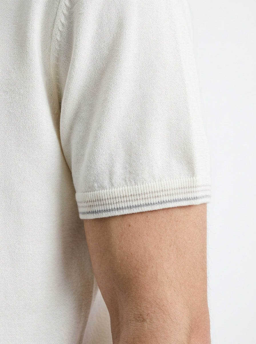 This off-white knit T-shirt is crafted from a premium soft-touch fabric, delivering a clean, refined look with a subtle elevated feel. The design is built around minimalism, enhanced by a contrast ribbed neckline that adds a sharp visual edge without compromising the overall simplicity.