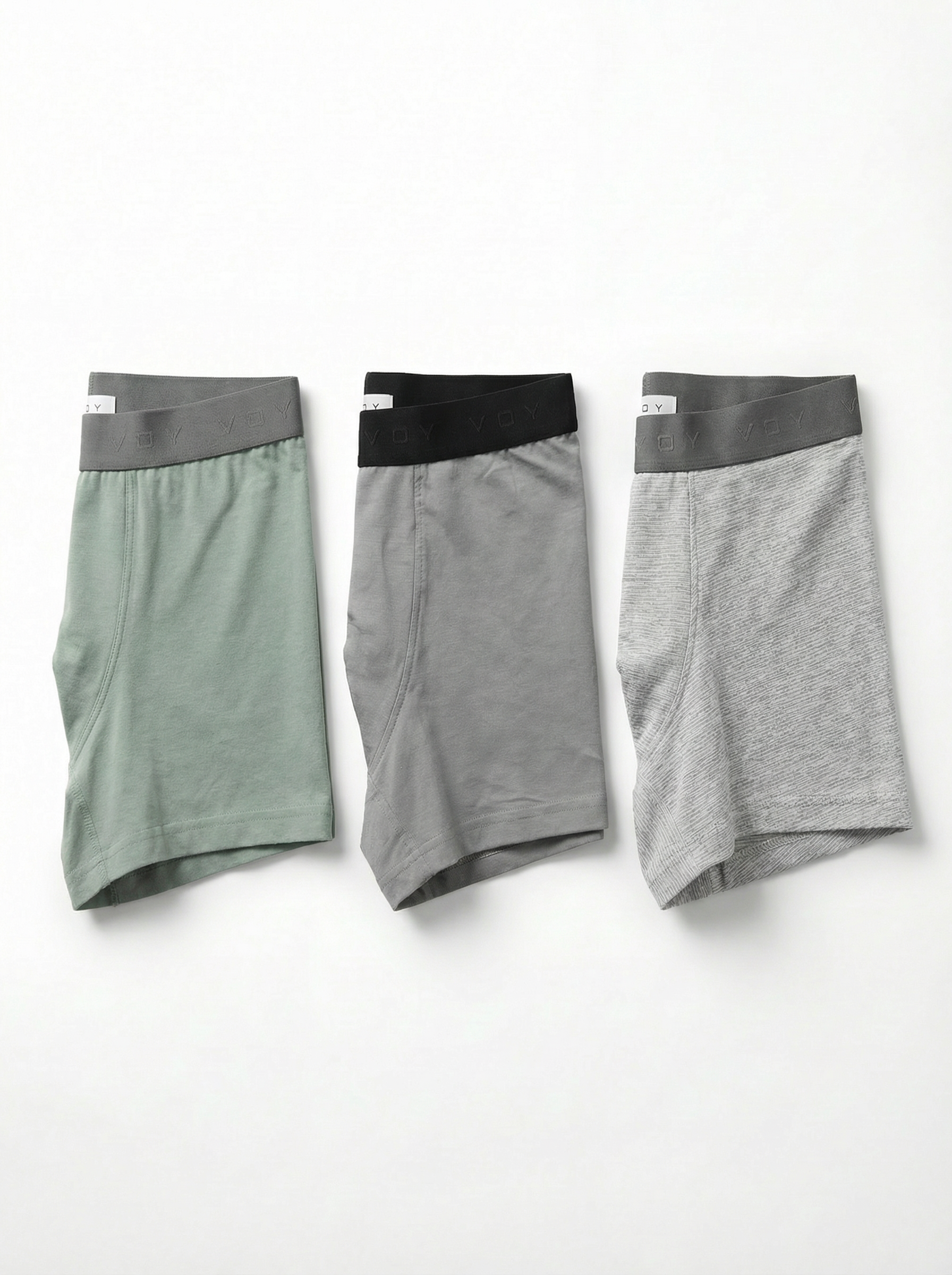 This curated trio features three balanced tones: muted sage green, smooth solid grey with black waistband contrast, and light heather grey with subtle texture. Designed to complement daily wear while maintaining a clean, modern look.