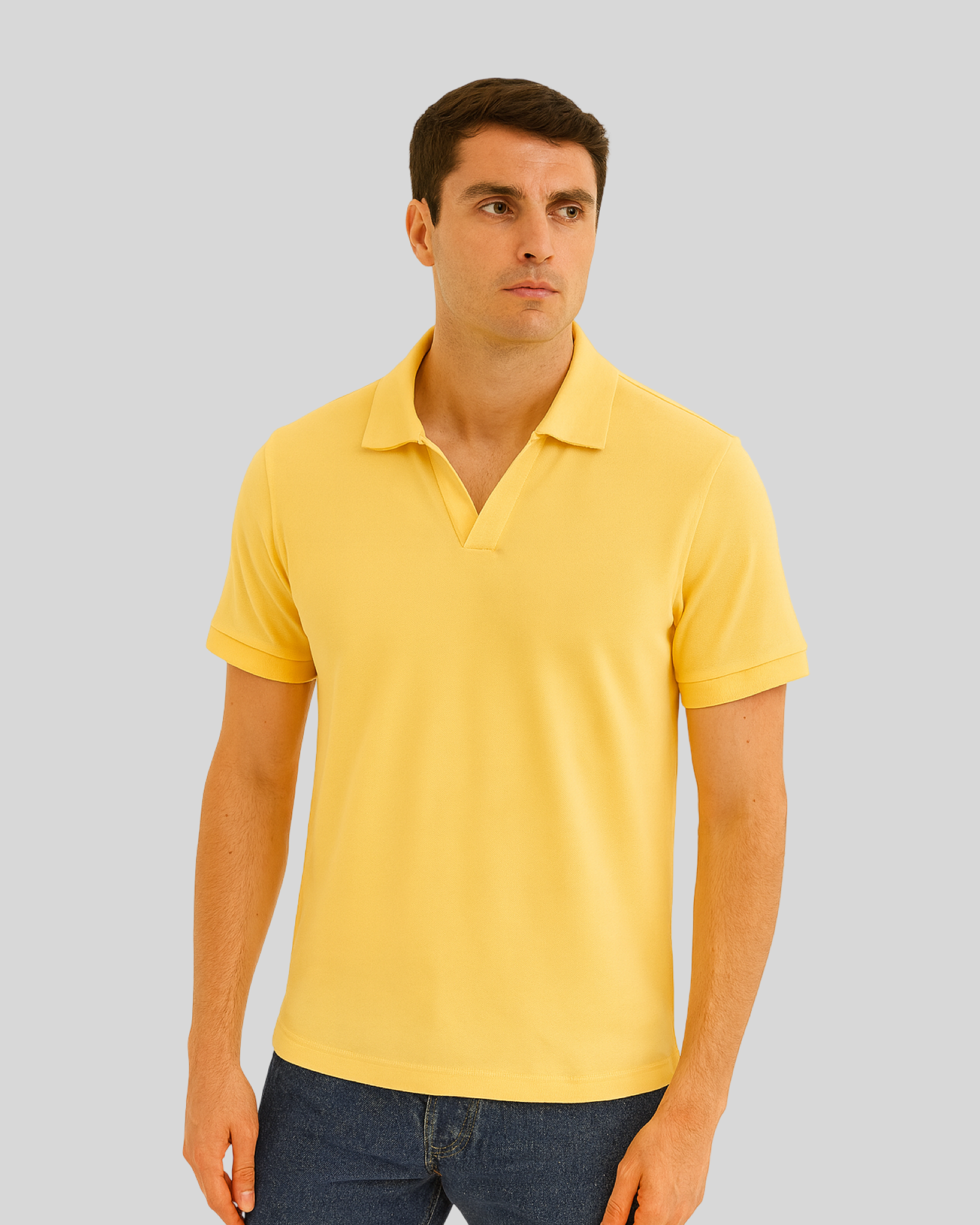- Collar: Classic polo collar with a modern open V-notch placket (no buttons).