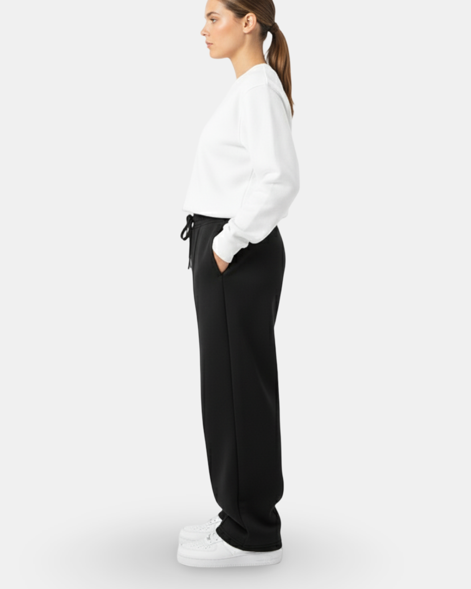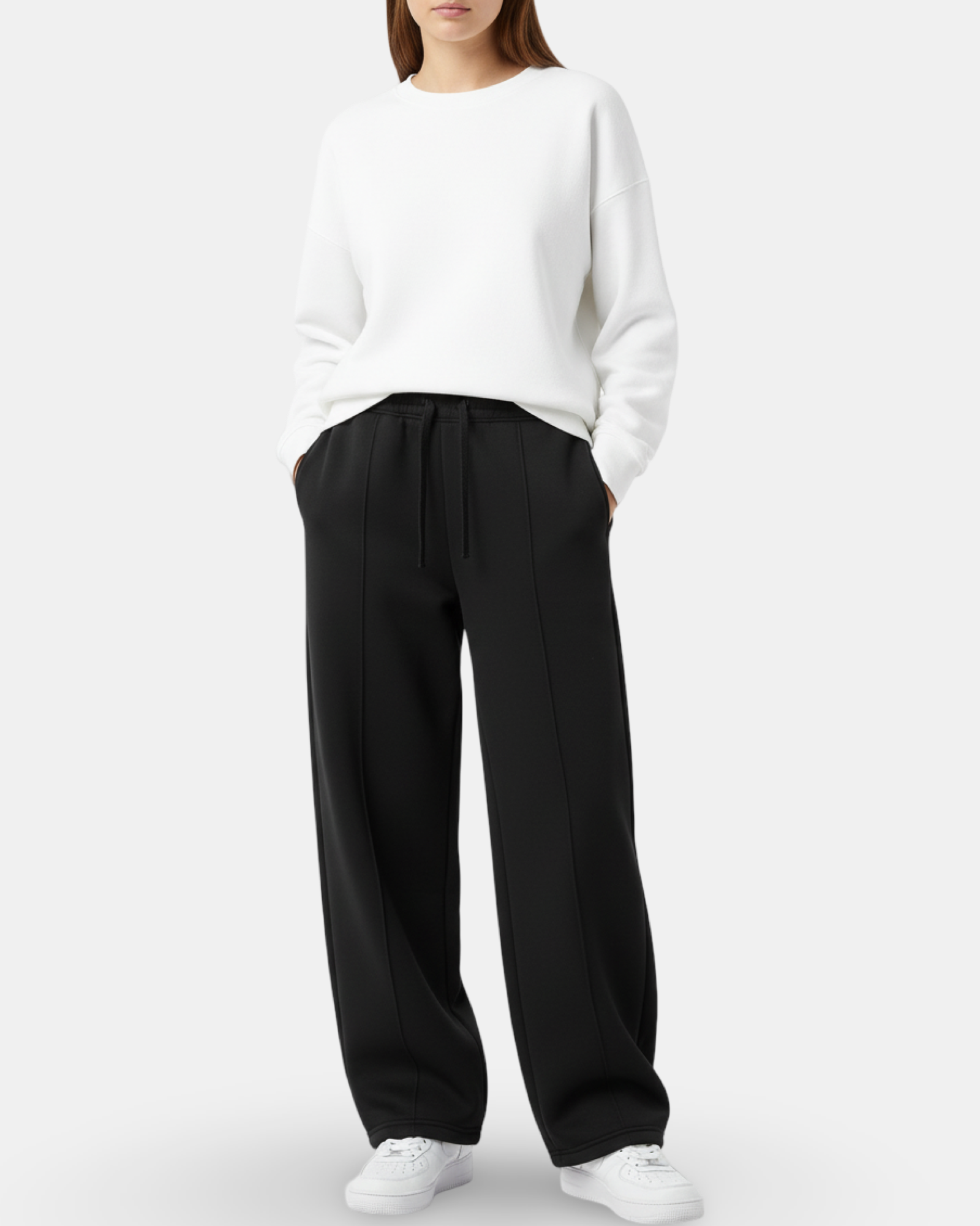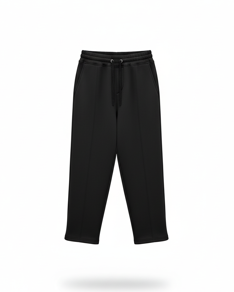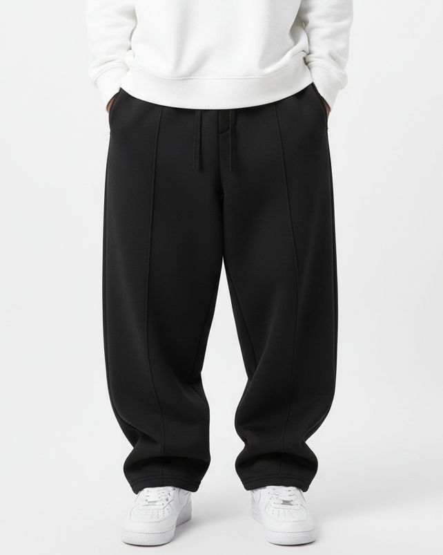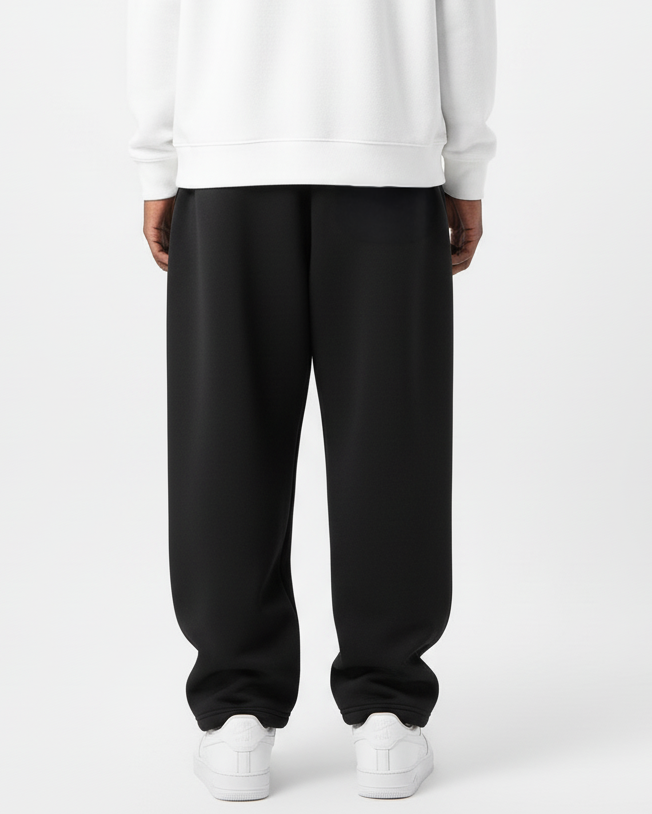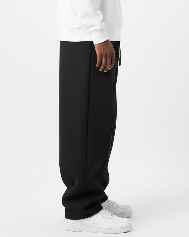 These wide-leg black trousers combine modern streetwear aesthetics with everyday comfort. Designed with a relaxed fit, they feature an elasticated waistband with adjustable drawstrings for a secure yet flexible fit. The clean front seam detail elongates the silhouette, while the soft fabric drapes naturally for a stylish and effortless look. Perfect for casual outings or elevated loungewear, these pants strike a balance between comfort and sophistication.