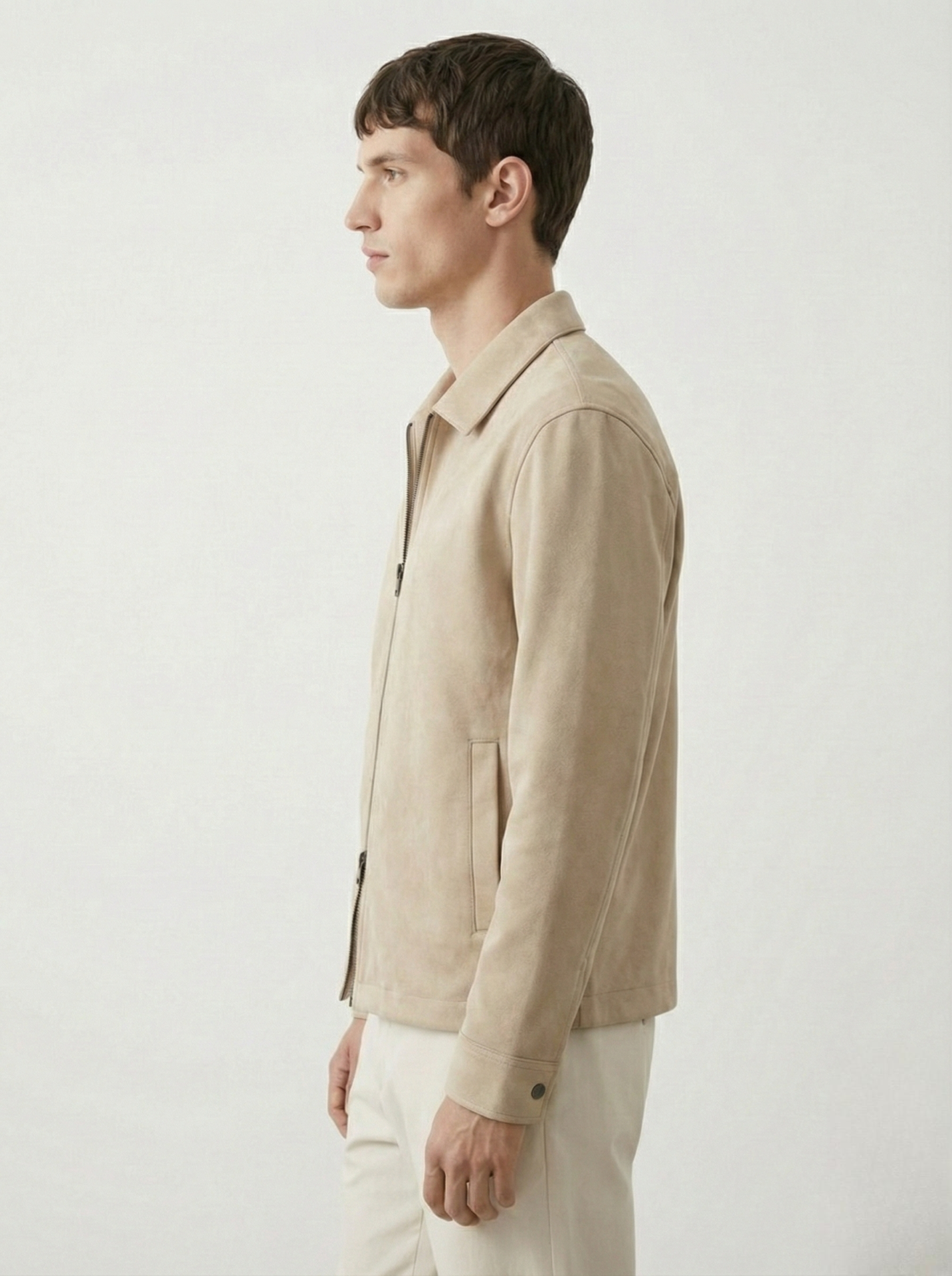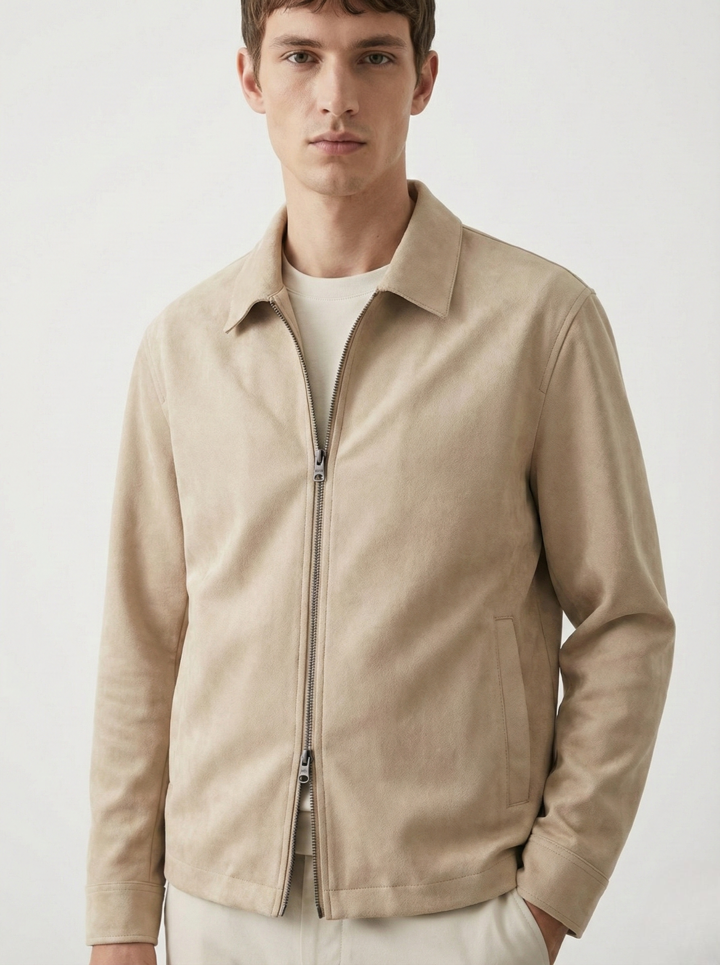 Crafted with a refined suede-touch finish, this Sand Beige zip overshirt is designed to balance structure and softness in one elevated essential. The clean silhouette and minimal detailing give it a versatile character—easy to layer over a tee or lightweight knit, and polished enough to stand alone.