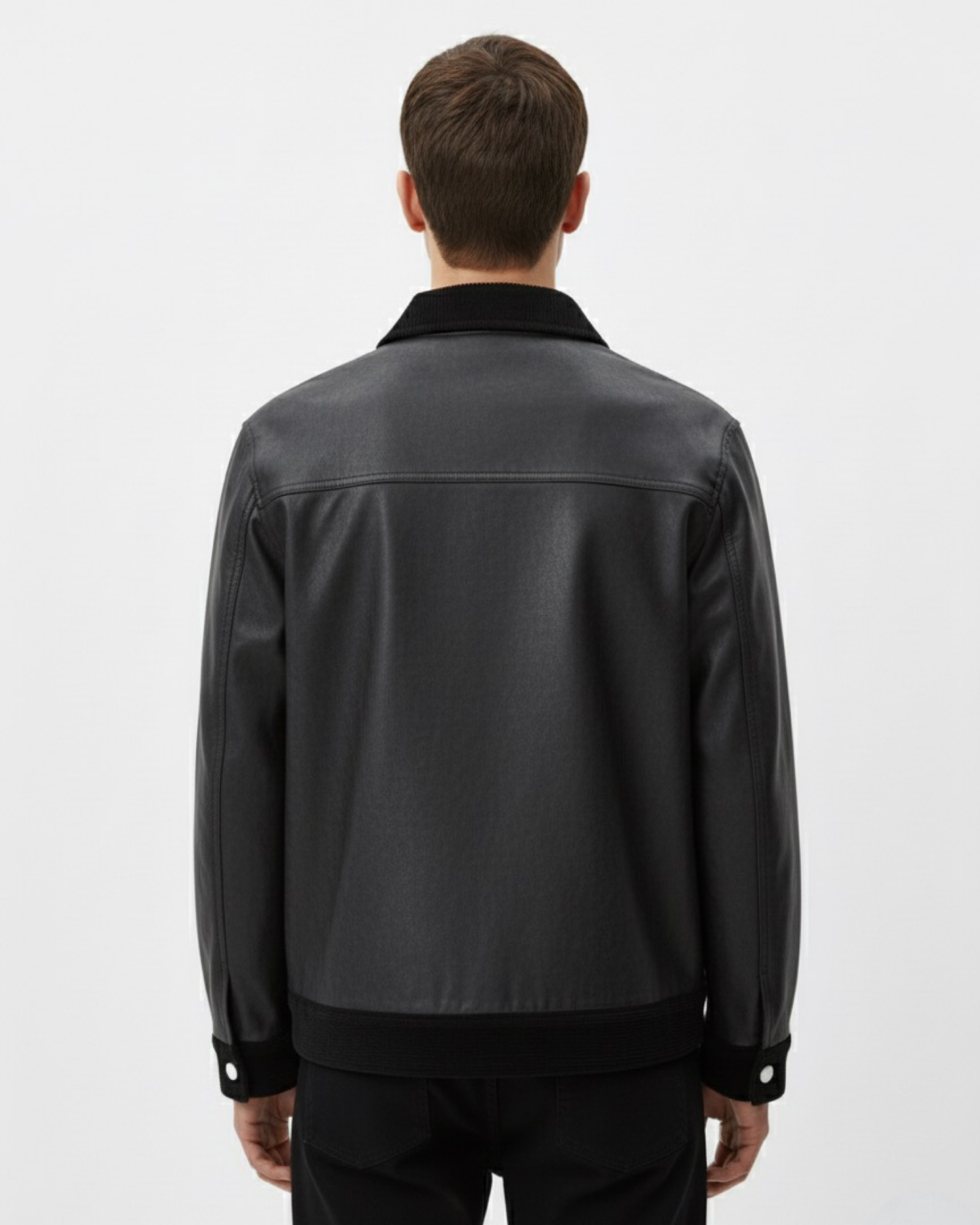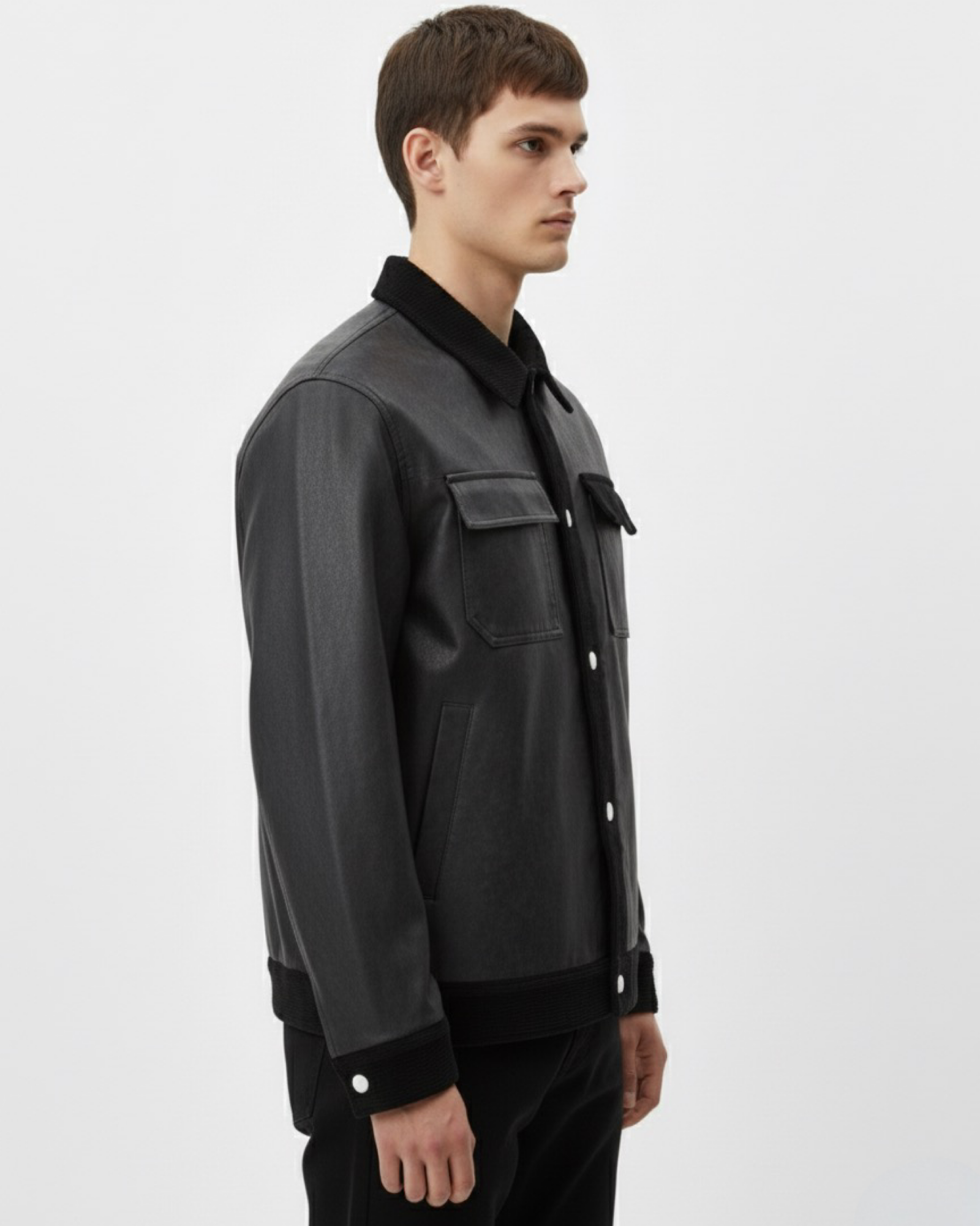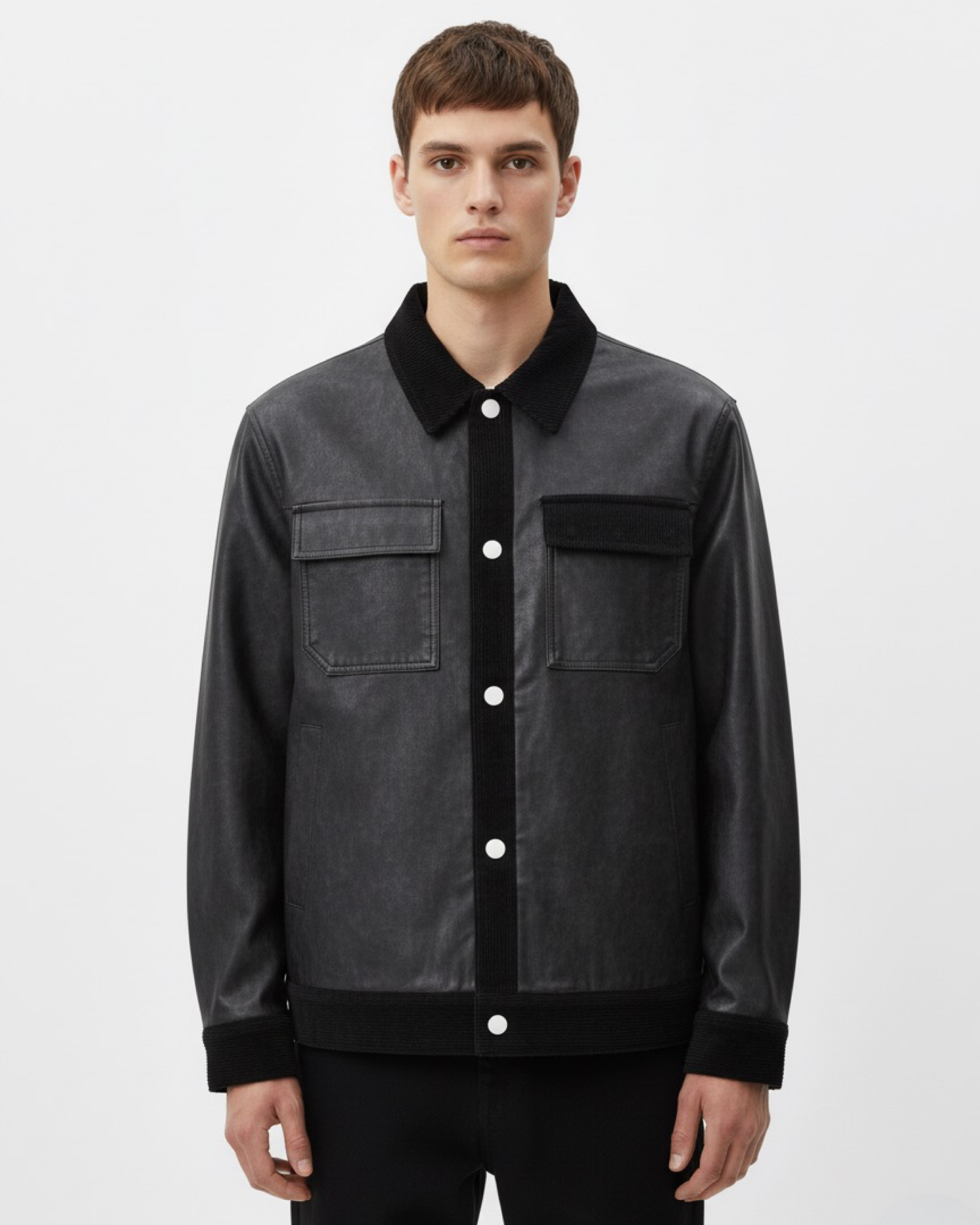 Elevate your outerwear with this Black Contrast-Trim Suede Jacket — a refined piece that blends modern sophistication with utility-inspired details. Crafted from premium suede, it features bold contrast trims that highlight the collar, placket, and hem, giving the jacket a distinctive edge. Perfect for layering, this versatile design transitions seamlessly from casual days to smart evening looks.