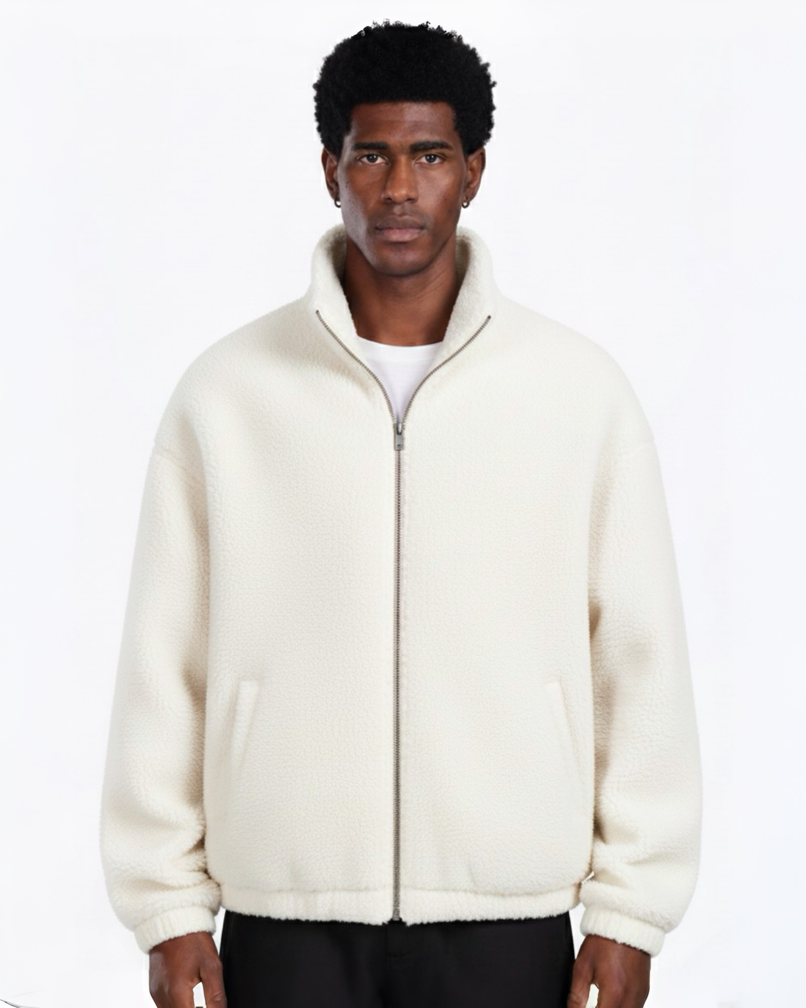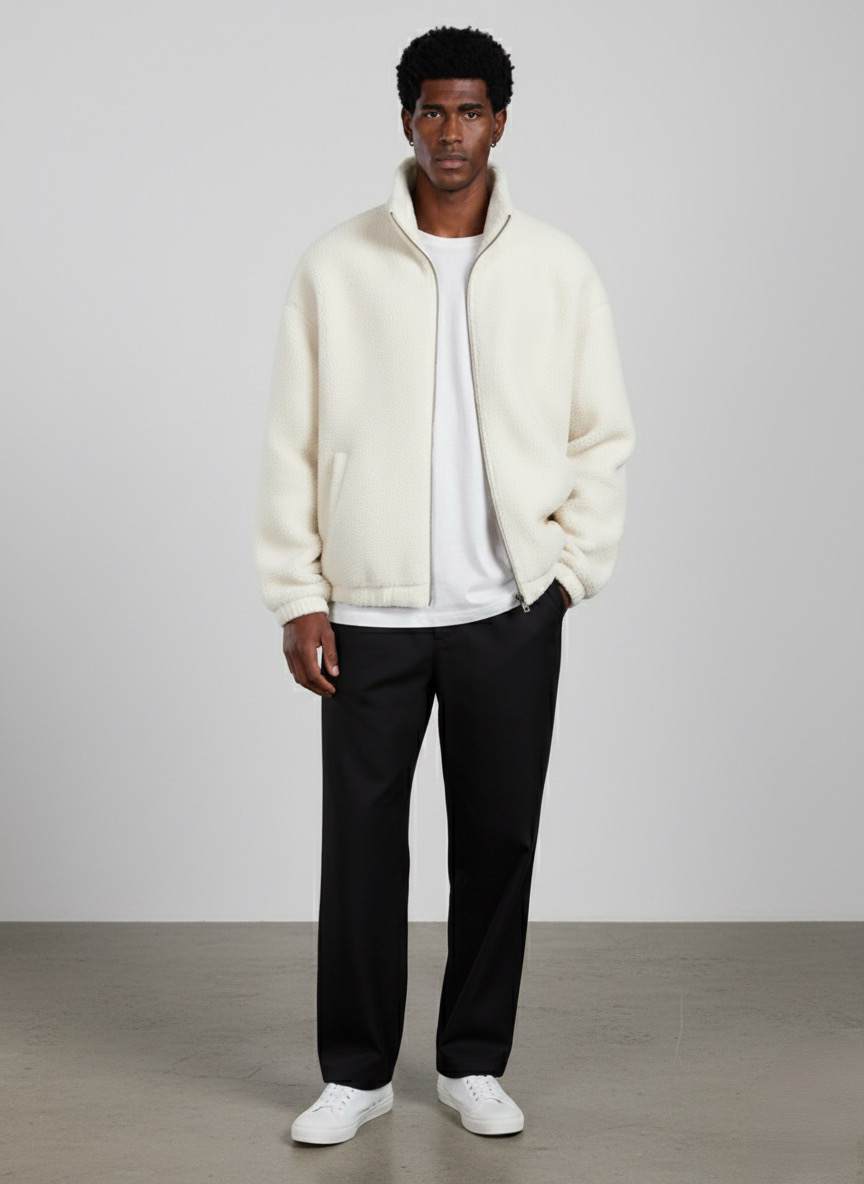 The Ivory Teddy Fleece Zip Jacket blends refined minimalism with ultimate comfort. Crafted from ultra-soft teddy fleece, it delivers warmth and sophistication with a clean zip-through design. The ivory tone enhances its versatility — effortlessly pairing with neutral palettes and layered winter looks. Designed for relaxed structure, it’s your go-to piece for modern cold-weather styling.