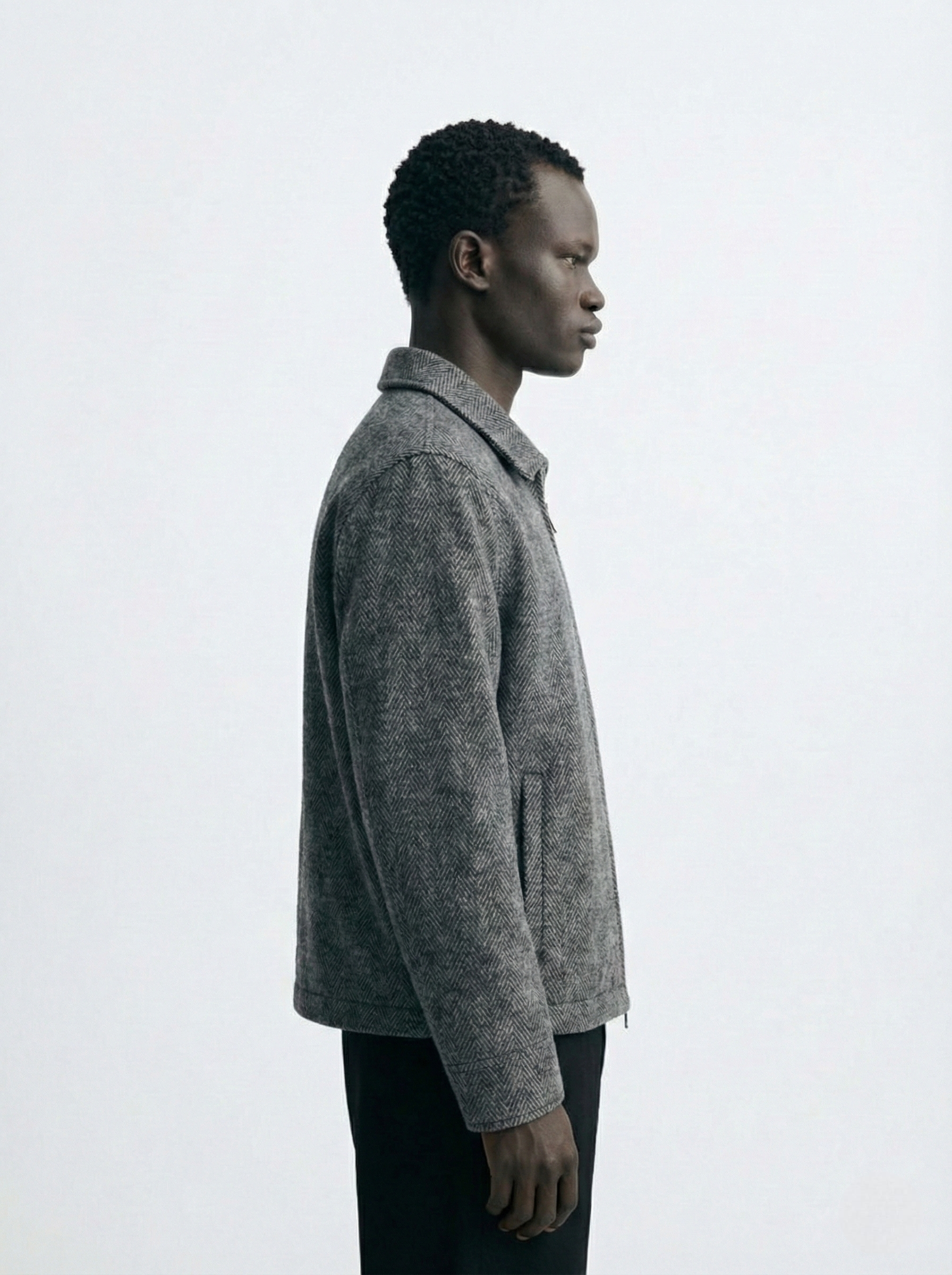 This overshirt is crafted from a premium wool-blend fabric with a classic herringbone weave, offering a structured yet comfortable feel. The clean zip-front closure and minimalist silhouette create a versatile piece that moves seamlessly between casual and elevated styling.
