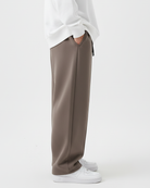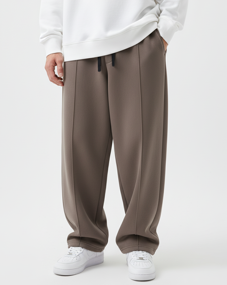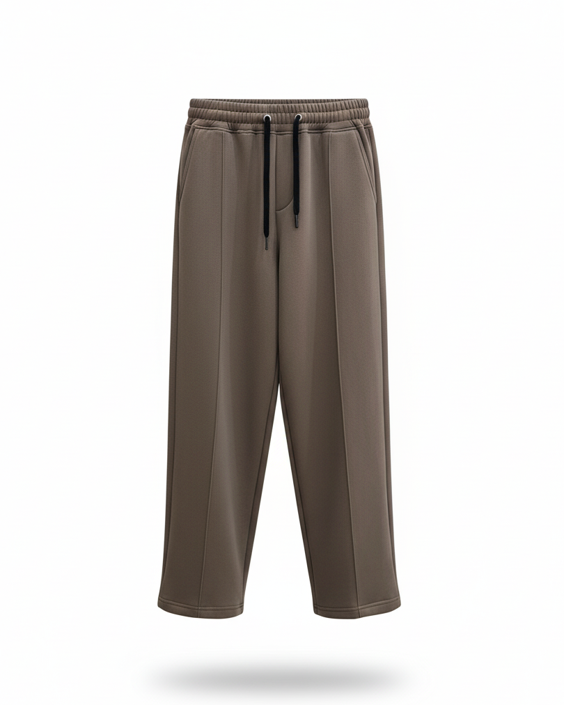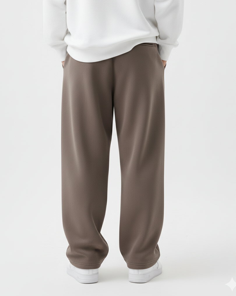 These wide-leg mink brown trousers combine modern streetwear aesthetics with everyday comfort. Designed with a relaxed fit, they feature an elasticated waistband with adjustable drawstrings for a secure yet flexible fit. The clean front seam detail elongates the silhouette, while the soft fabric drapes naturally for a stylish and effortless look. Perfect for casual outings or elevated loungewear, these pants strike a balance between comfort and sophistication.