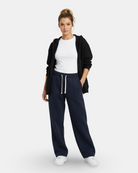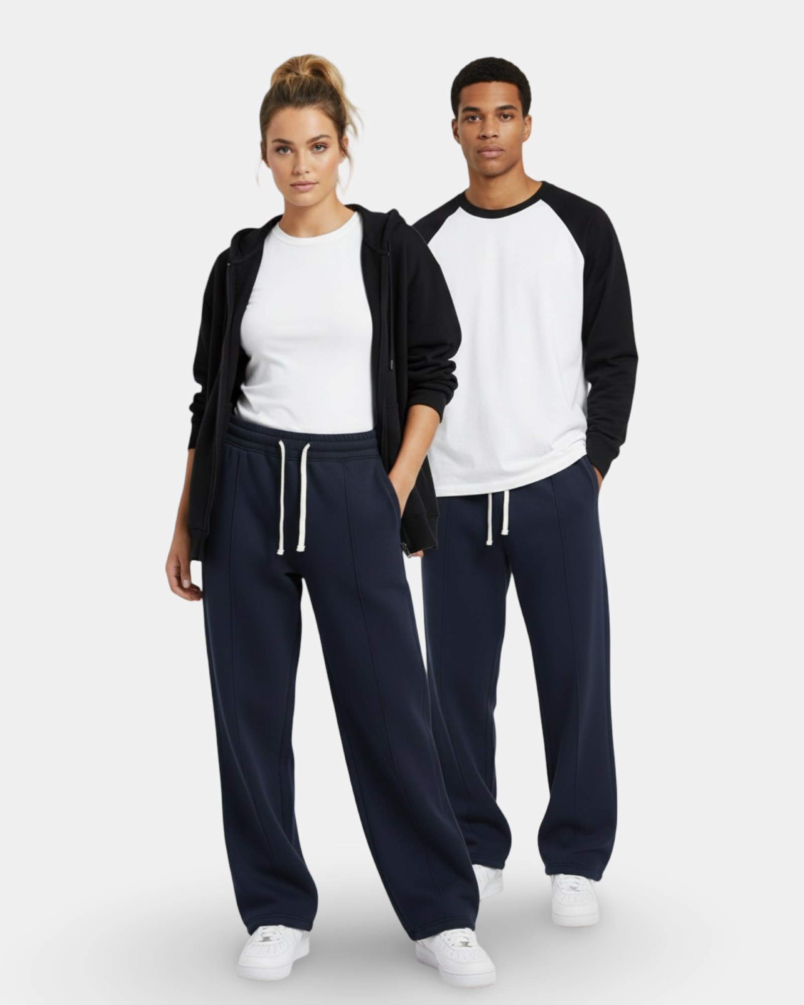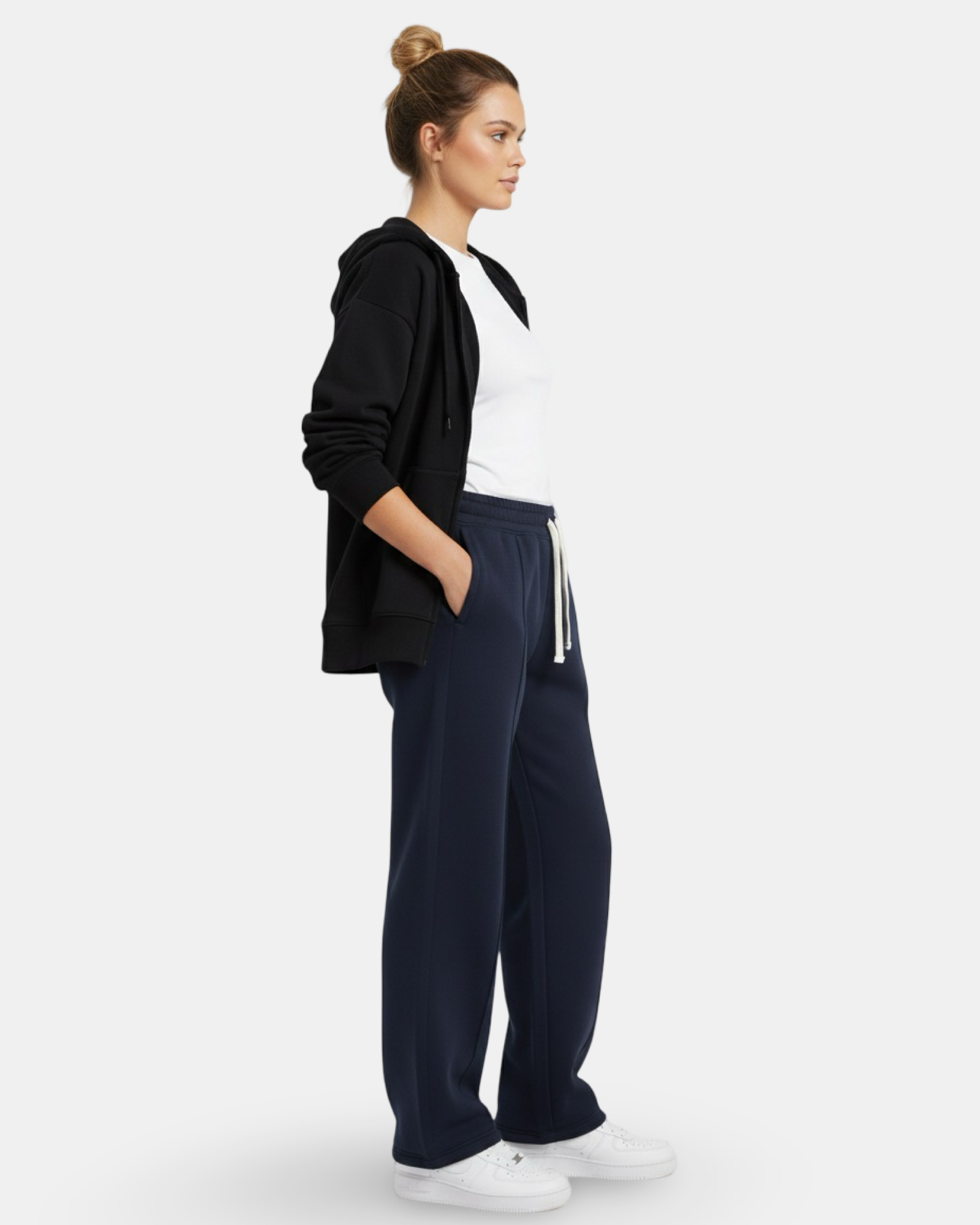These wide-leg navy trousers combine modern streetwear aesthetics with everyday comfort. Designed with a relaxed fit, they feature an elasticated waistband with adjustable drawstrings for a secure yet flexible fit. The clean front seam detail elongates the silhouette, while the soft fabric drapes naturally for a stylish and effortless look. Perfect for casual outings or elevated loungewear, these pants strike a balance between comfort and sophistication.