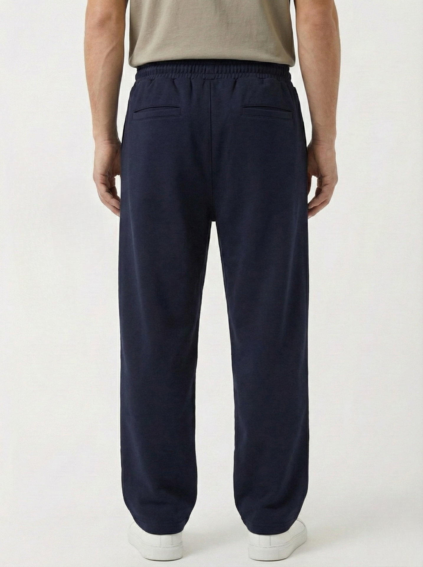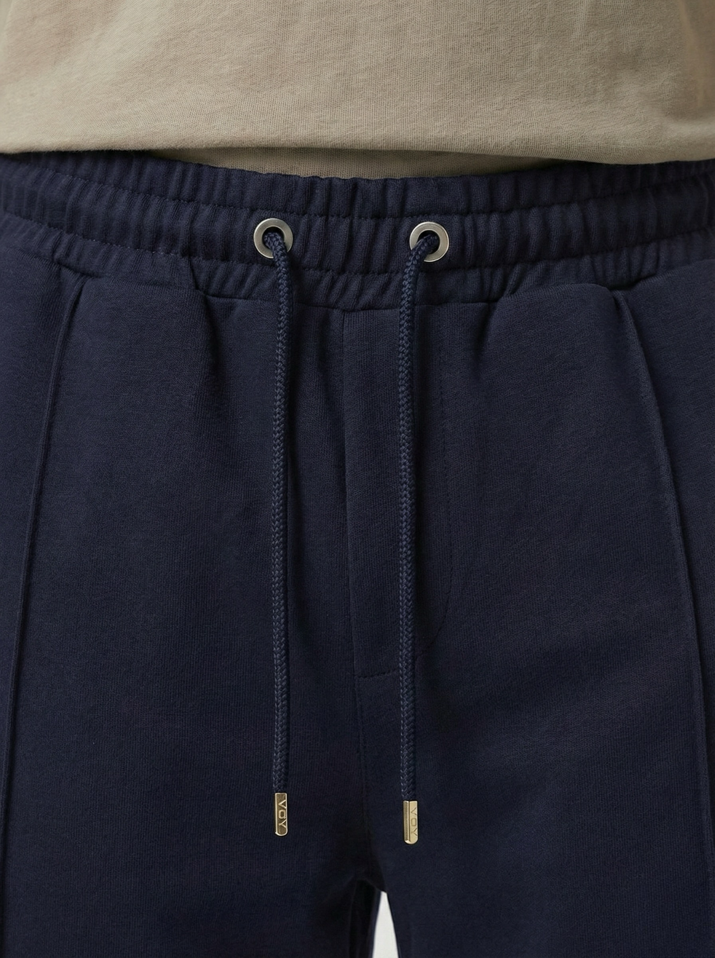 Finished with an elastic waistband and matching navy drawstrings with metal tips for a sleek, minimal aesthetic.