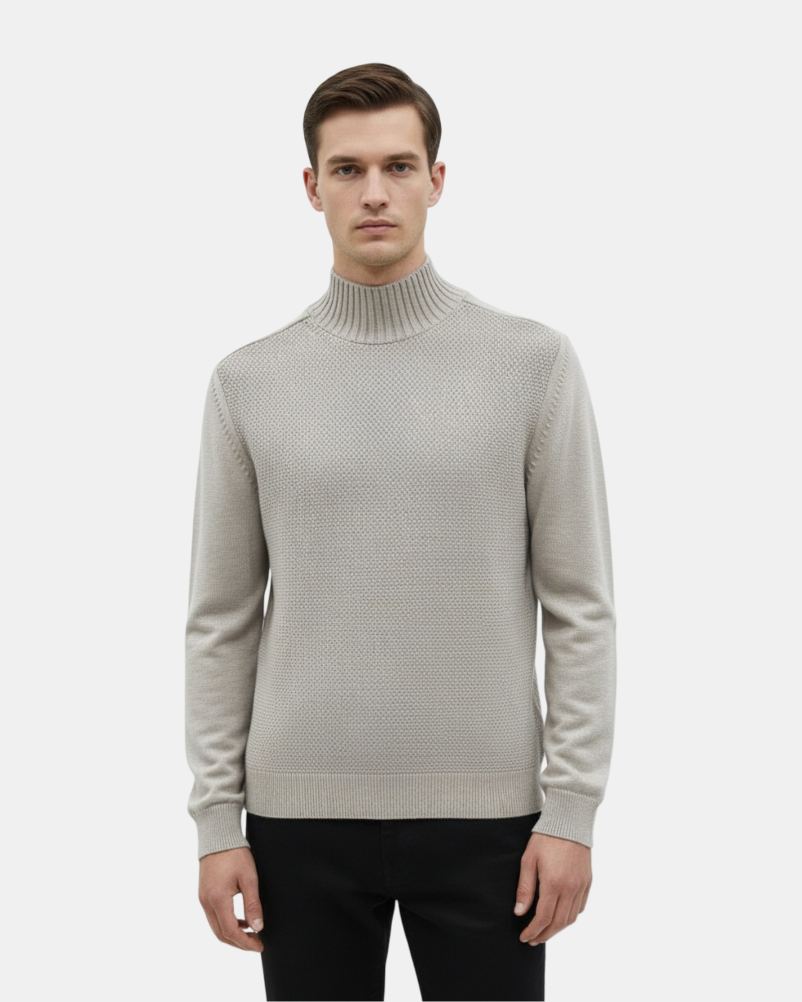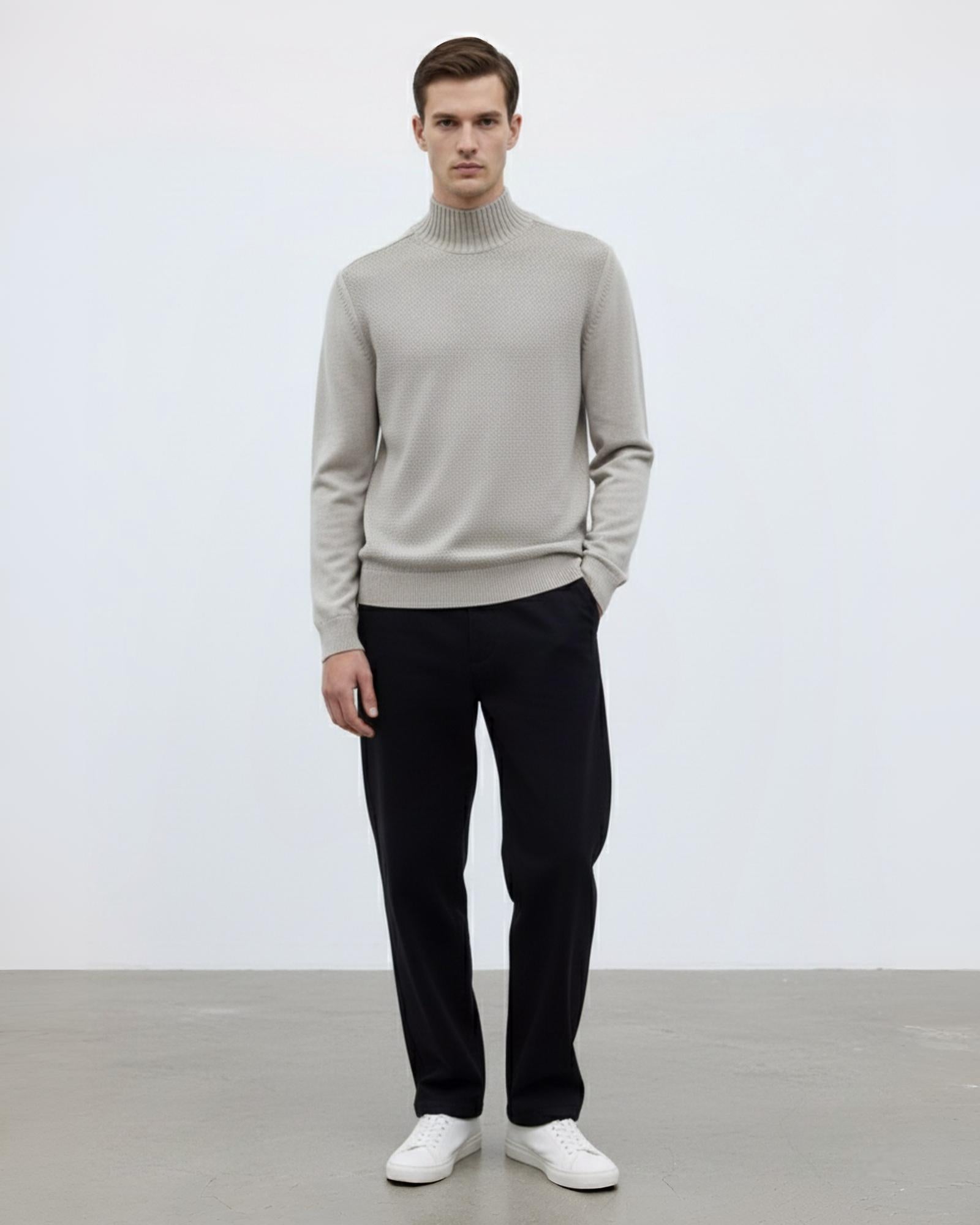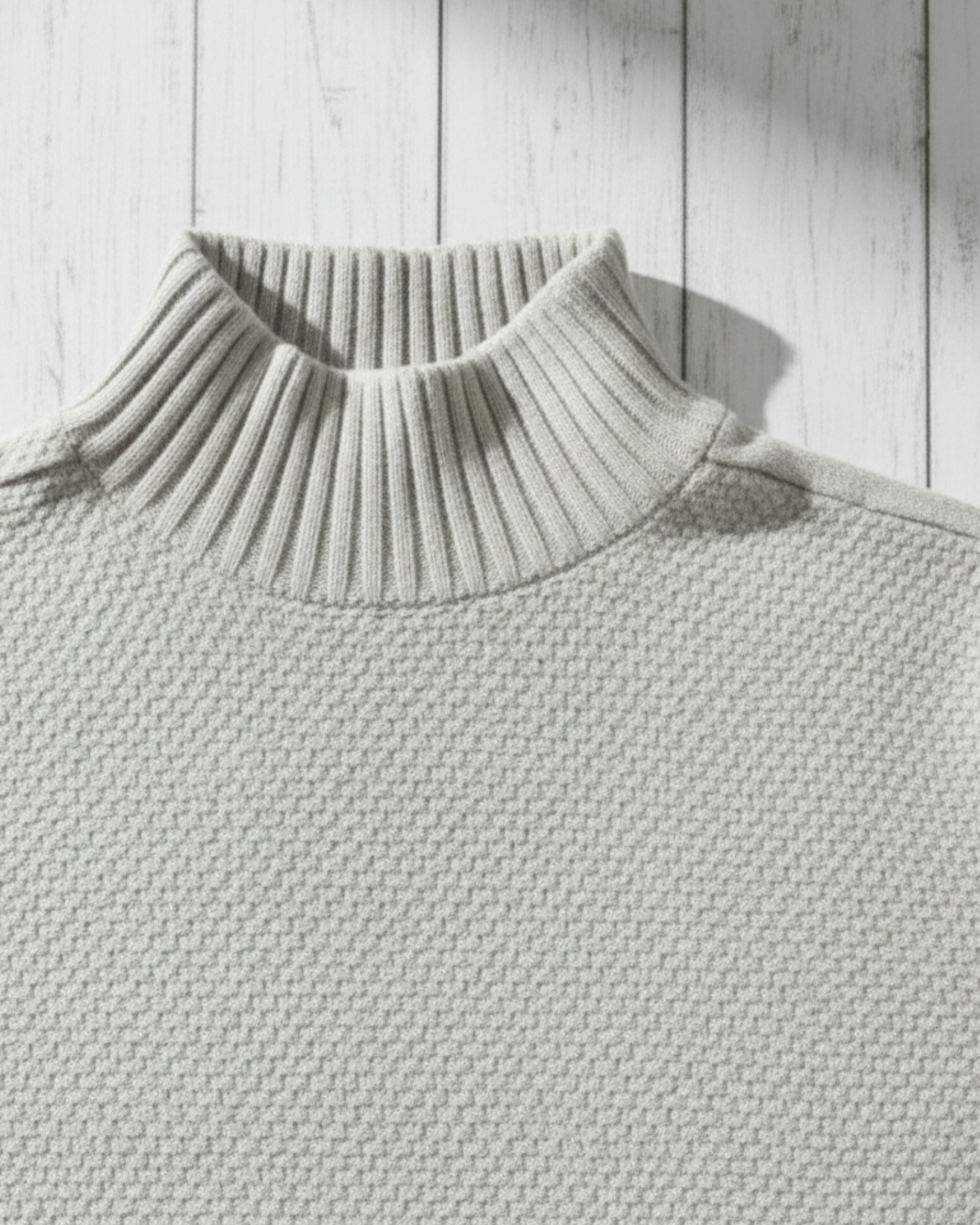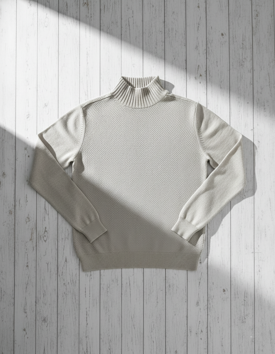 The Dune Micro-Texture Turtleneck features a delicate knit structure with a soft sand-tone hue and a distinctive micro-pattern surface.